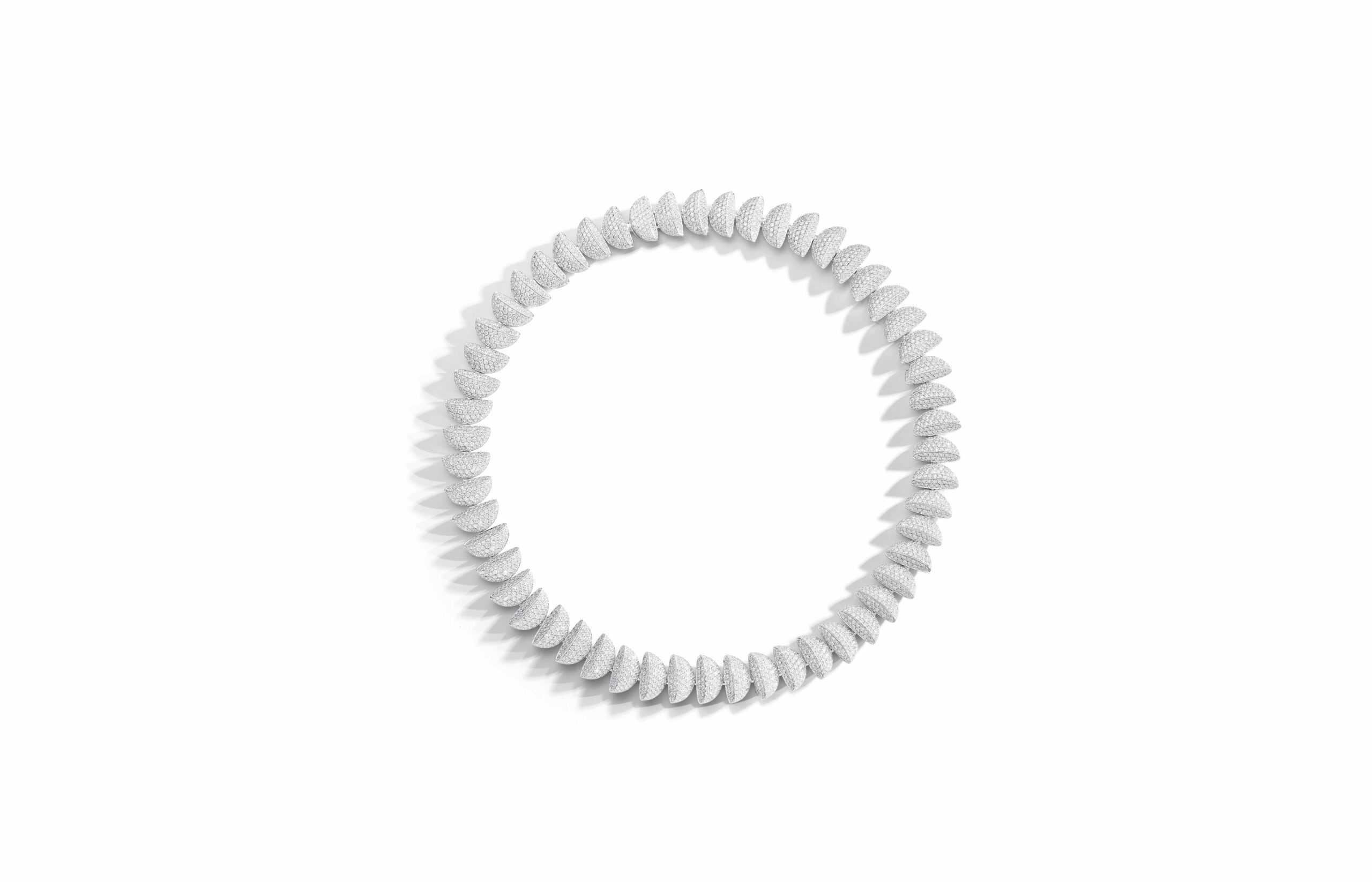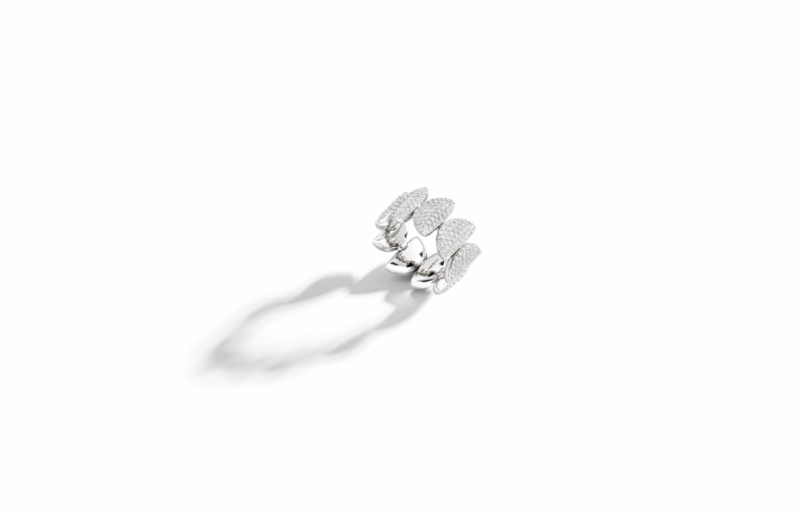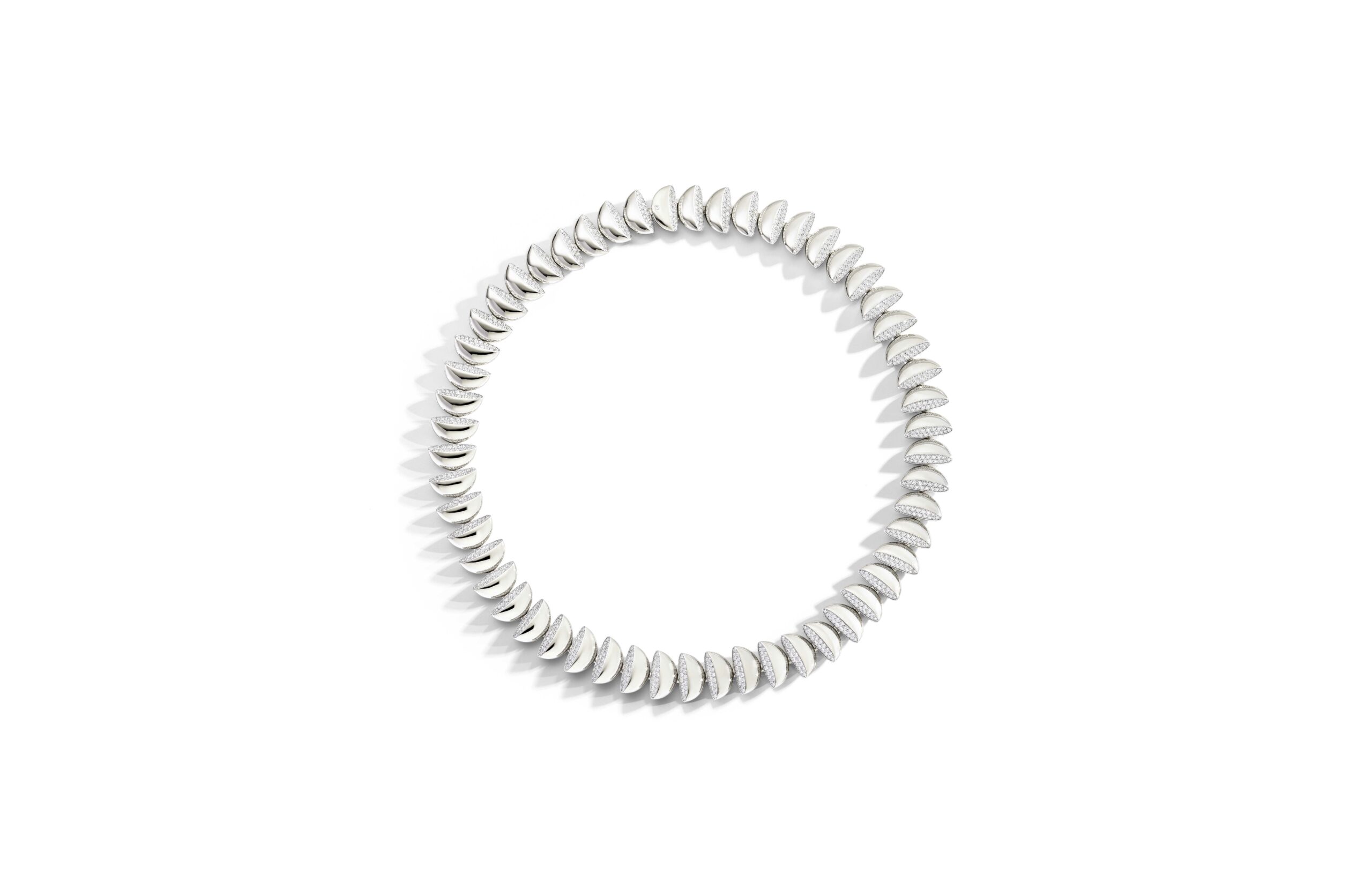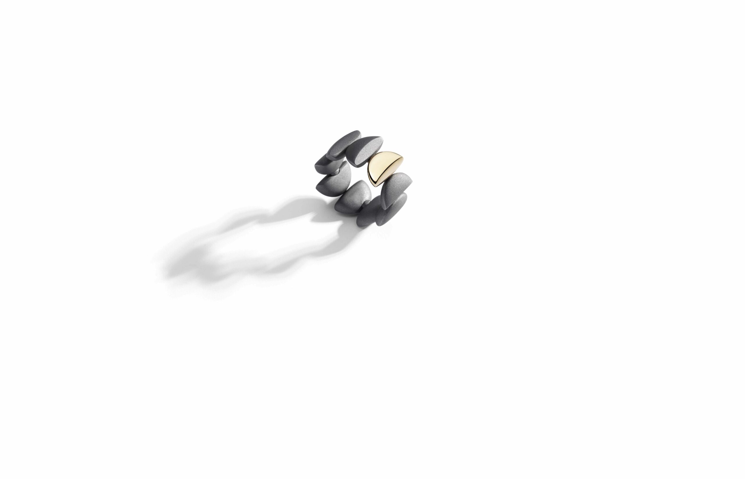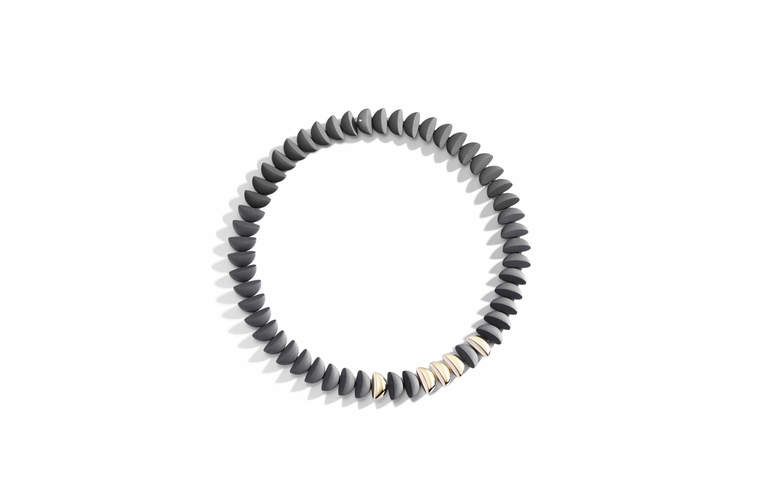 L’or rose 18 carats, symbole de douceur et de féminité, se façonne en bagues, bracelets, colliers et boucles d’oreilles. À cela s’ajoute le titane, élément de modernité et de robustesse, et l’or blanc, écrin lumineux pour les diamants éclatants qui viennent parfaire l’ensemble. Vhernier présente ici un dialogue entre la chaleur de l’or et la fraîcheur du métal, entre la douceur des formes et la précision des lignes.