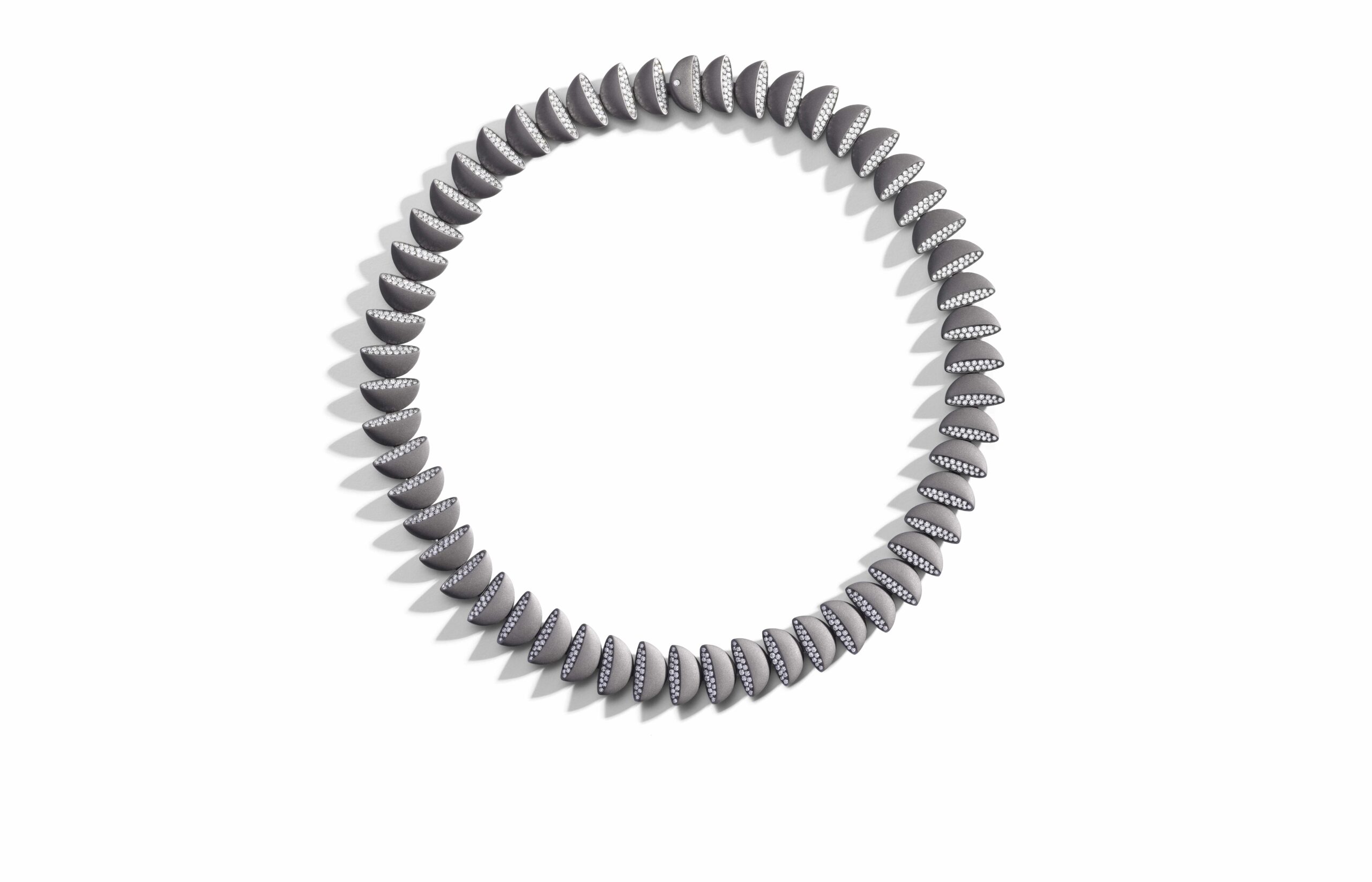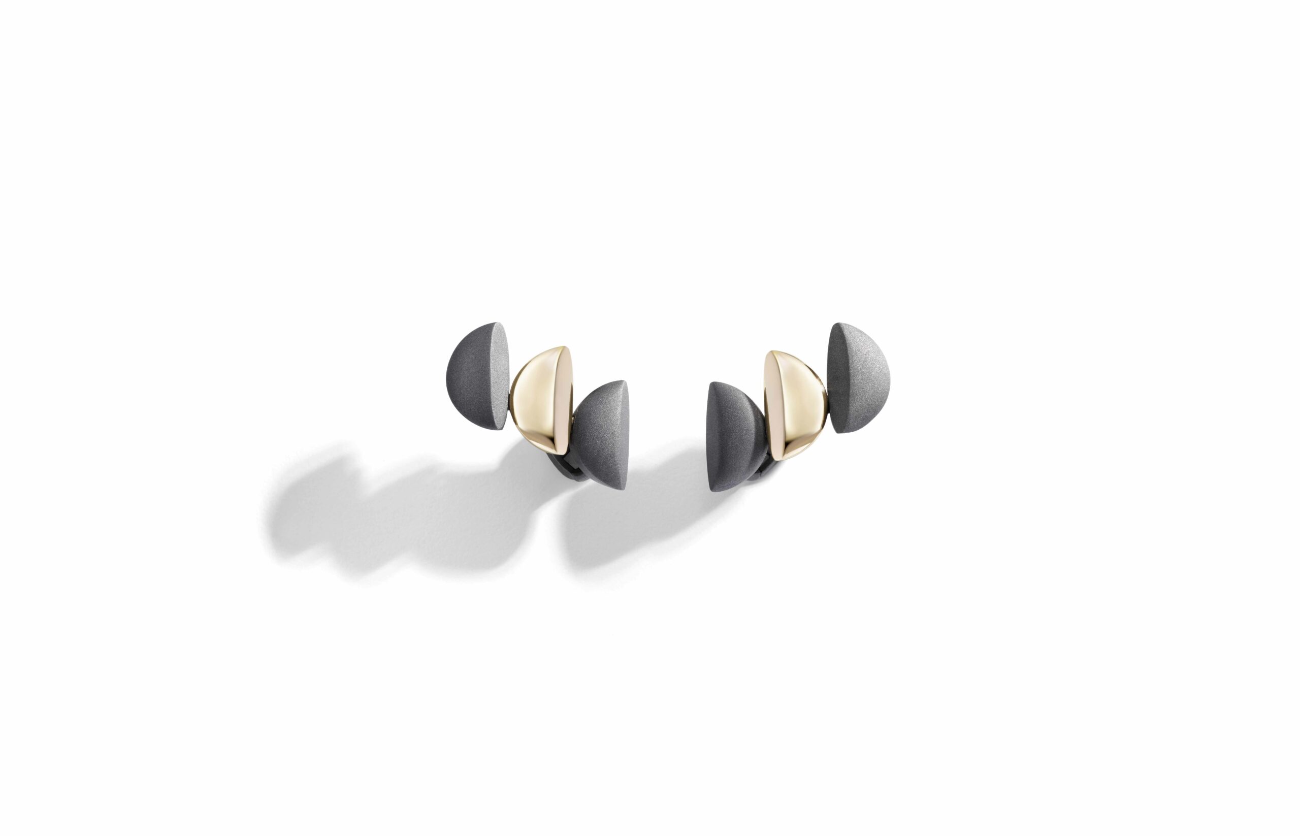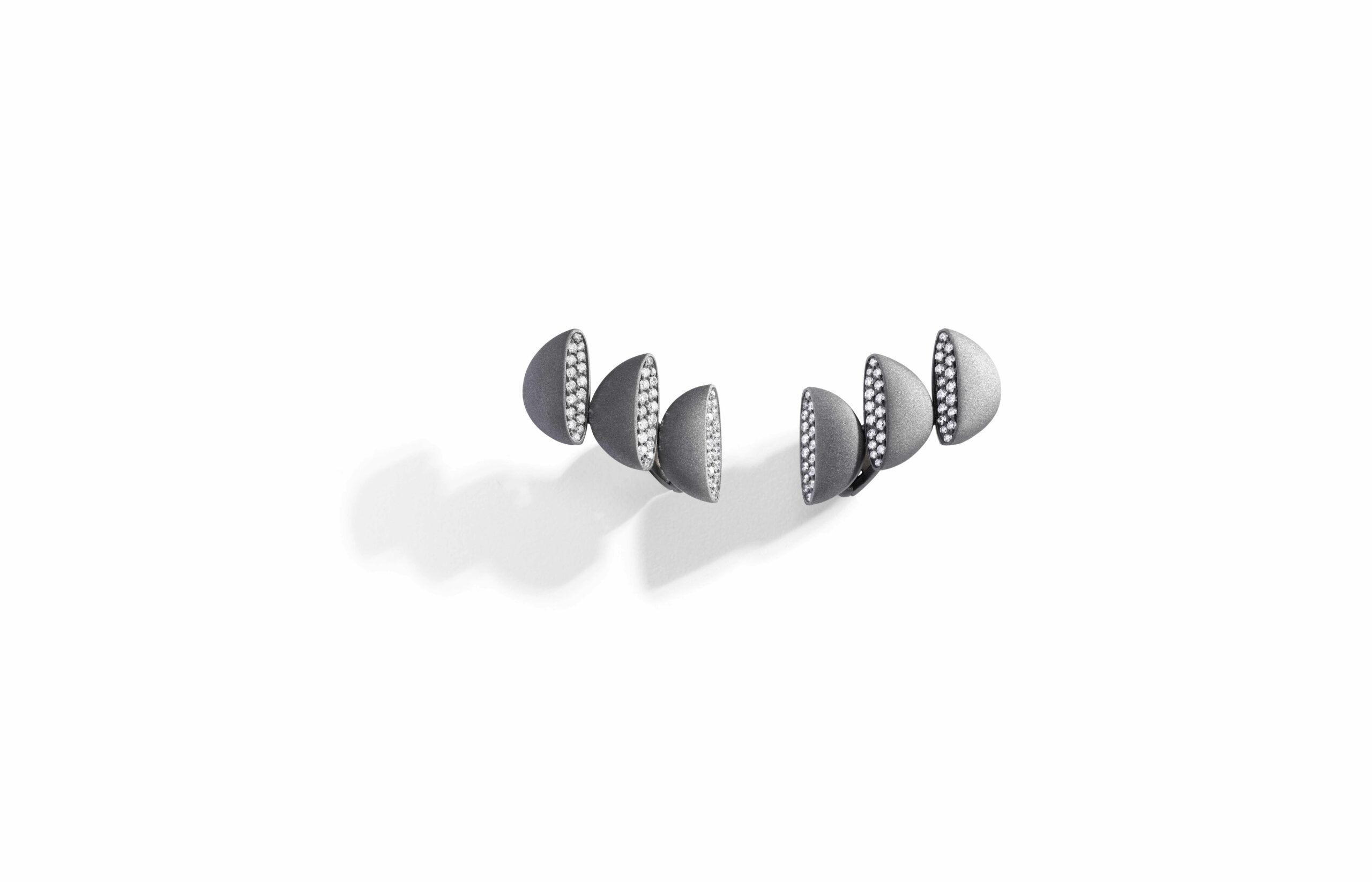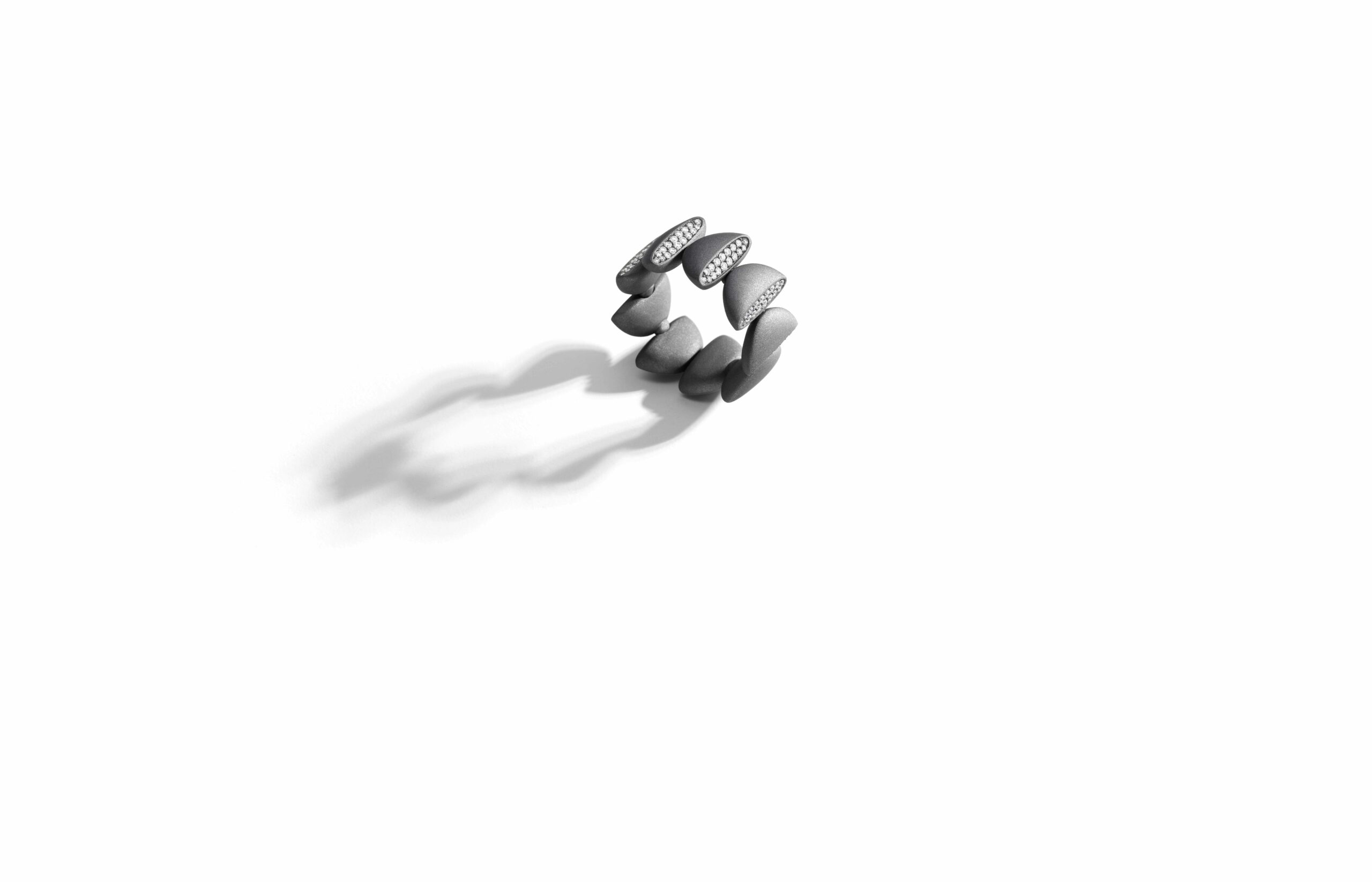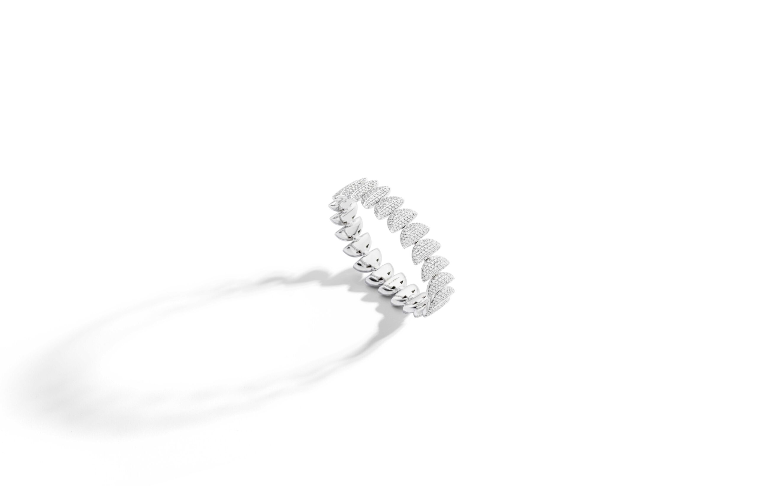 L’or rose 18 carats, symbole de douceur et de féminité, se façonne en bagues, bracelets, colliers et boucles d’oreilles. À cela s’ajoute le titane, élément de modernité et de robustesse, et l’or blanc, écrin lumineux pour les diamants éclatants qui viennent parfaire l’ensemble. Vhernier présente ici un dialogue entre la chaleur de l’or et la fraîcheur du métal, entre la douceur des formes et la précision des lignes.