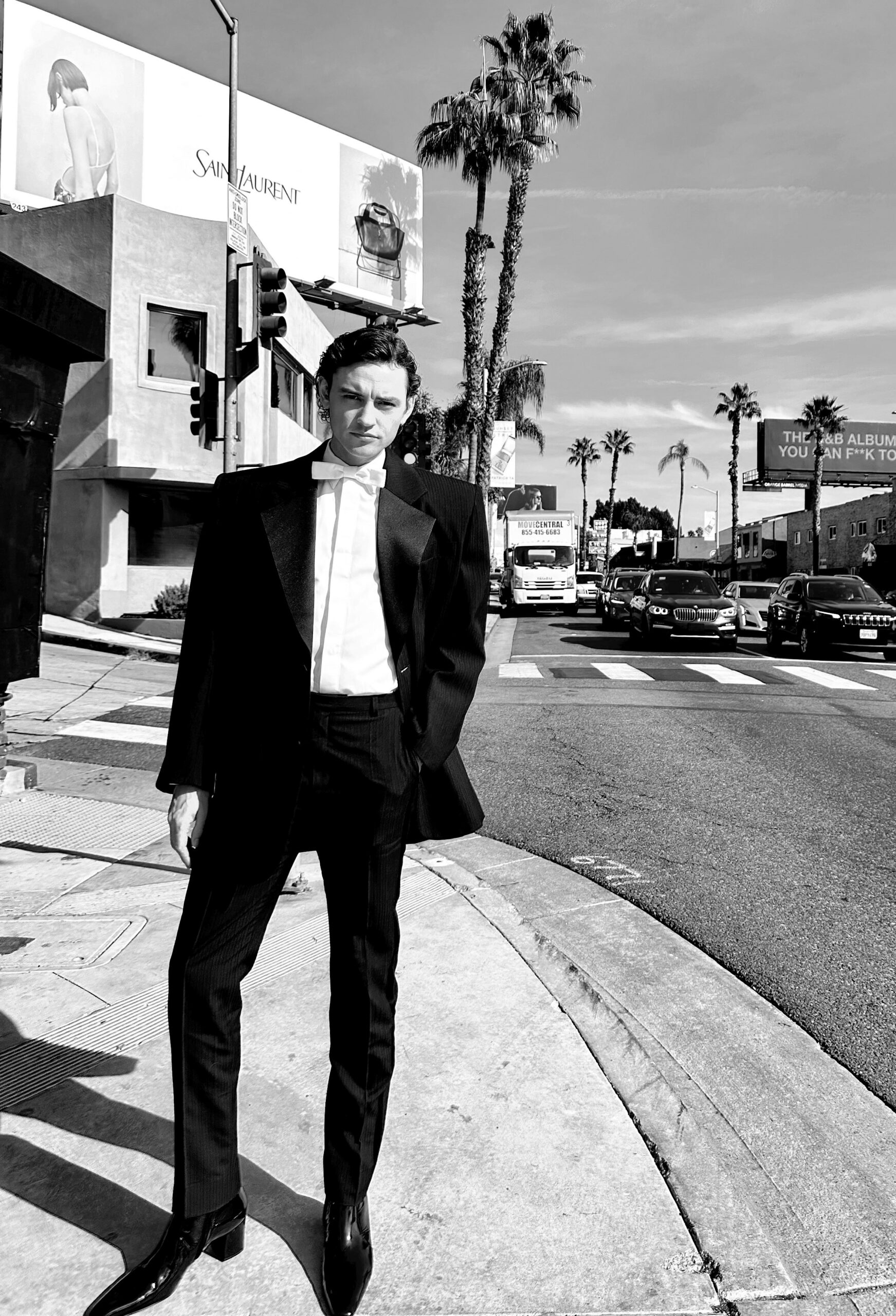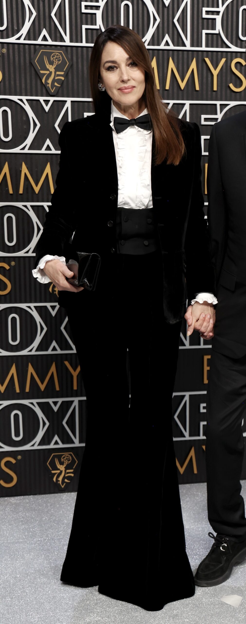 Monica Bellucci a incarné l’élégance intemporelle en Saint Laurent, optant pour une veste courte à simple boutonnage en velours cupro, assortie à une chemise à volants en popeline de coton, un nœud papillon Yves en satin de soie noir, un gilet de smoking en grain de poudre et un pantalon évasé en velours cupro. Les sandales plateformes Jodie en cuir verni ont complété son allure sophistiquée.