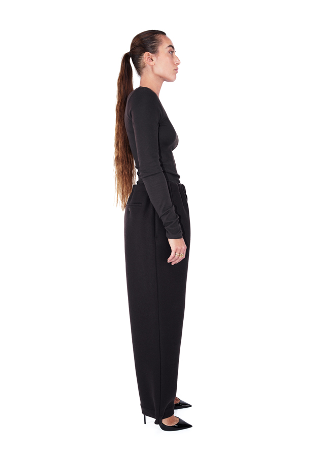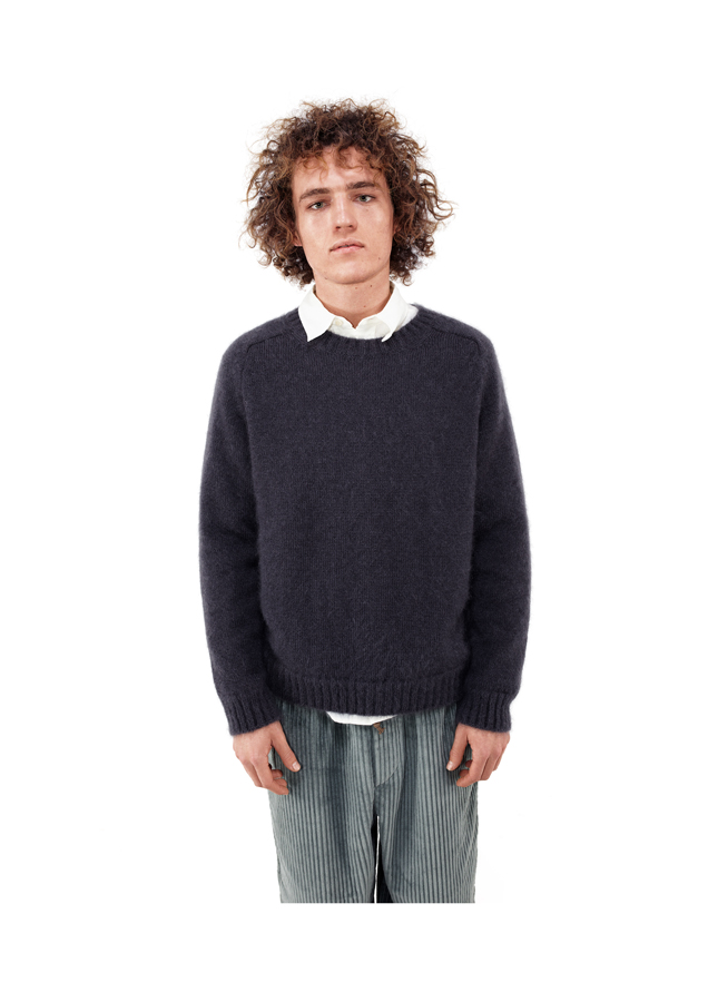 La sélection de tricots souligne également le luxe à travers le choix des tissus et des proportions justes. Des pièces comme le col châle en cachemire épais et le pull à col rond en cachemire avec manches raglan, désormais disponibles en mohair et en laine mérinos, sont subtilement luxueuses. La gamme en cachemire feutré s’élargit avec un pull à col rond à torsades et une robe à col roulé noire.