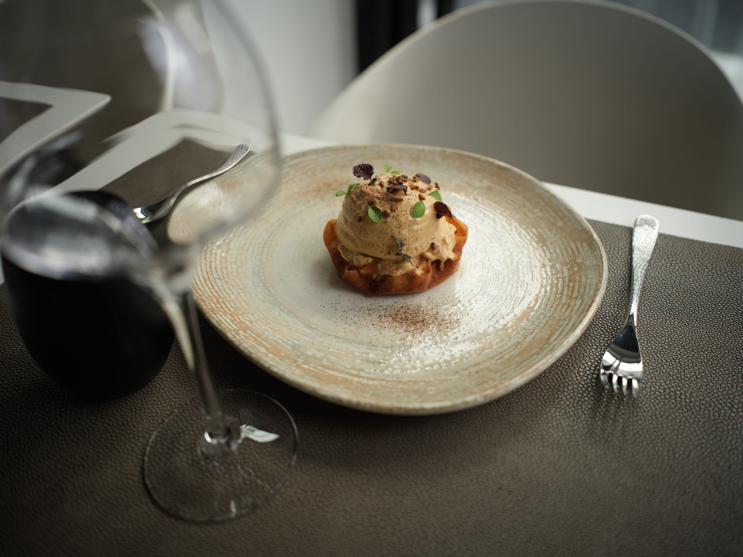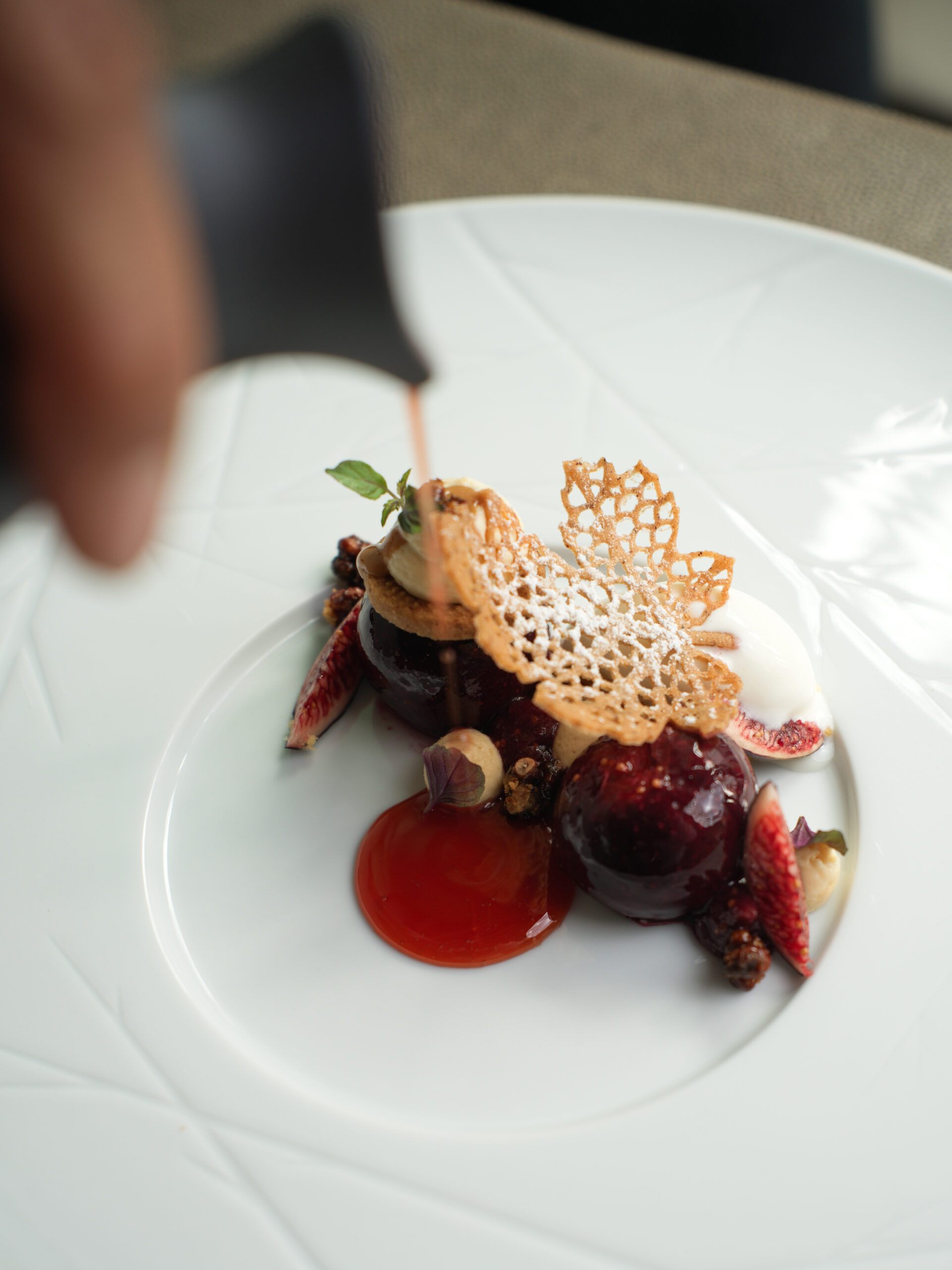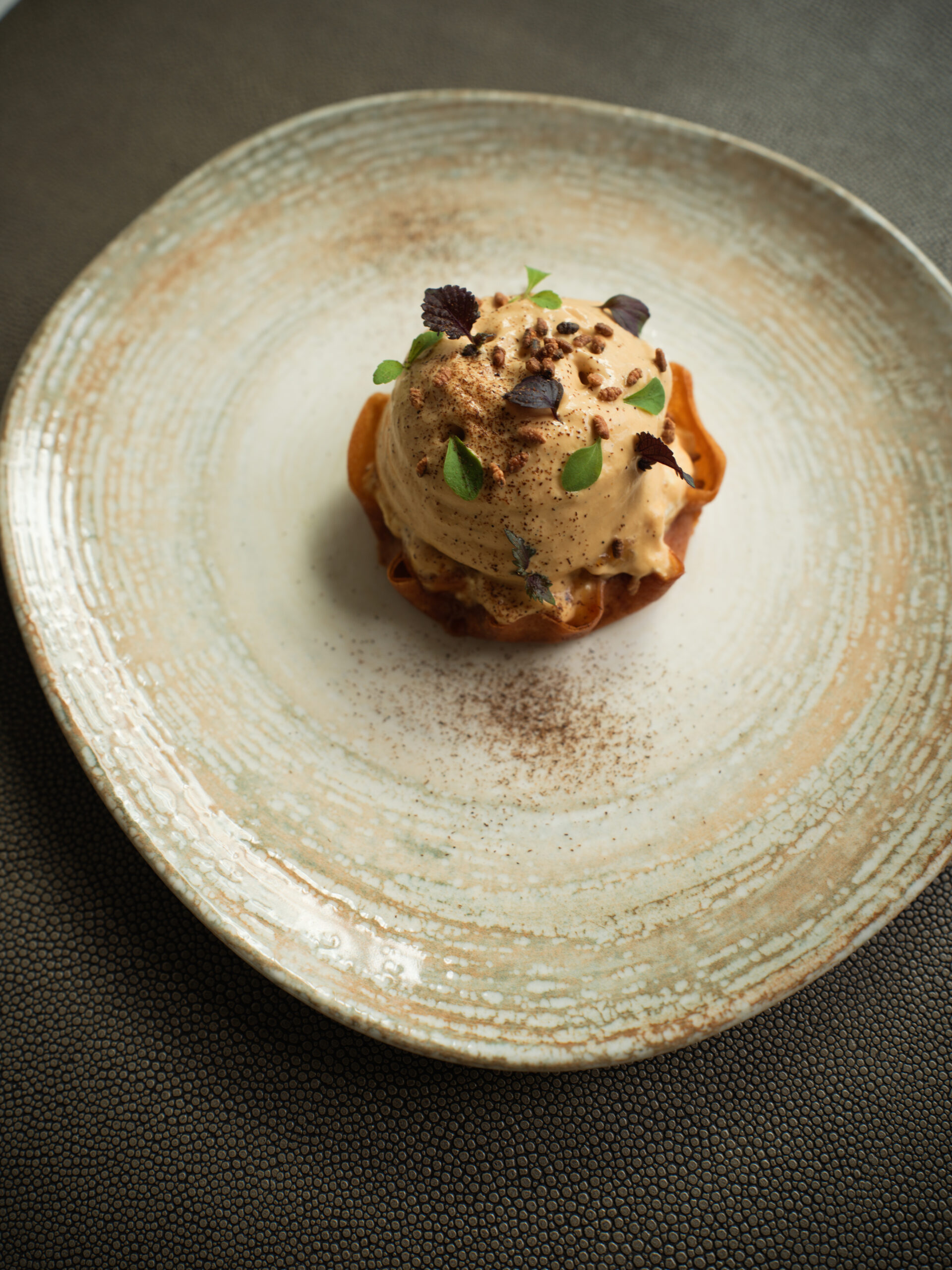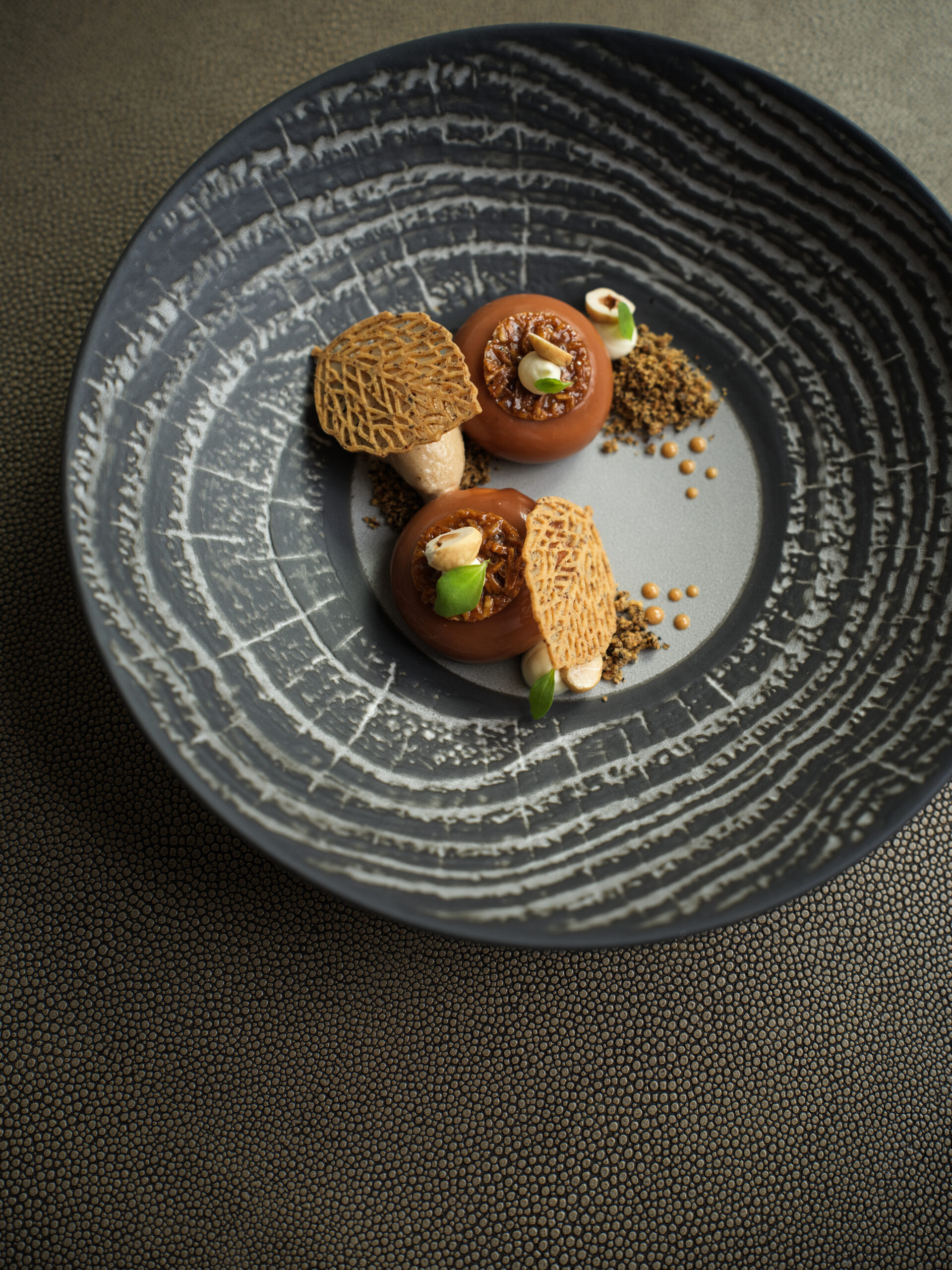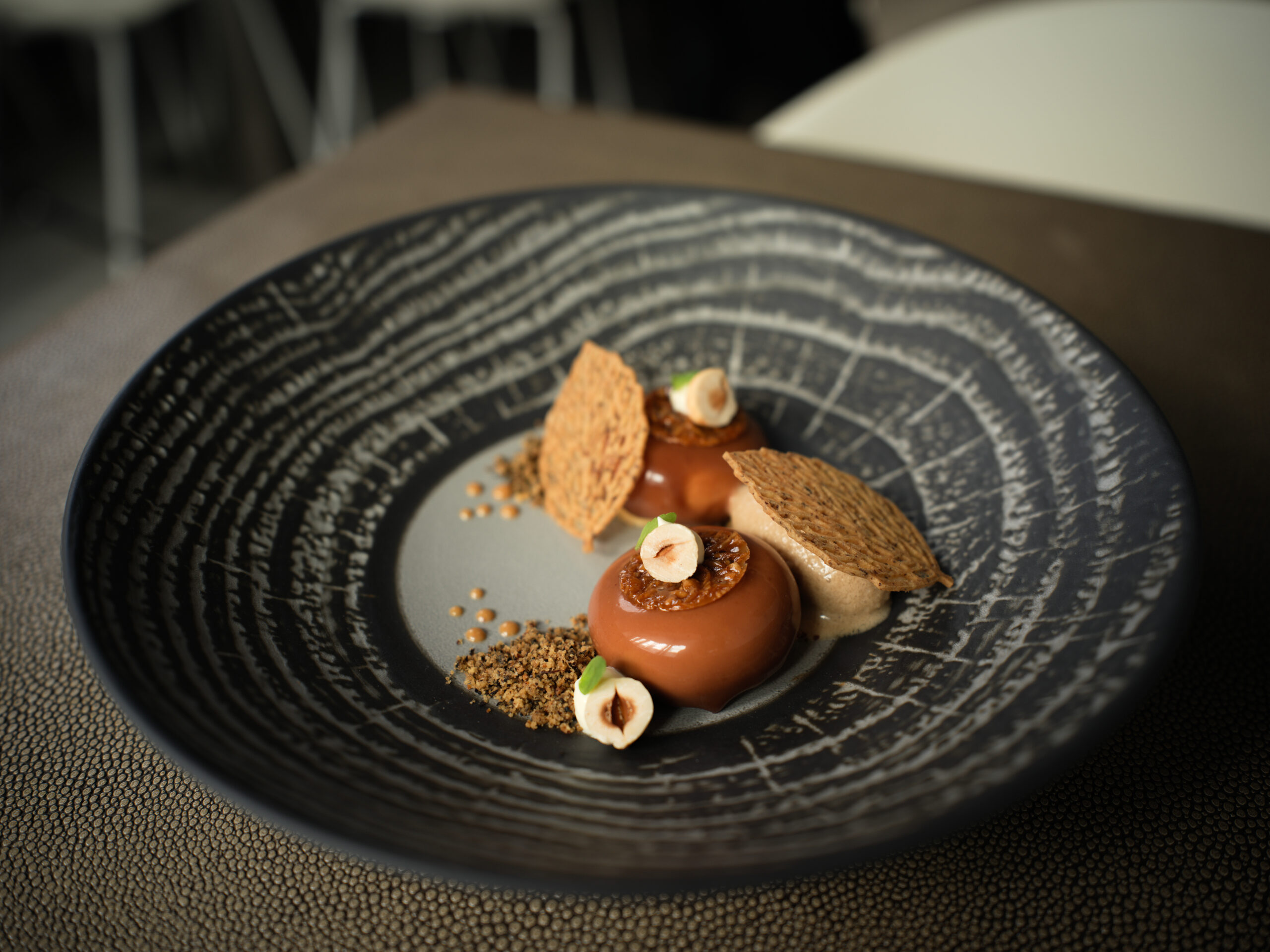 Les desserts signés Kinoshita sont de véritables tableaux gustatifs, où chaque ingrédient est mis en valeur. La noisette, le citron noir, le riz au lait rehaussé de banane et de caramel, ou encore l’alliance chocolat-café-mascarpone, sont autant d’exemples de son talent pour créer des desserts qui concluent le repas sur une note inoubliable.