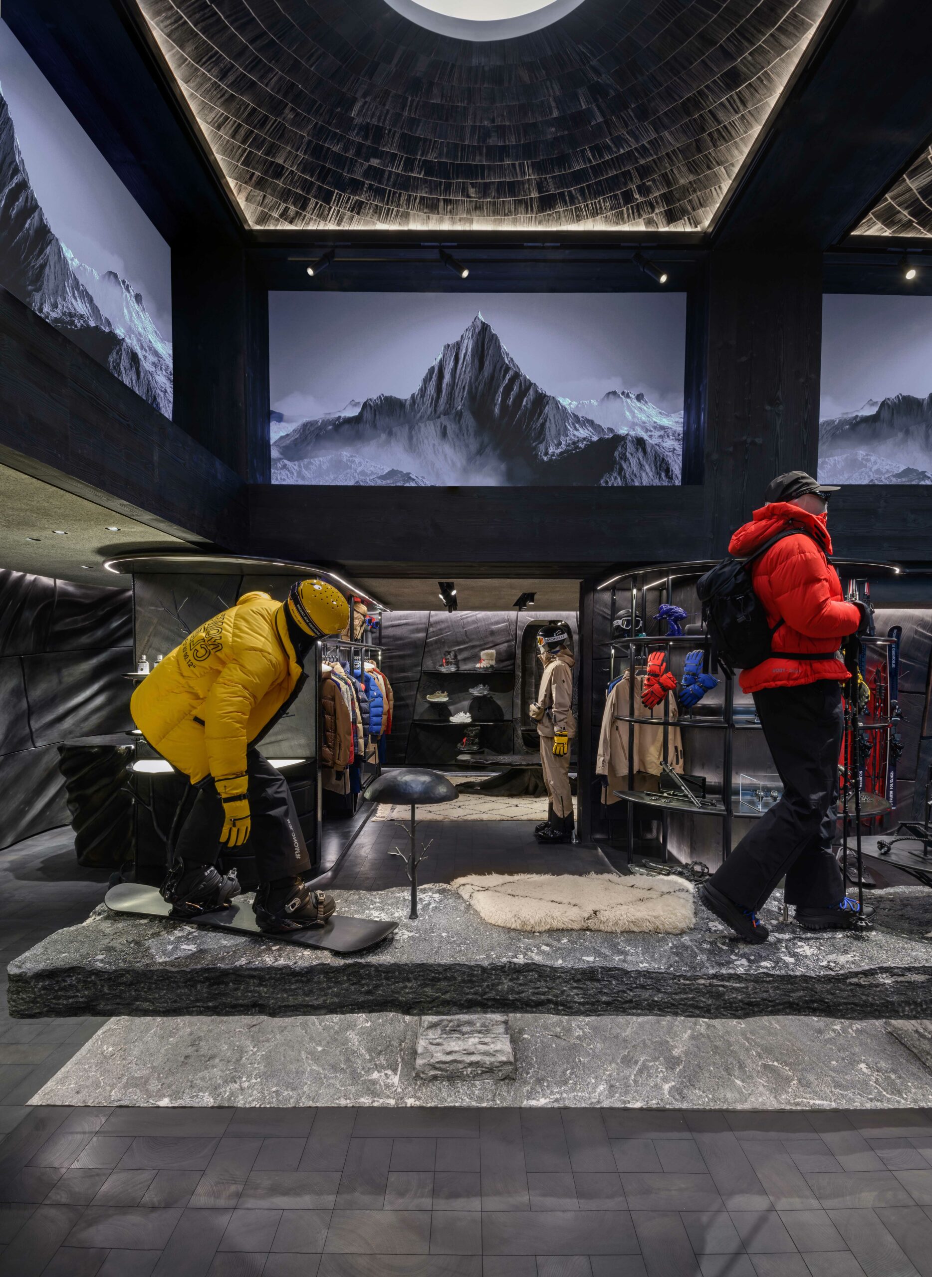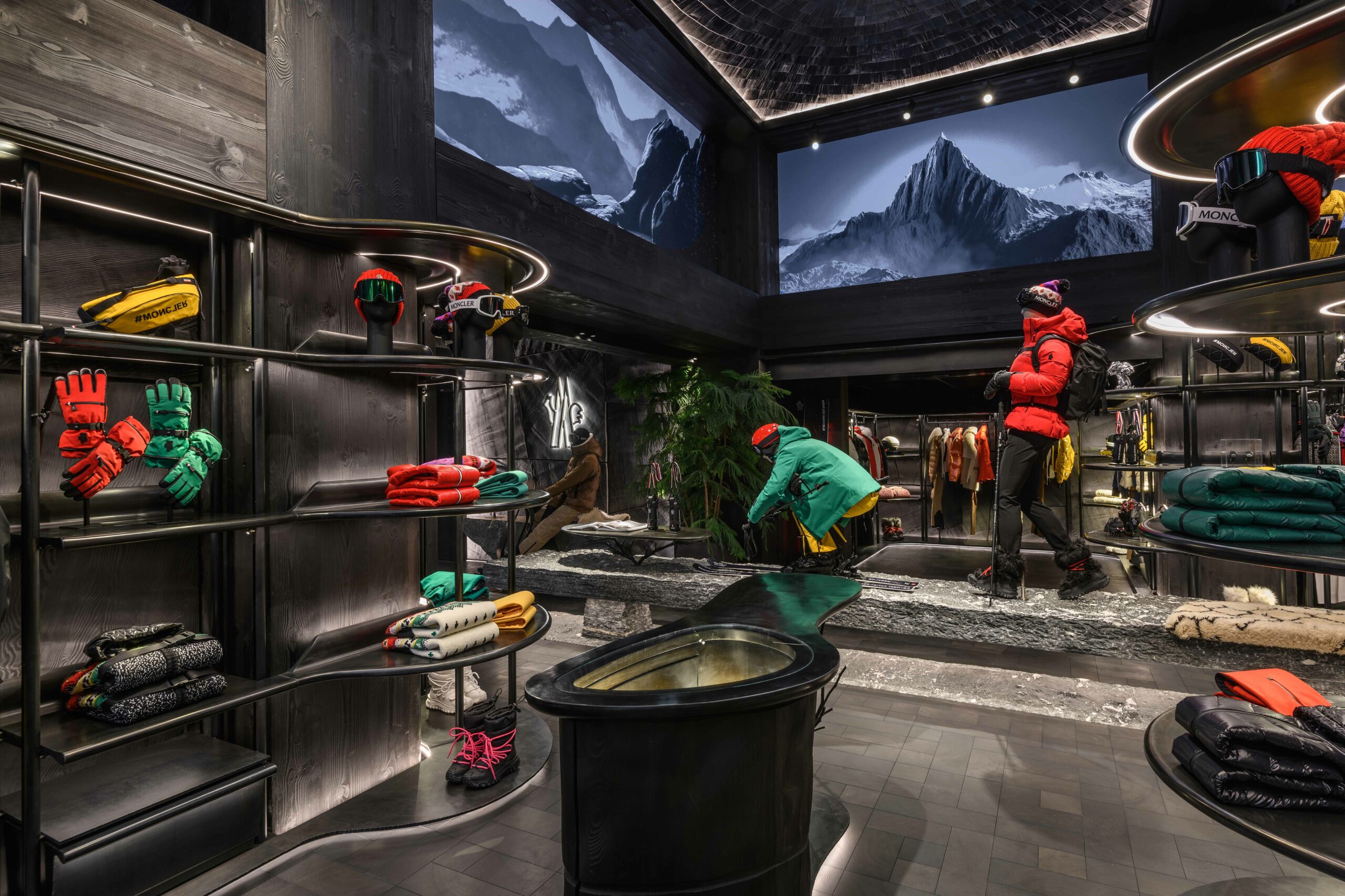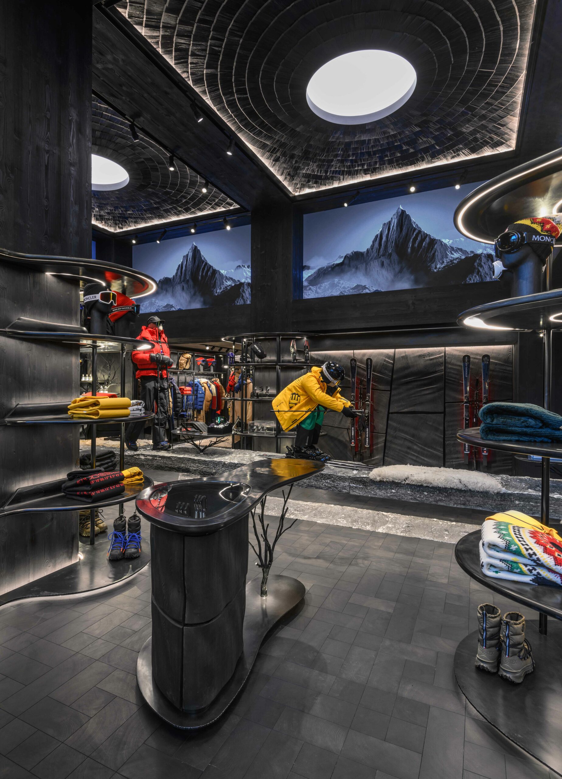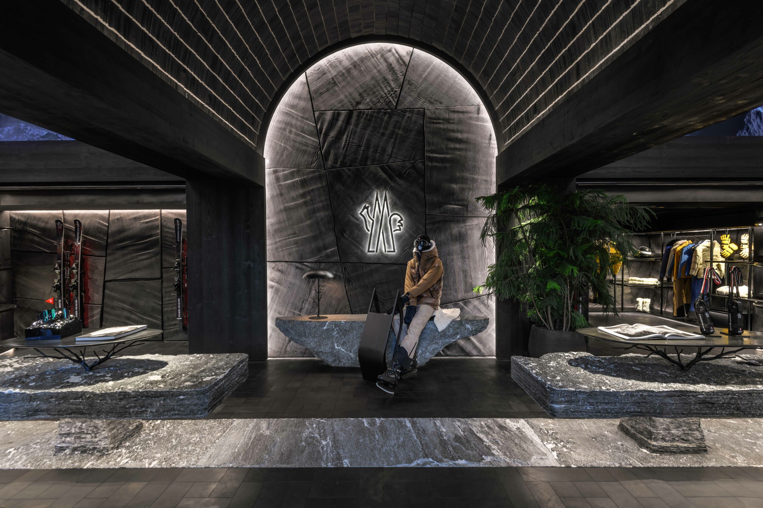 Le studio Küchel Architects a imaginé cet espace en hommage à l’héritage alpin de Moncler. Les paysages sauvages de la région sont la source d’inspiration, et cela se reflète dans l’utilisation de matériaux naturels, bruts et fonctionnels. Des sculptures en bois s’élèvent sous un plafond à double hauteur, créant une atmosphère unique, presque féérique. Les finitions évoquent la nature environnante, rappelant un havre de paix dans les bois alpins.