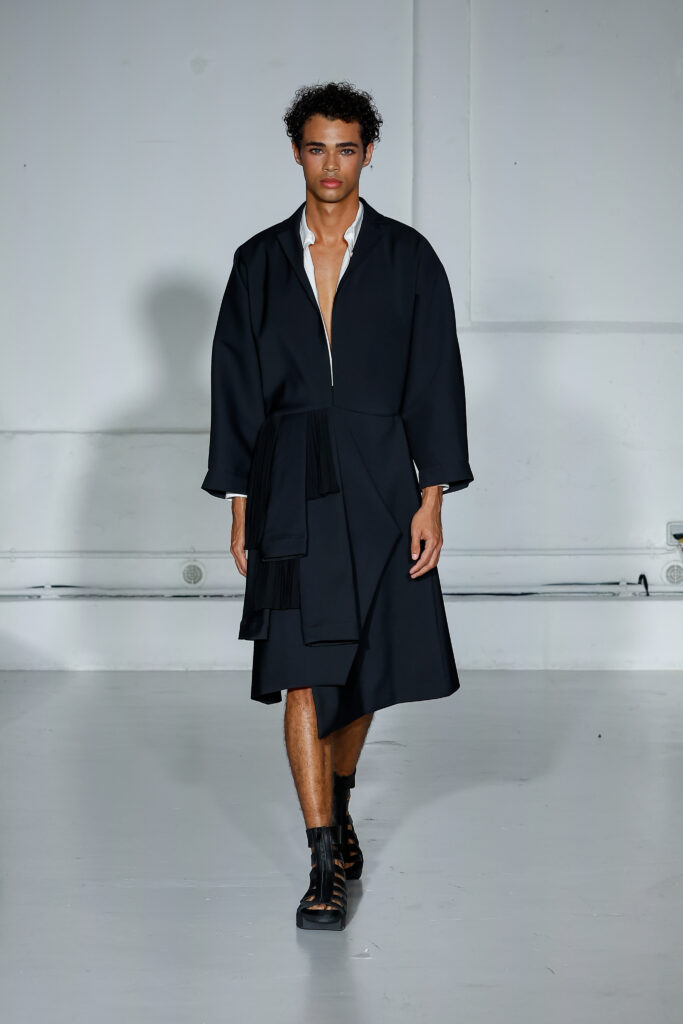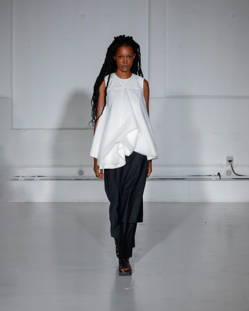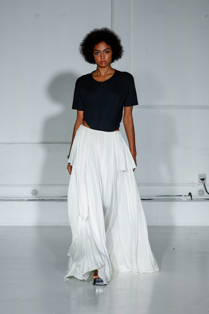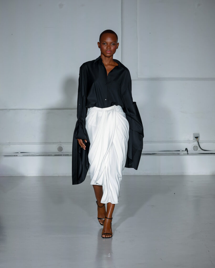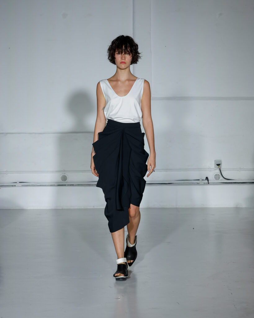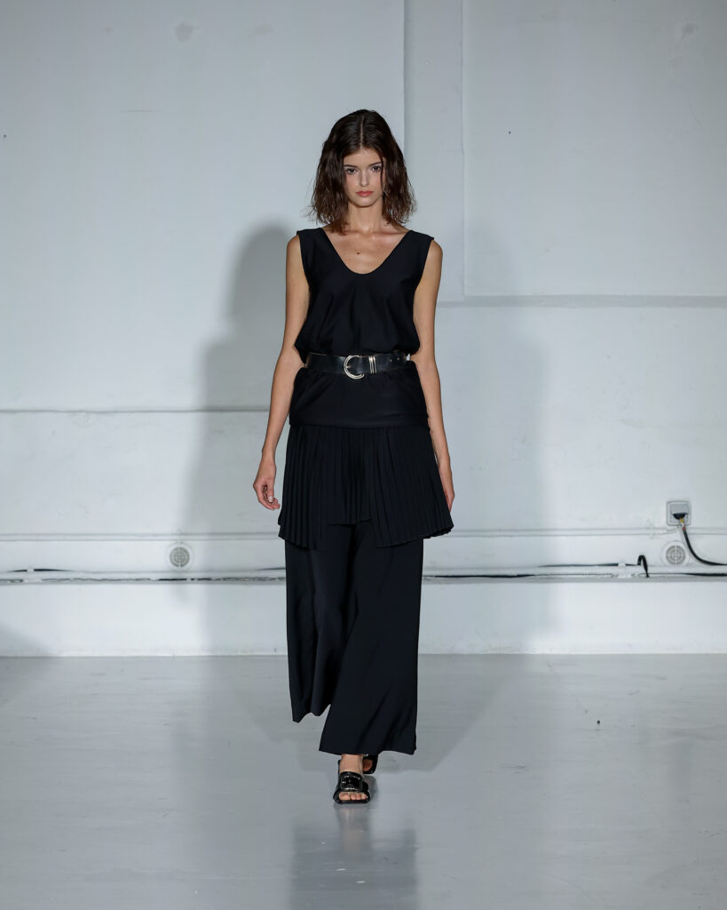 Dans cette nouvelle collection, MOSSI repense ses pièces les plus iconiques : jupe à pans plissés et asymétriques – portée par-dessus un pantalon ou un jean large – robe trapèze graphique, chemise aux longueurs asymétriques ou encore pantalon exagérément blousant. À ces éléments phares s’ajoutent de nouvelles interprétations, à l’image d’une jupe portefeuille aux lignes irrégulières, d’un top drapé autour du corps ou de manteaux géométriques à pans. S’articulant autour d’un style aussi sophistiqué que streetwear, architectural que déconstruit, la collection reflète l’identité même de la maison, axée sur une couture urbaine et contemporaine.