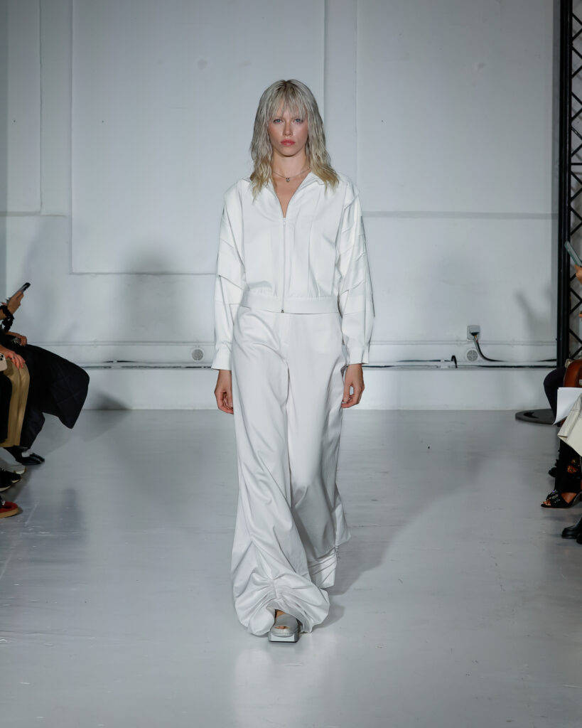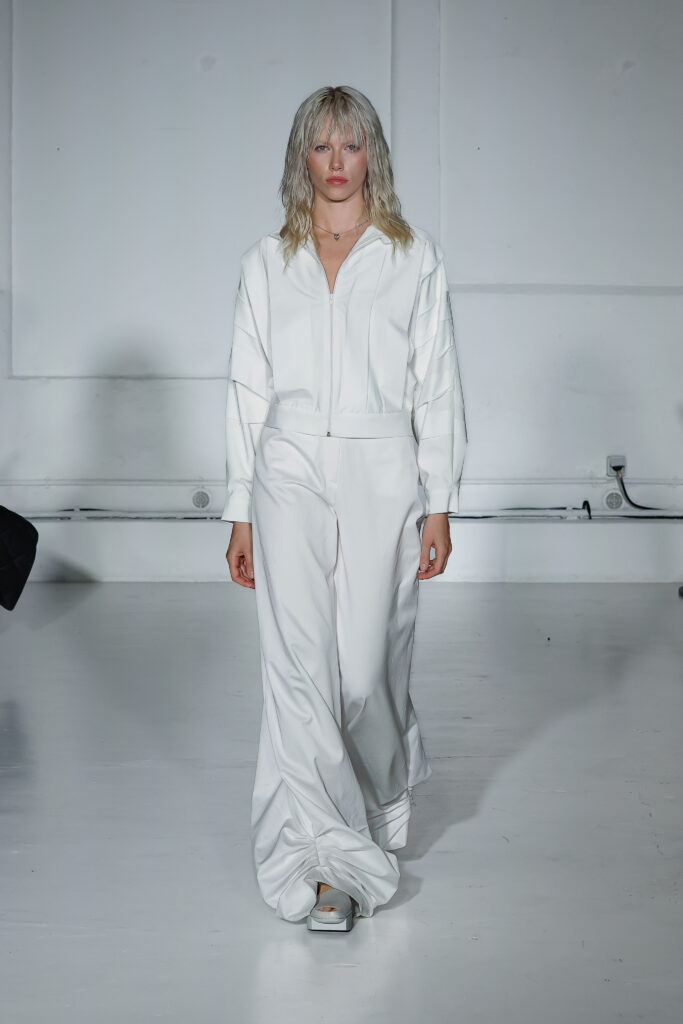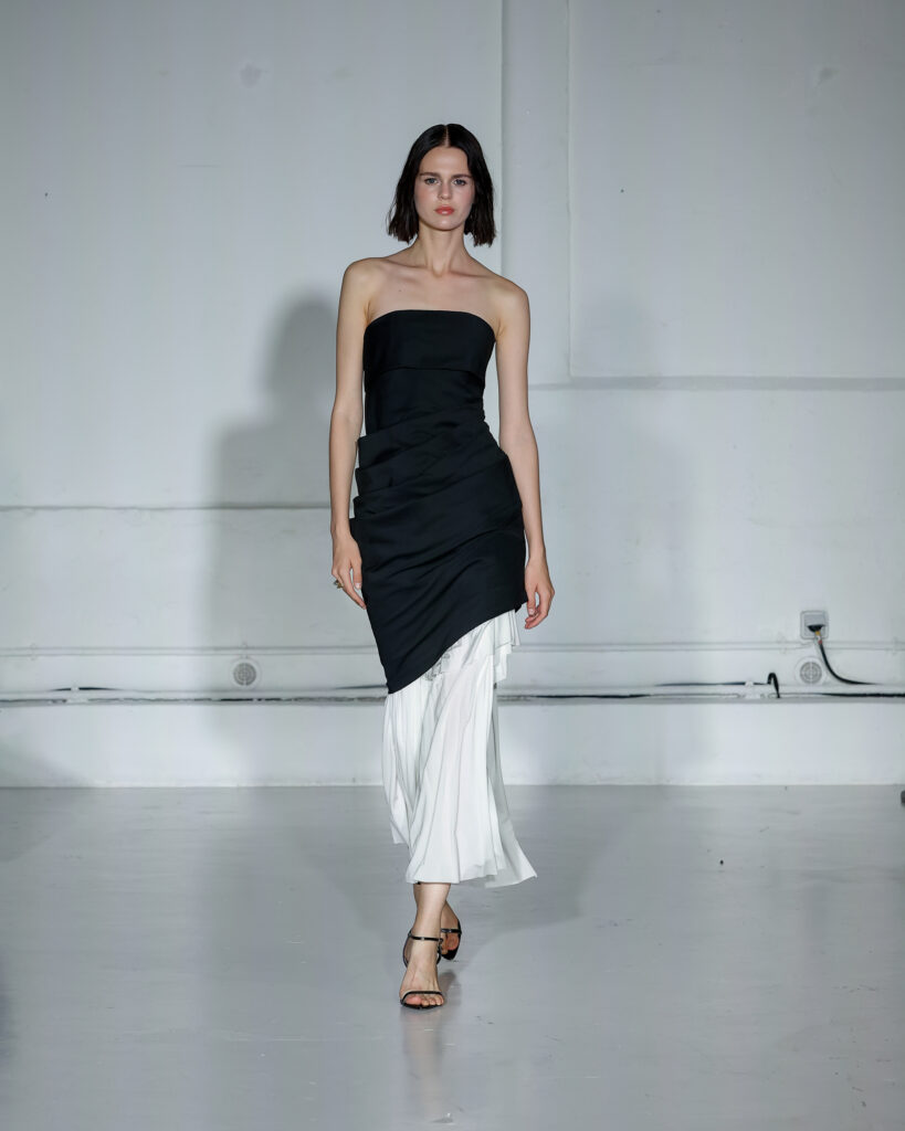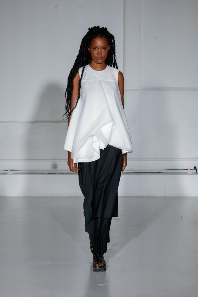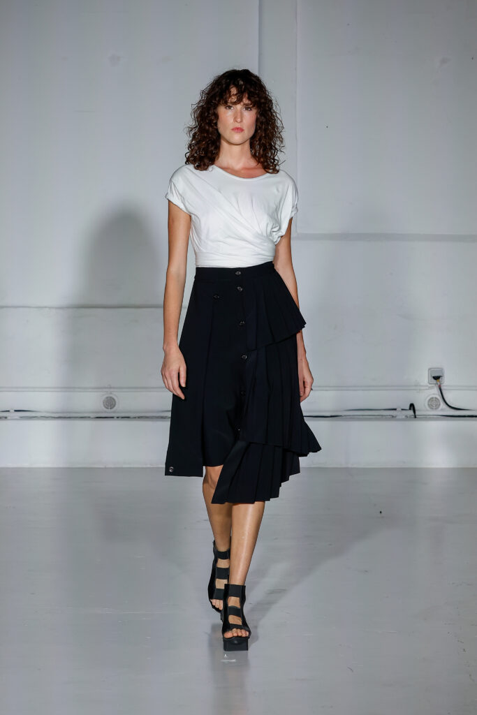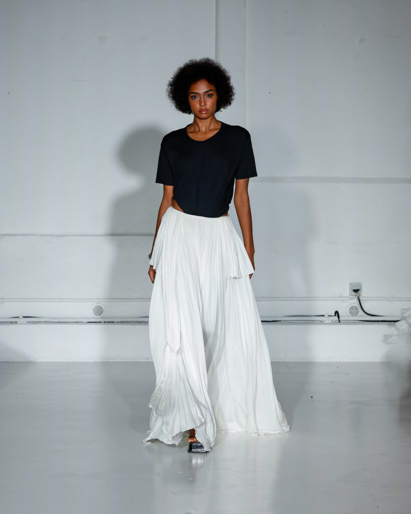 Dans cette nouvelle collection, MOSSI repense ses pièces les plus iconiques : jupe à pans plissés et asymétriques – portée par-dessus un pantalon ou un jean large – robe trapèze graphique, chemise aux longueurs asymétriques ou encore pantalon exagérément blousant. À ces éléments phares s’ajoutent de nouvelles interprétations, à l’image d’une jupe portefeuille aux lignes irrégulières, d’un top drapé autour du corps ou de manteaux géométriques à pans. S’articulant autour d’un style aussi sophistiqué que streetwear, architectural que déconstruit, la collection reflète l’identité même de la maison, axée sur une couture urbaine et contemporaine.