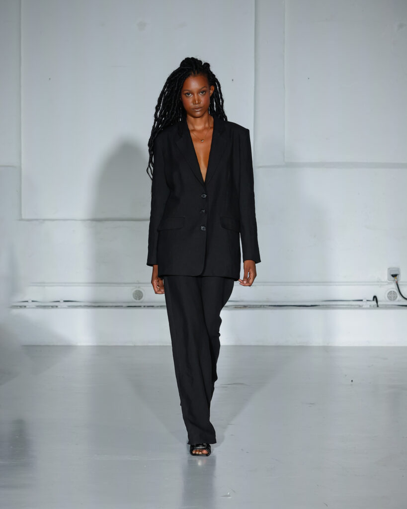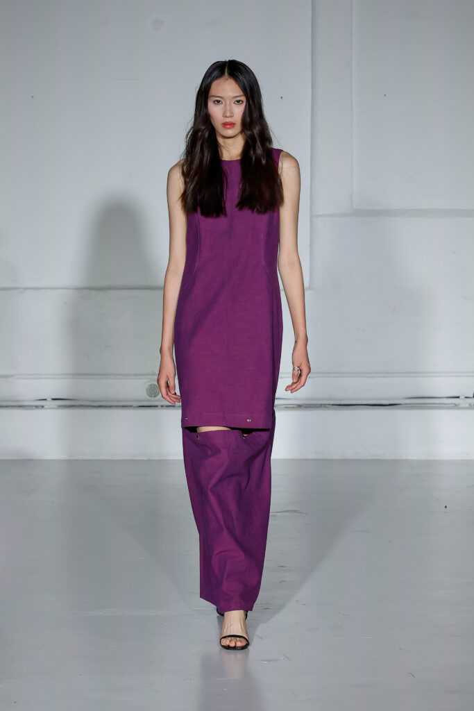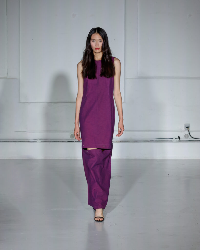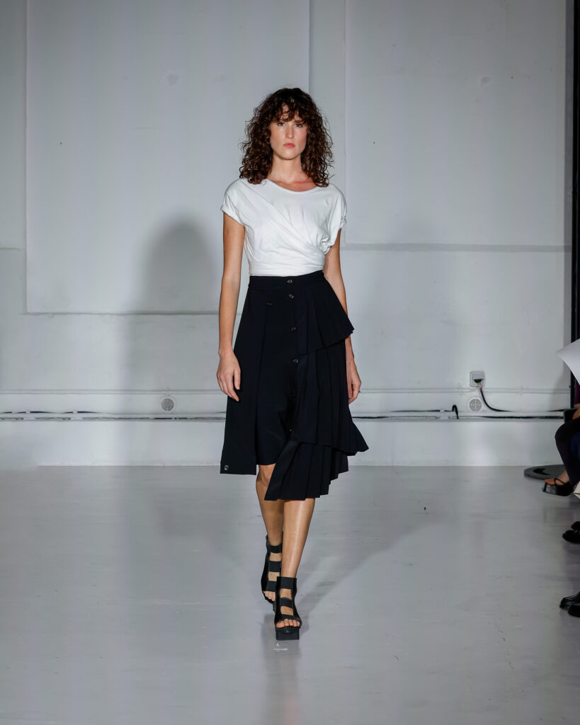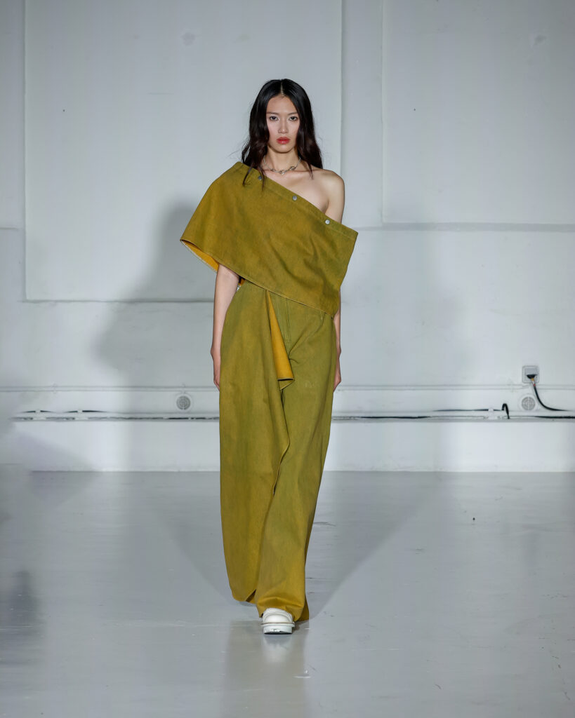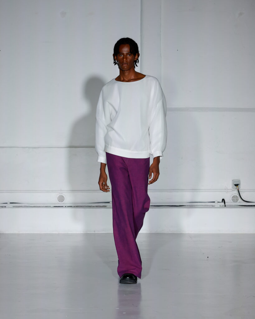 Dans cette nouvelle collection, MOSSI repense ses pièces les plus iconiques : jupe à pans plissés et asymétriques – portée par-dessus un pantalon ou un jean large – robe trapèze graphique, chemise aux longueurs asymétriques ou encore pantalon exagérément blousant. À ces éléments phares s’ajoutent de nouvelles interprétations, à l’image d’une jupe portefeuille aux lignes irrégulières, d’un top drapé autour du corps ou de manteaux géométriques à pans. S’articulant autour d’un style aussi sophistiqué que streetwear, architectural que déconstruit, la collection reflète l’identité même de la maison, axée sur une couture urbaine et contemporaine.