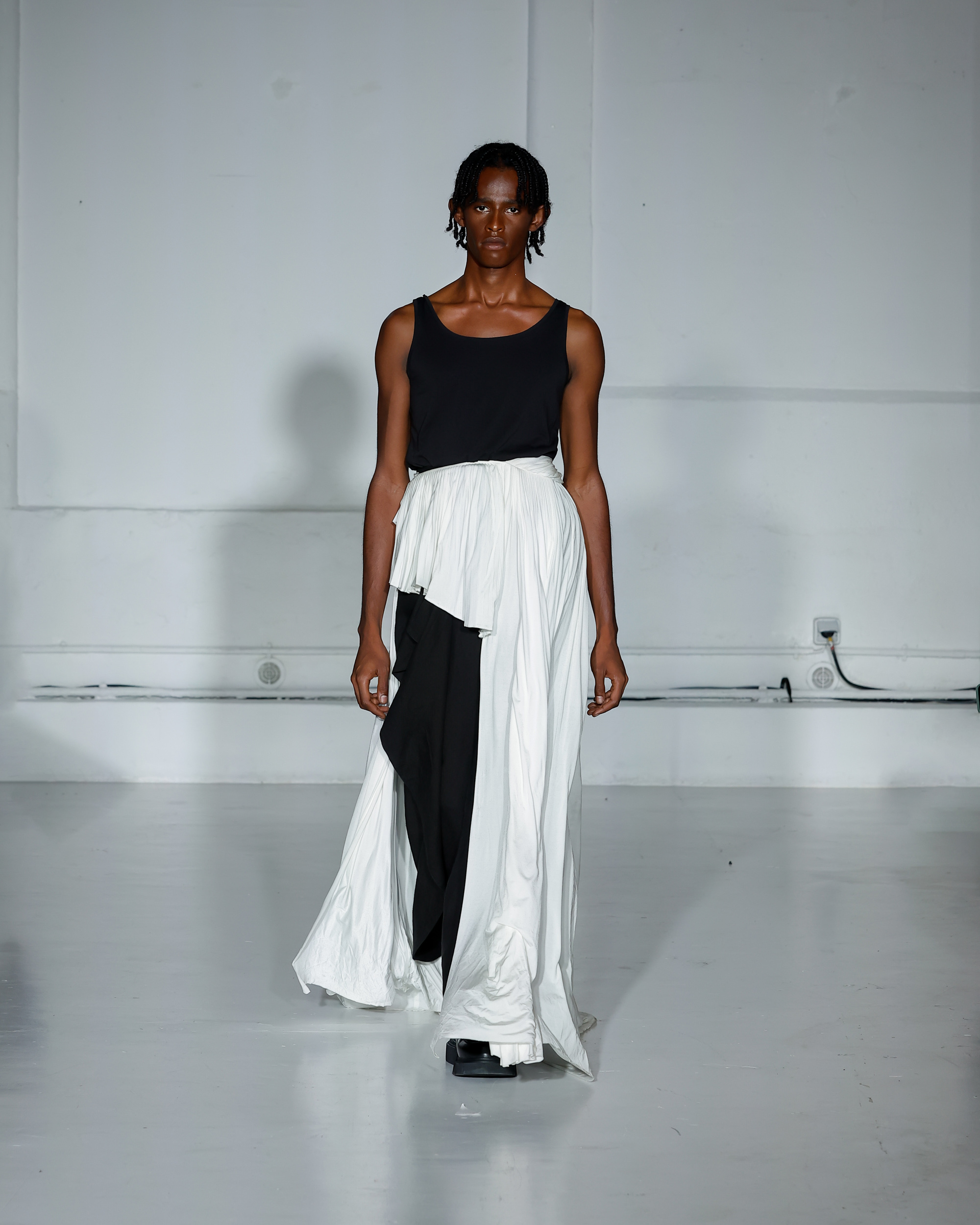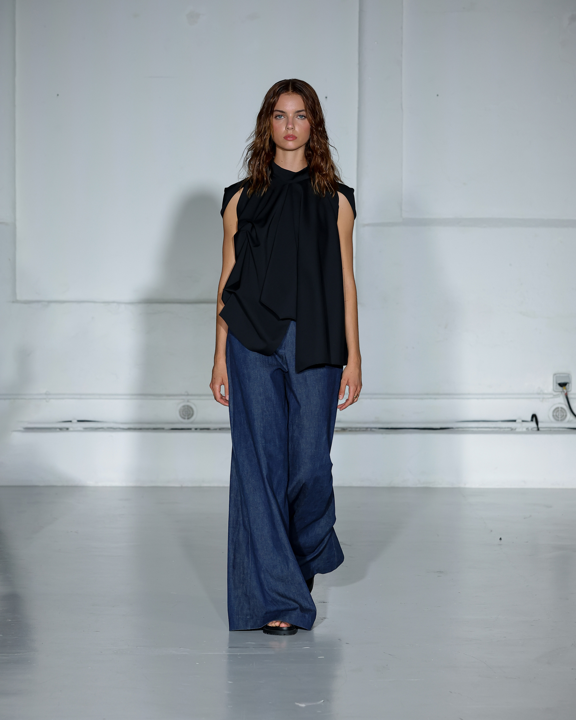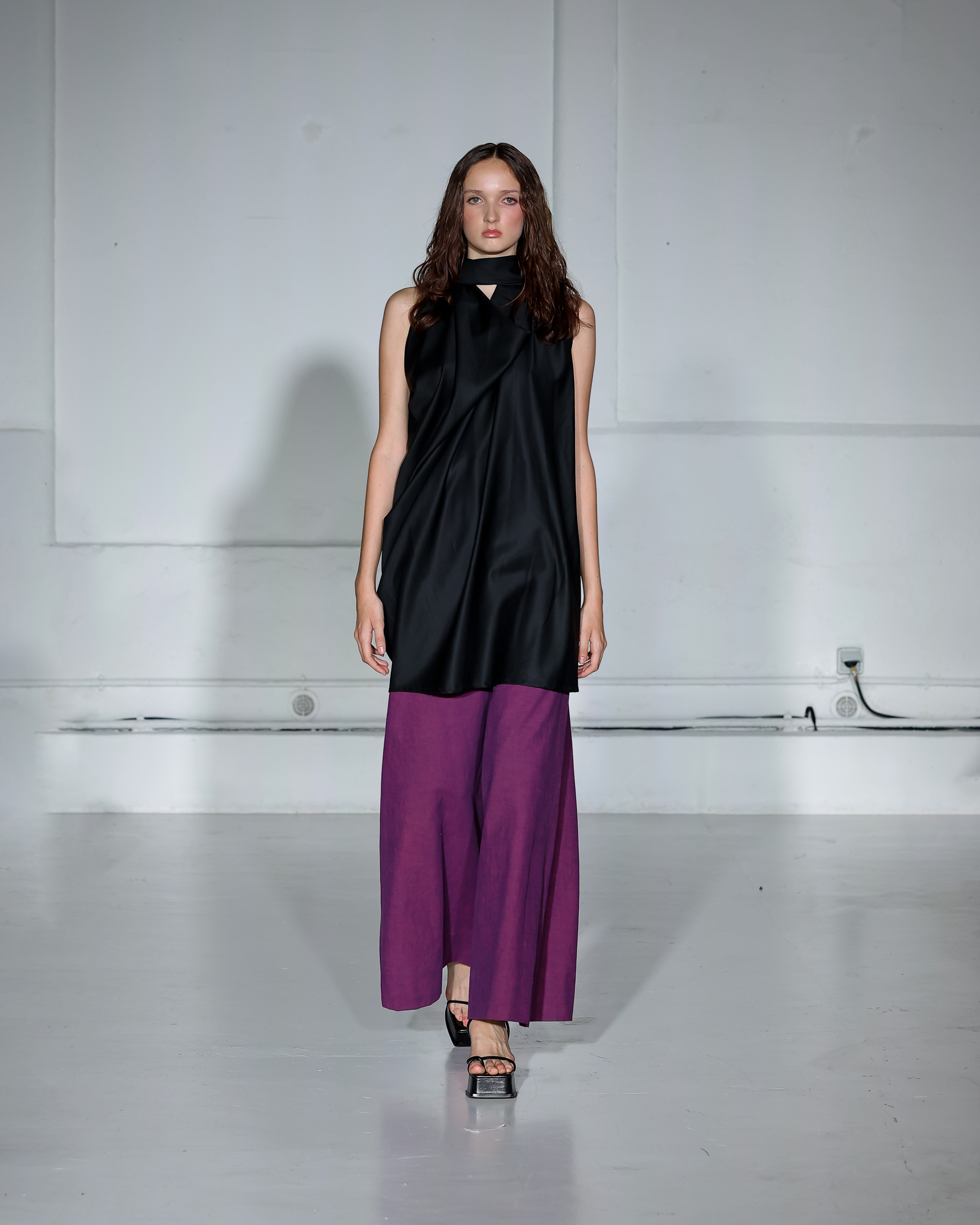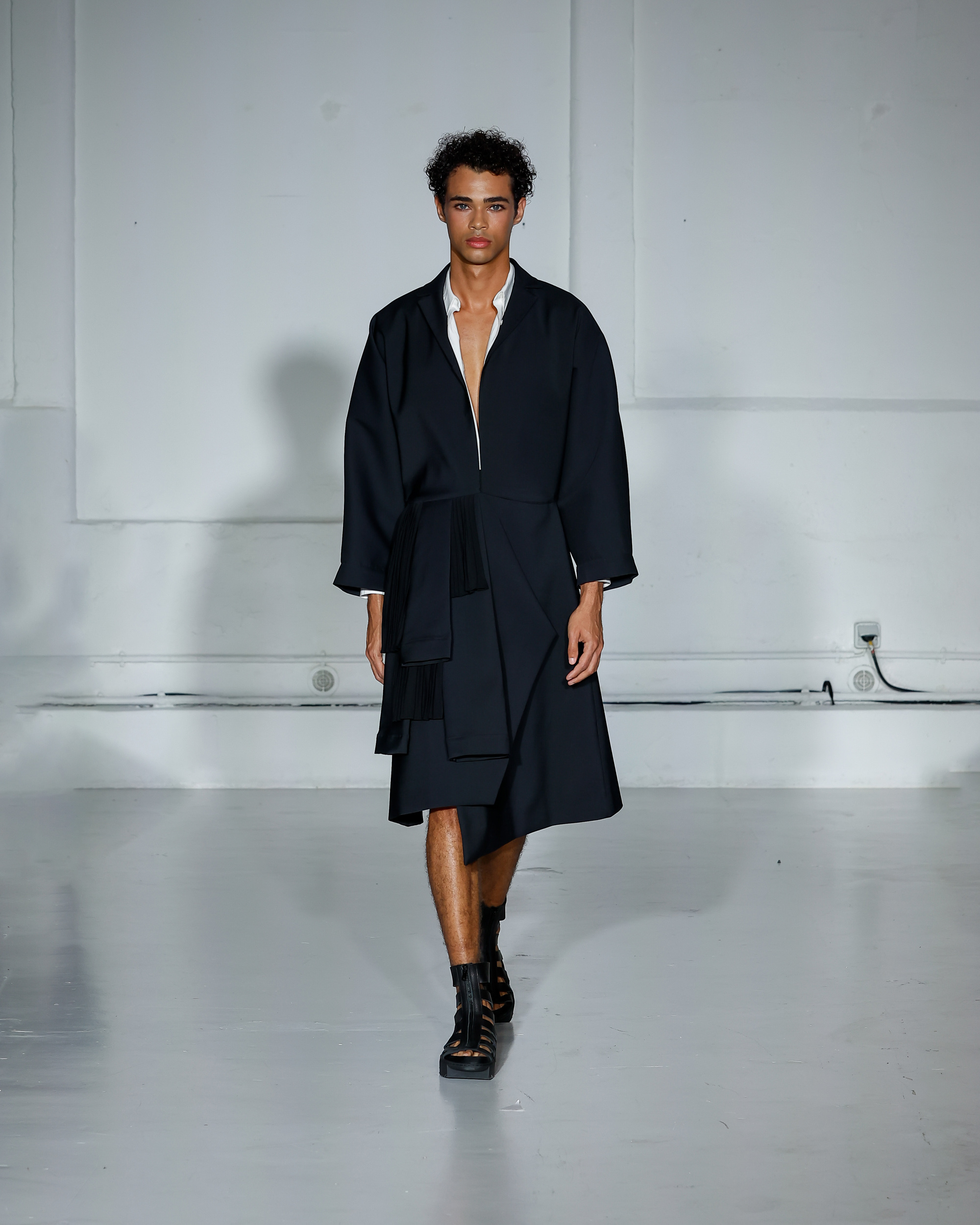 Dans cette nouvelle collection, MOSSI repense ses pièces les plus iconiques : jupe à pans plissés et asymétriques – portée par-dessus un pantalon ou un jean large – robe trapèze graphique, chemise aux longueurs asymétriques ou encore pantalon exagérément blousant. À ces éléments phares s’ajoutent de nouvelles interprétations, à l’image d’une jupe portefeuille aux lignes irrégulières, d’un top drapé autour du corps ou de manteaux géométriques à pans. S’articulant autour d’un style aussi sophistiqué que streetwear, architectural que déconstruit, la collection reflète l’identité même de la maison, axée sur une couture urbaine et contemporaine.
