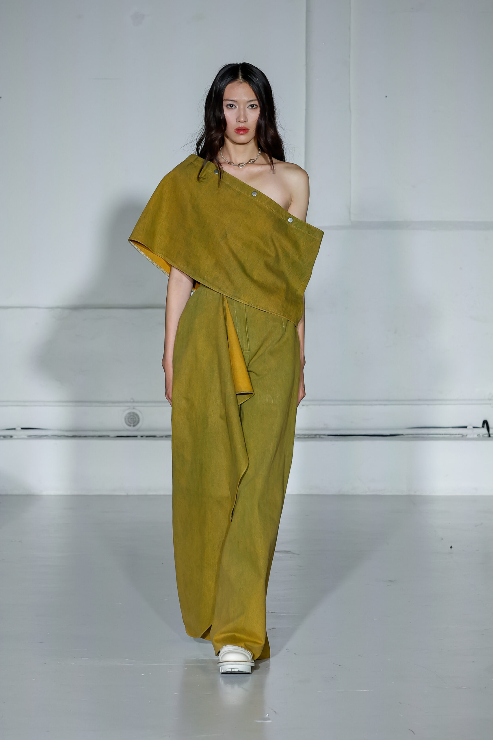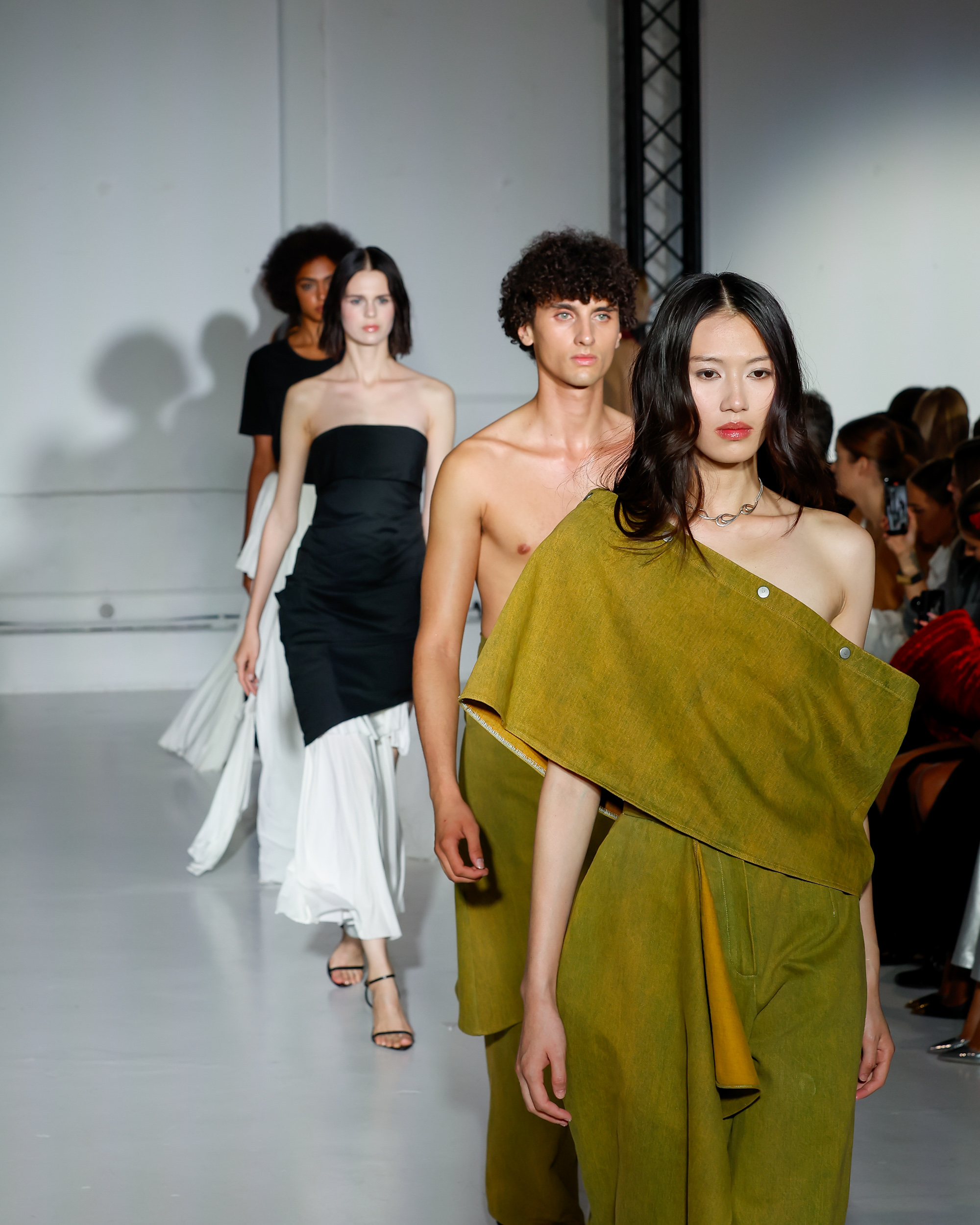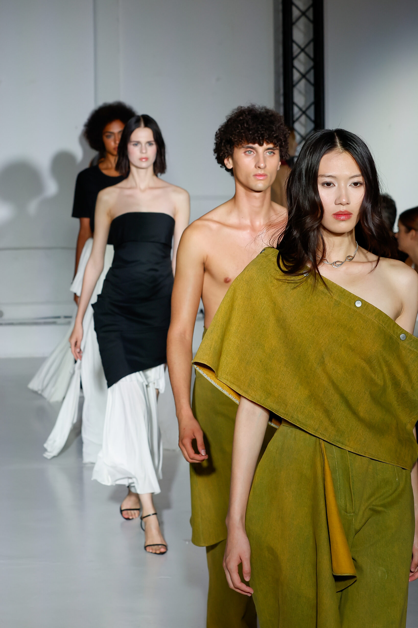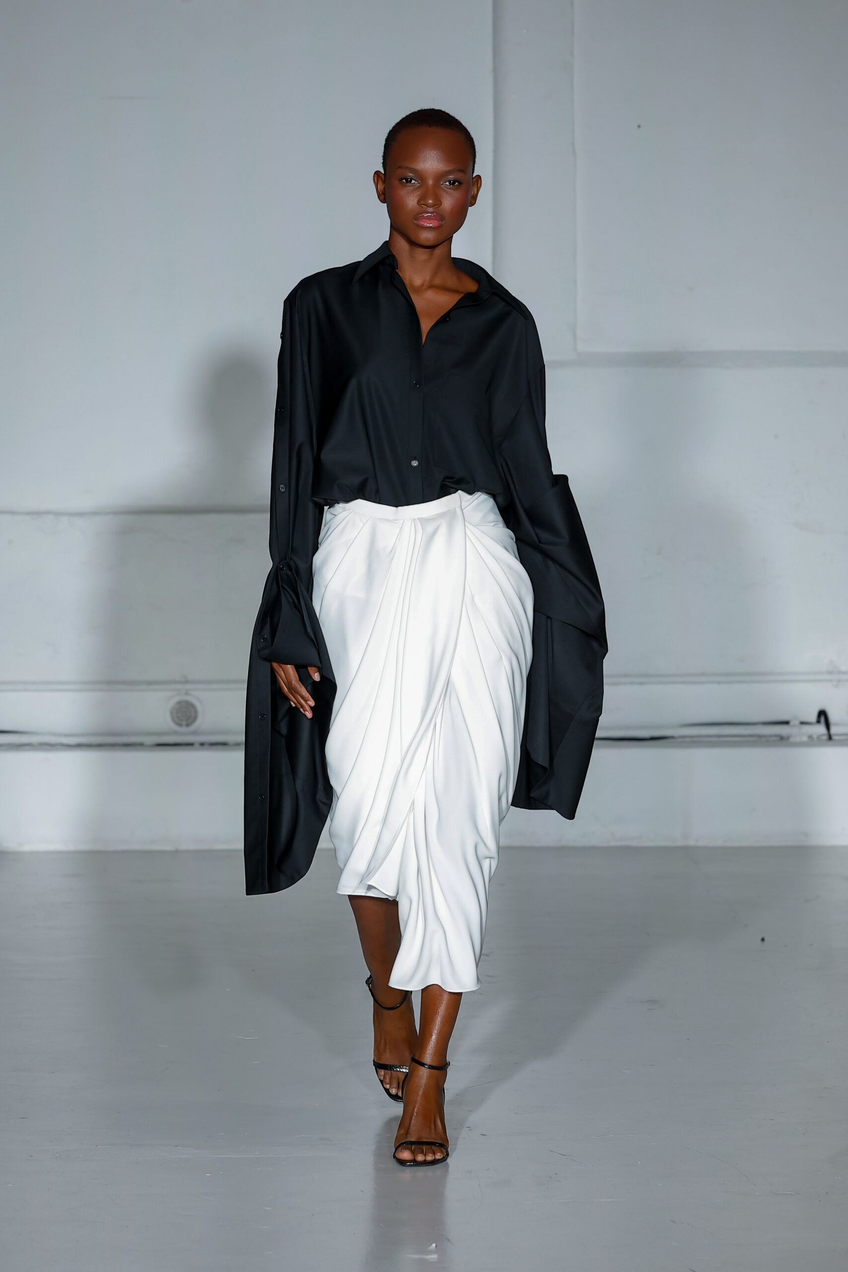 Dans cette nouvelle collection, MOSSI repense ses pièces les plus iconiques : jupe à pans plissés et asymétriques – portée par-dessus un pantalon ou un jean large – robe trapèze graphique, chemise aux longueurs asymétriques ou encore pantalon exagérément blousant. À ces éléments phares s’ajoutent de nouvelles interprétations, à l’image d’une jupe portefeuille aux lignes irrégulières, d’un top drapé autour du corps ou de manteaux géométriques à pans. S’articulant autour d’un style aussi sophistiqué que streetwear, architectural que déconstruit, la collection reflète l’identité même de la maison, axée sur une couture urbaine et contemporaine.