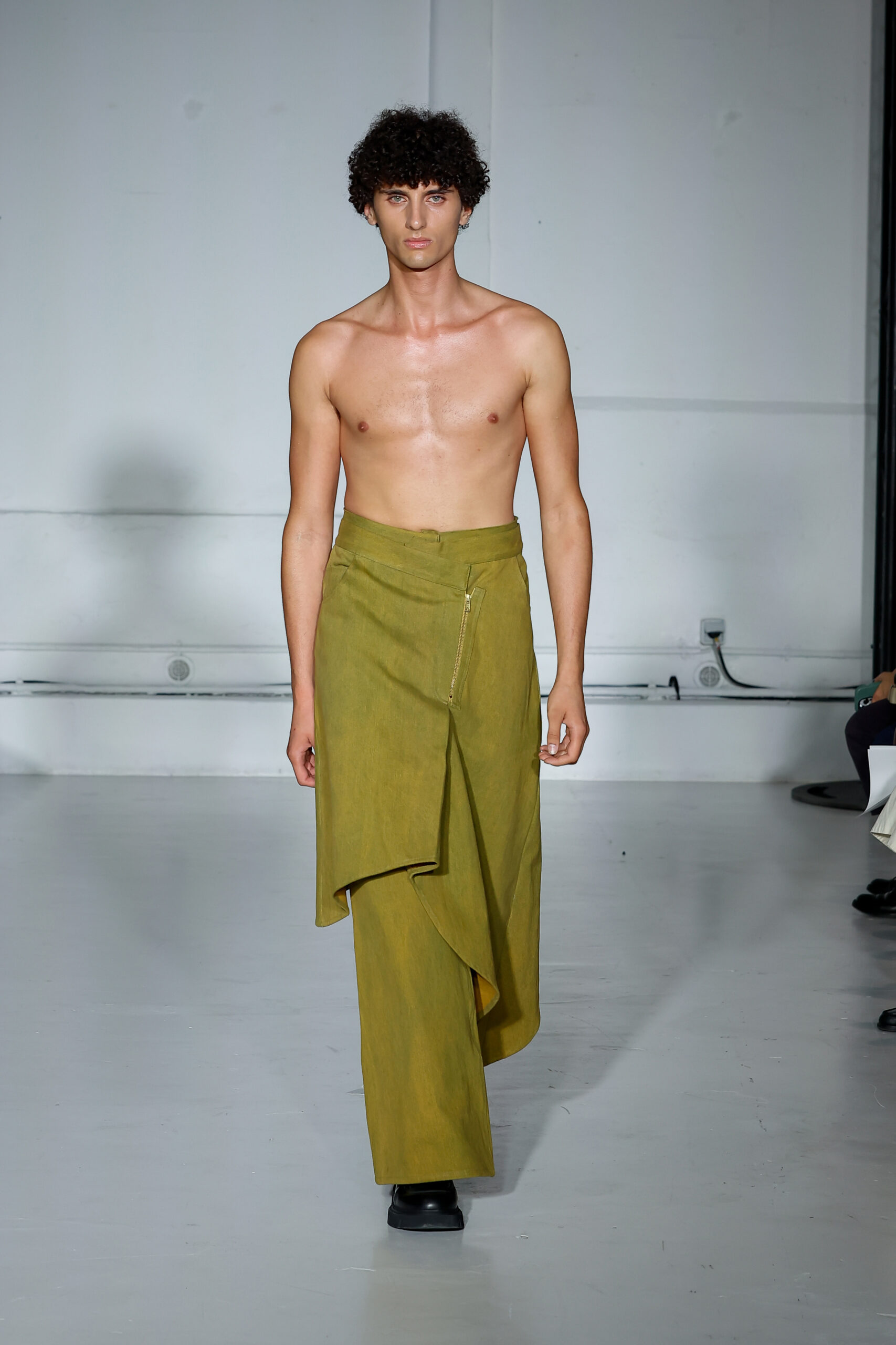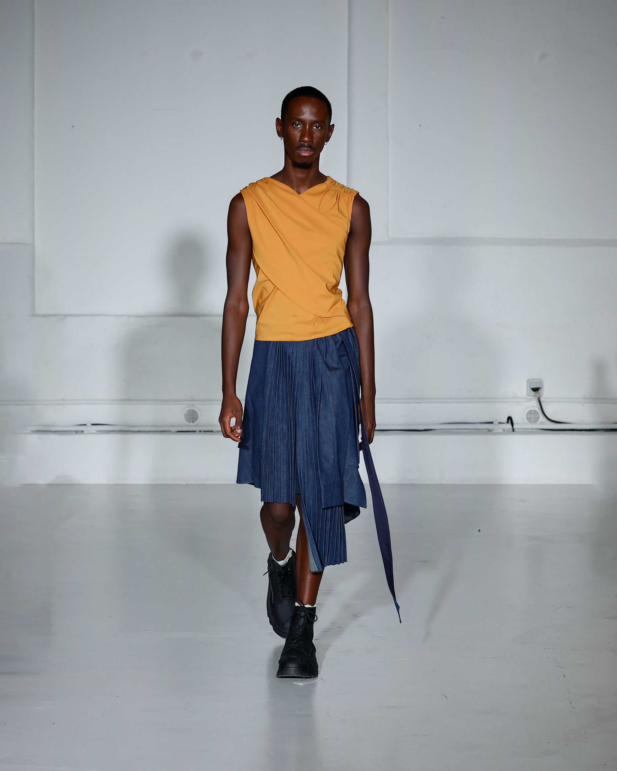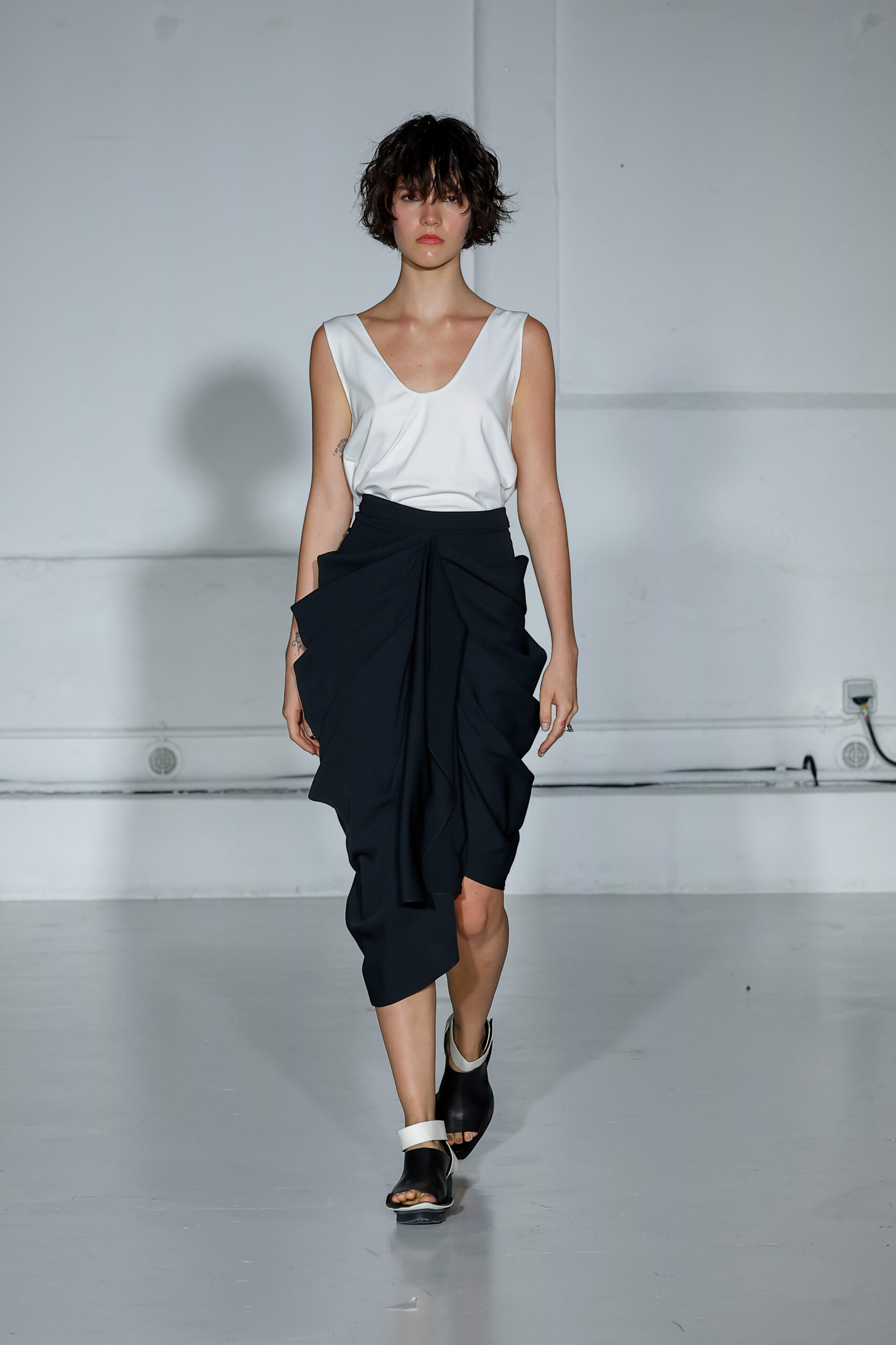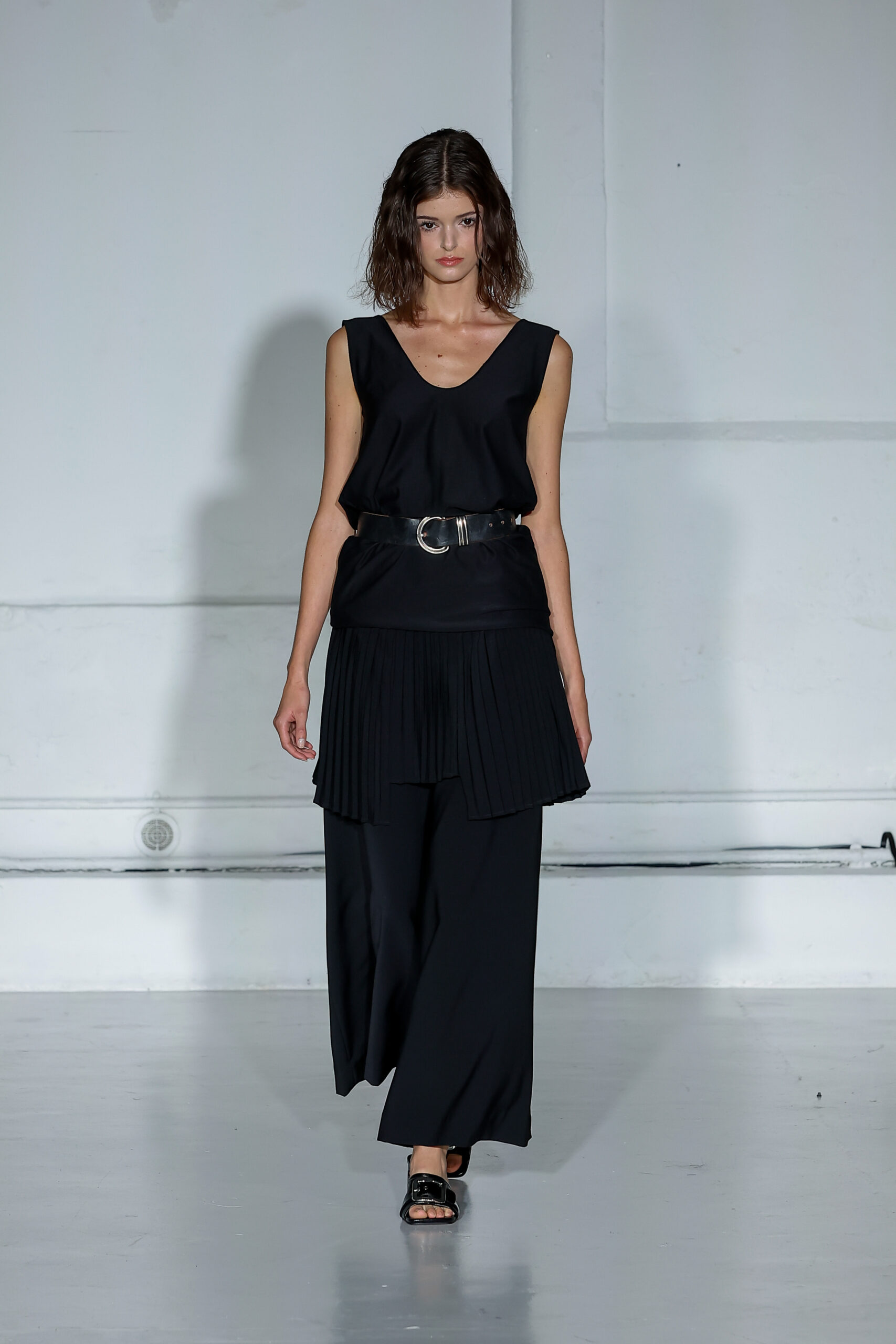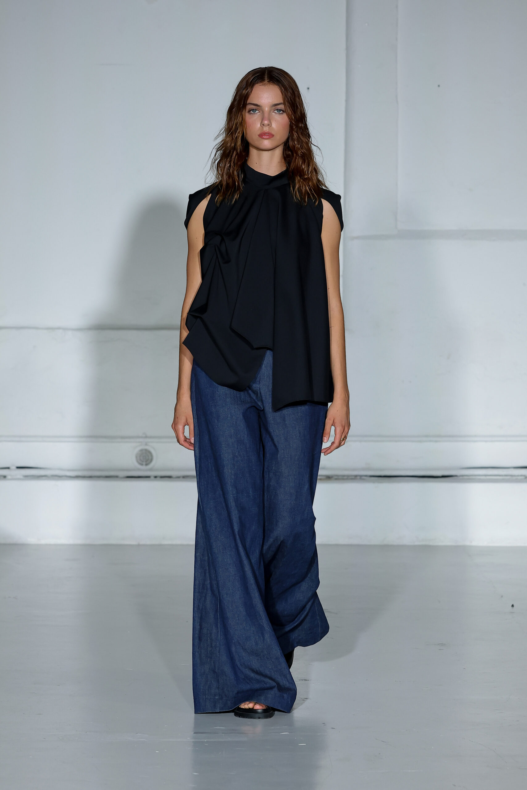 Dans cette nouvelle collection, MOSSI repense ses pièces les plus iconiques : jupe à pans plissés et asymétriques – portée par-dessus un pantalon ou un jean large – robe trapèze graphique, chemise aux longueurs asymétriques ou encore pantalon exagérément blousant. À ces éléments phares s’ajoutent de nouvelles interprétations, à l’image d’une jupe portefeuille aux lignes irrégulières, d’un top drapé autour du corps ou de manteaux géométriques à pans. S’articulant autour d’un style aussi sophistiqué que streetwear, architectural que déconstruit, la collection reflète l’identité même de la maison, axée sur une couture urbaine et contemporaine.