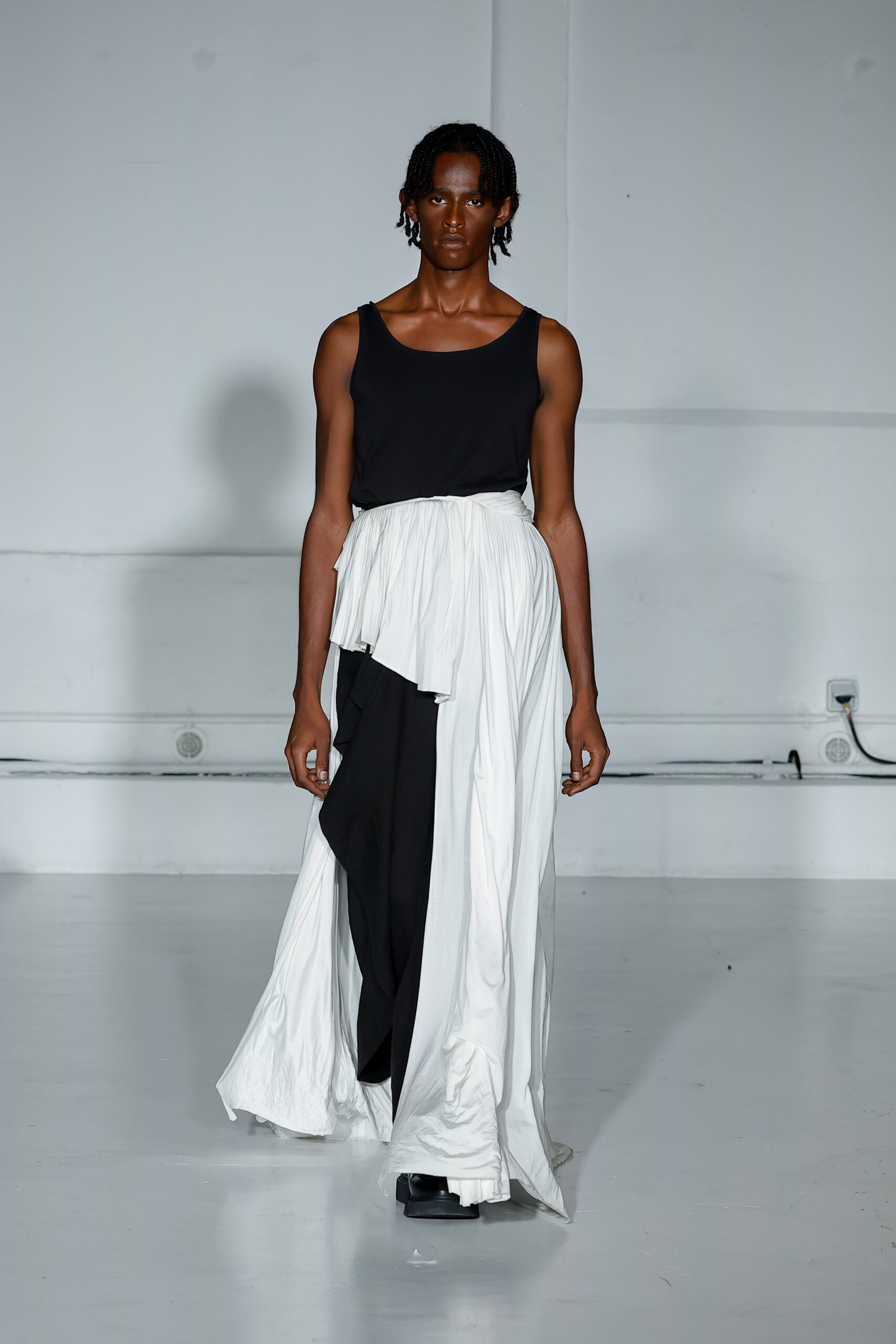 Véritable moodboard de son identité visuelle, la collection printemps-été 2024 reflète toutes les inspirations chères à Mossi. Les coupes et les volumes de la collection reprennent ici le travail architectural, contemporain et asymétrique de l’artiste sud-coréenne Lee Bul, dont les œuvres nourrissent la vision créative du créateur français. Les pièces se drapant autour du corps rappellent, elles, le sari traditionnel tandis que les plissés évoquent le travail d’Issey Miyake, mais aussi de Madame Grès. Passionné depuis ses débuts par le travail de cette dernière, Mossi rend régulièrement hommage à la sculptrice de tissu à travers ses créations. À l’occasion des 30 ans de la mort de la créatrice parisienne, le label a donc tout naturellement souhaité honorer son héritage, en intégrant cette fois le fameux « pli Grès » dans sa collection à travers deux silhouettes bien identifiables.
