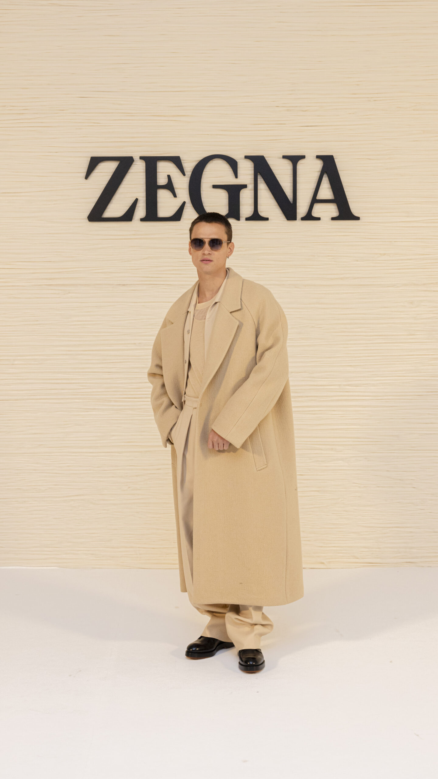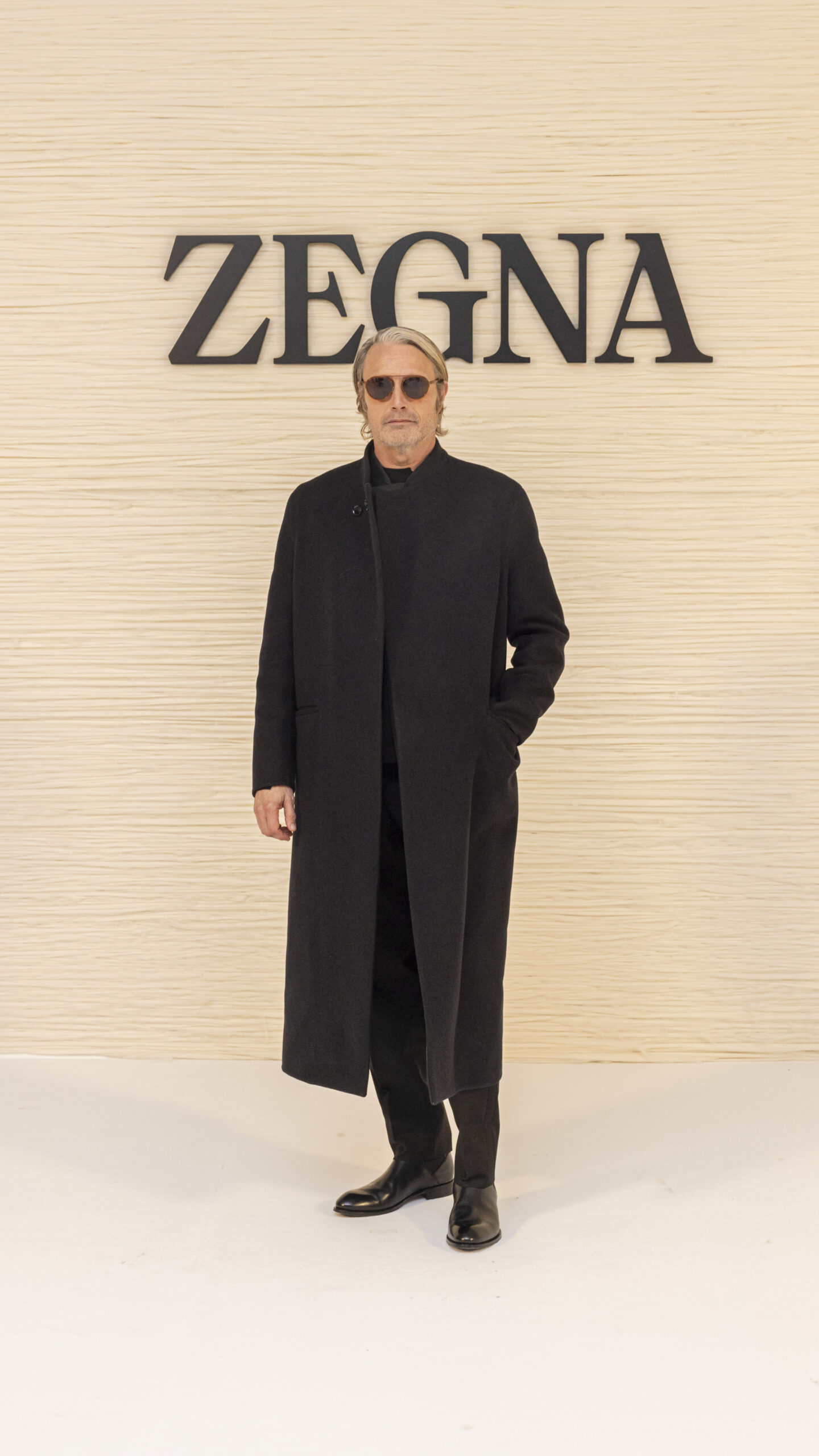 Mads Mikkelsen and Saul Nanni wearing iconic models EZ031 at ZEGNA FW24 Fashion show.