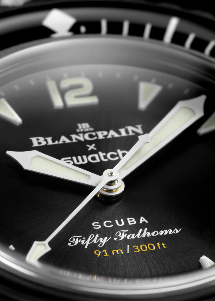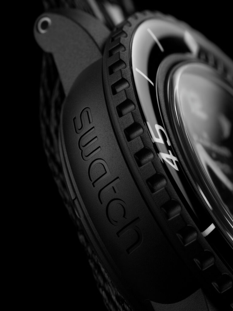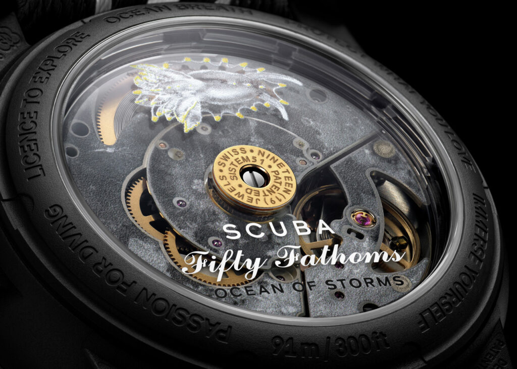Les logos Blancpain X Swatch se trouvent sur le cadran finition soleil noir et sur la couronne. Le mot « Swatch » est inscrit sur le boîtier, tandis que « Blancpain » est gravé sur les montres Fifty Fathoms d’origine. À l’arrière de la montre, des inscriptions inspirantes telles que « PASSION FOR DIVING », « LICENCE TO EXPLORE », « OCEAN BREATH », « PROTECT WHAT YOU LOVE » et « IMMERSE YOURSELF » ajoutent une touche de poésie à cet objet d’art.