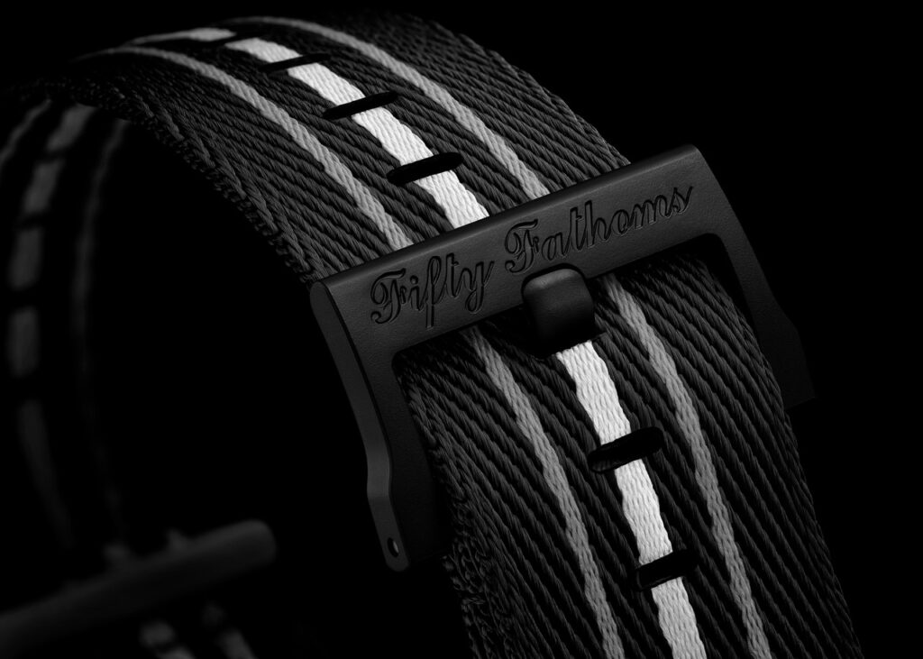 - Bracelet : Bracelet NATO en filets de pêche recyclés. Boucle ardillon en Biocéramique noire et passants