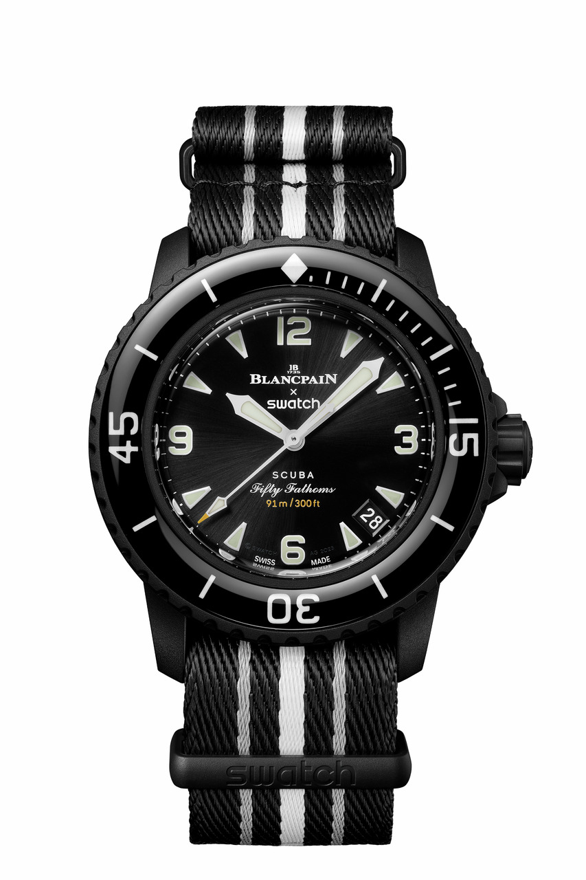 Les logos Blancpain X Swatch se trouvent sur le cadran finition soleil noir et sur la couronne. Le mot « Swatch » est inscrit sur le boîtier, tandis que « Blancpain » est gravé sur les montres Fifty Fathoms d’origine. À l’arrière de la montre, des inscriptions inspirantes telles que « PASSION FOR DIVING », « LICENCE TO EXPLORE », « OCEAN BREATH », « PROTECT WHAT YOU LOVE » et « IMMERSE YOURSELF » ajoutent une touche de poésie à cet objet d’art.