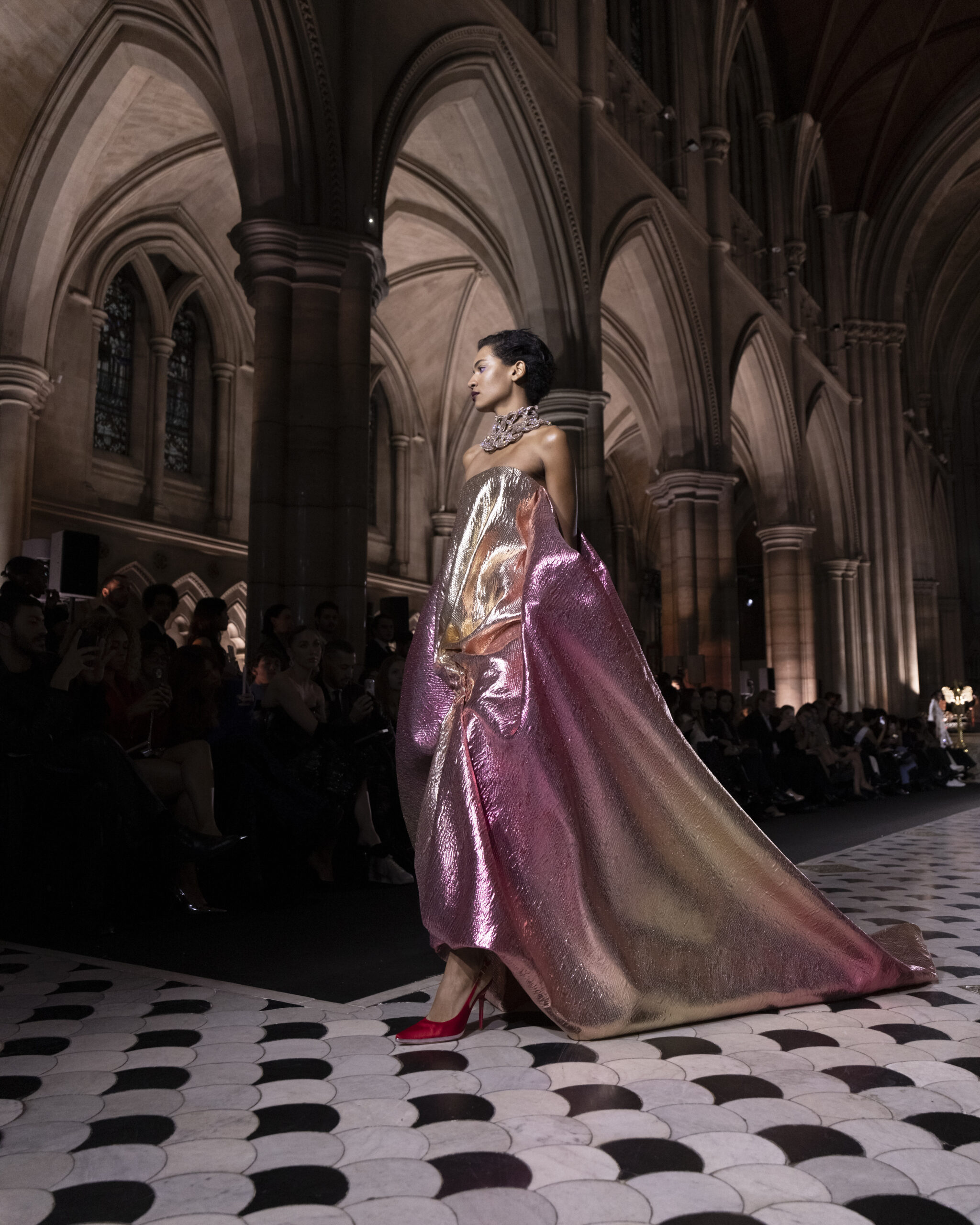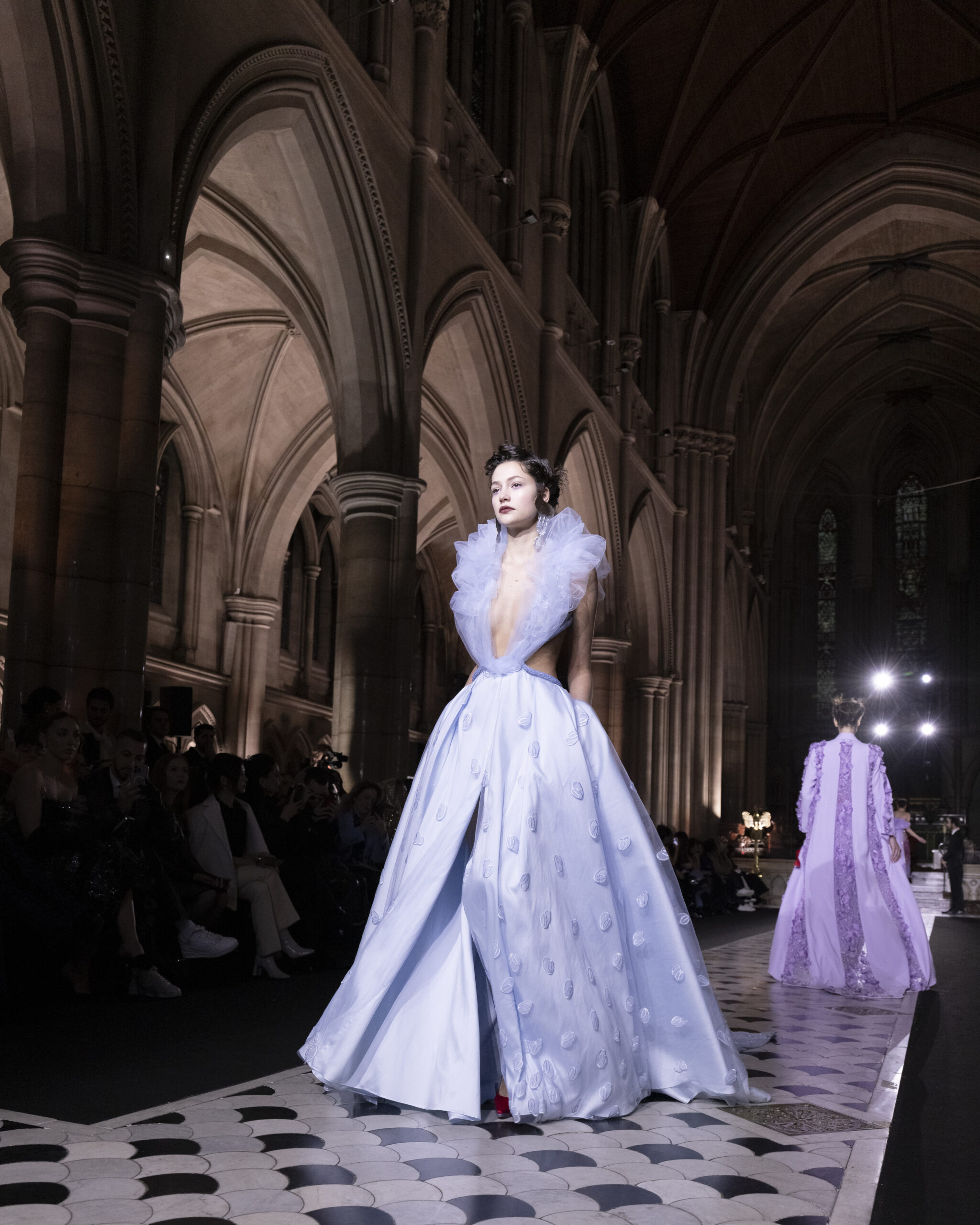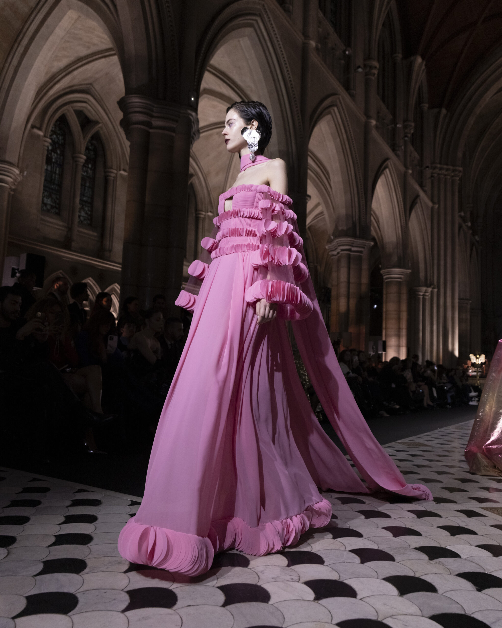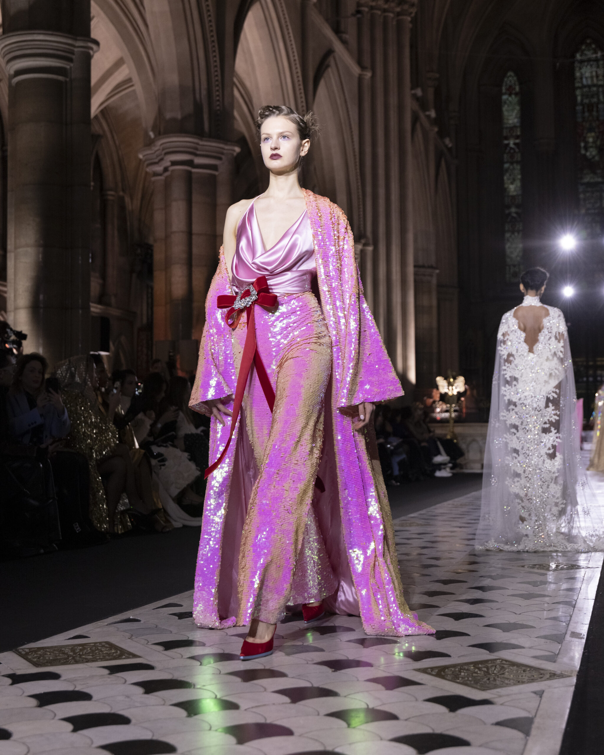 Des notes radieuses d’or et d’argent résonnent aux côtés d’une palette de pastels froids – des nuances éthérées de blanc, de bleu givré, de carnation, de rose et de lilas. La présence constante de carmin à travers la collection sert de force unificatrice audacieuse. Chaque création tisse sa propre histoire sur le podium, offrant une célébration immersive de l’extraordinaire et un voyage vibrant à travers les royaumes de la magie et de l’élégance intemporelle.