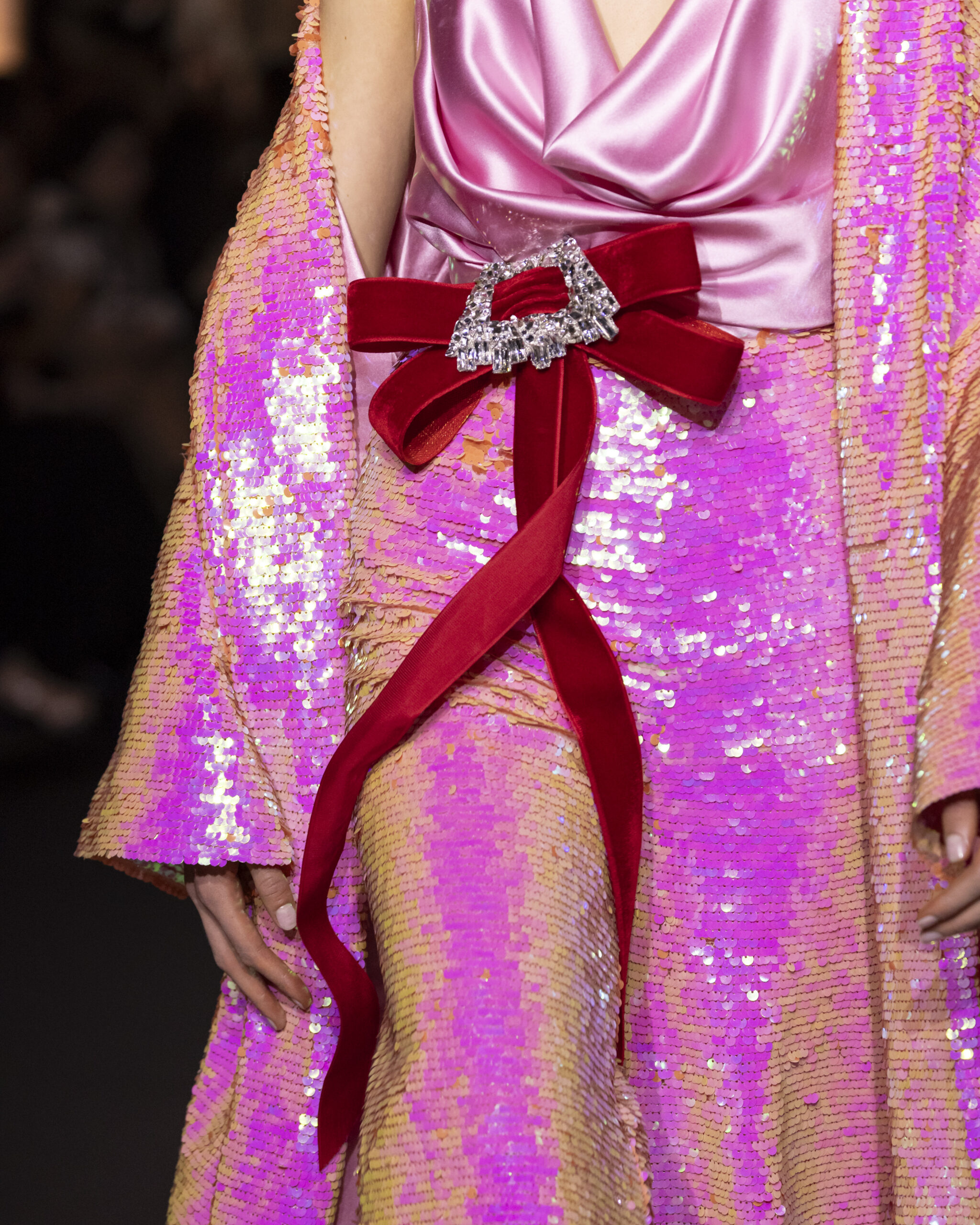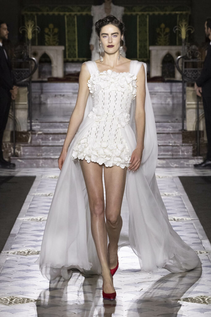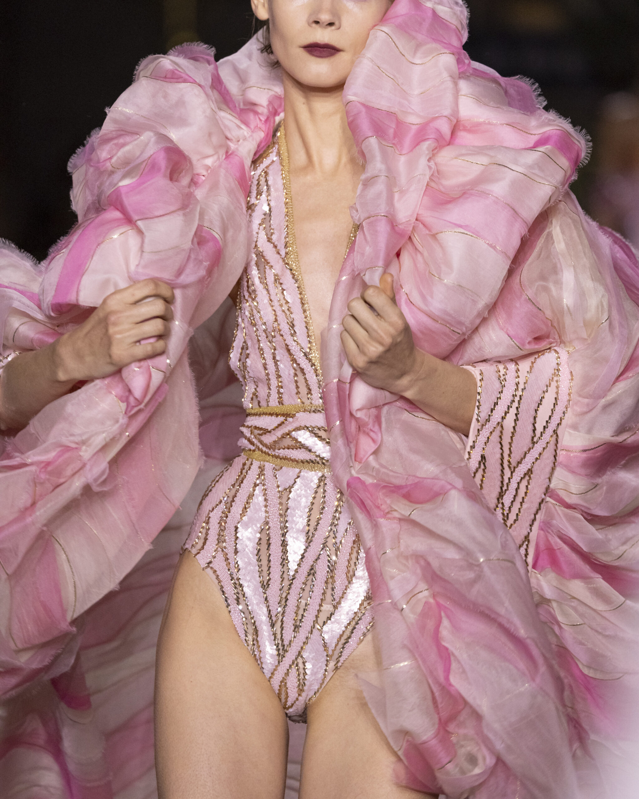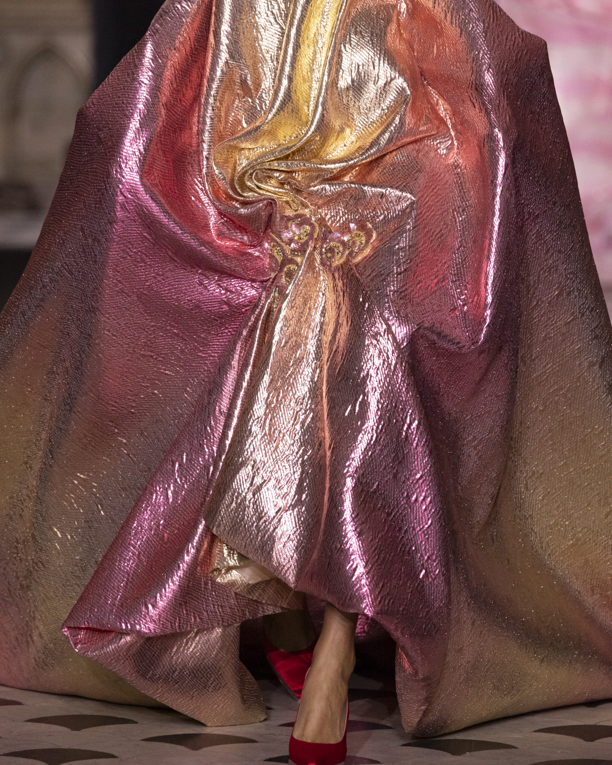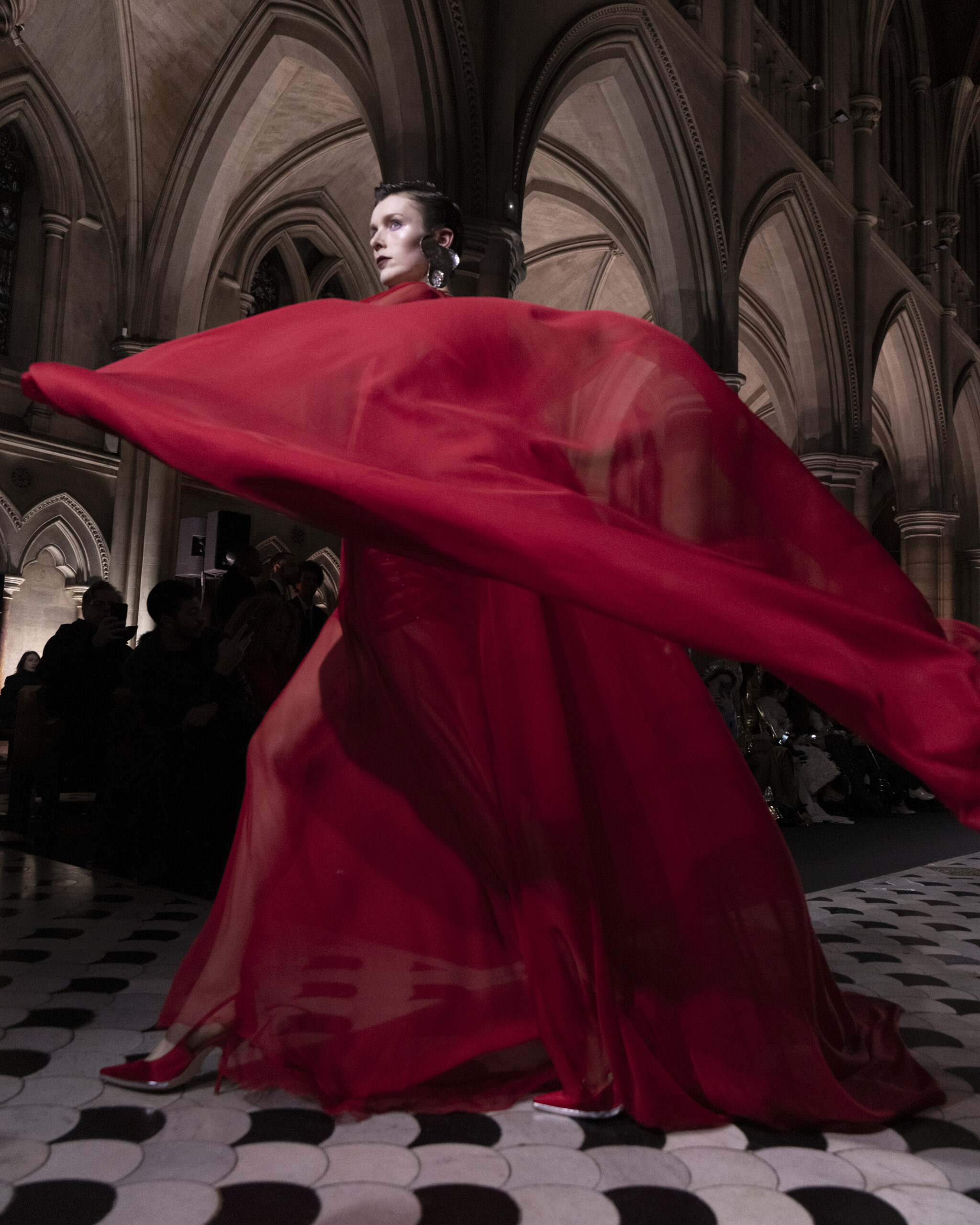 Des notes radieuses d’or et d’argent résonnent aux côtés d’une palette de pastels froids – des nuances éthérées de blanc, de bleu givré, de carnation, de rose et de lilas. La présence constante de carmin à travers la collection sert de force unificatrice audacieuse. Chaque création tisse sa propre histoire sur le podium, offrant une célébration immersive de l’extraordinaire et un voyage vibrant à travers les royaumes de la magie et de l’élégance intemporelle.