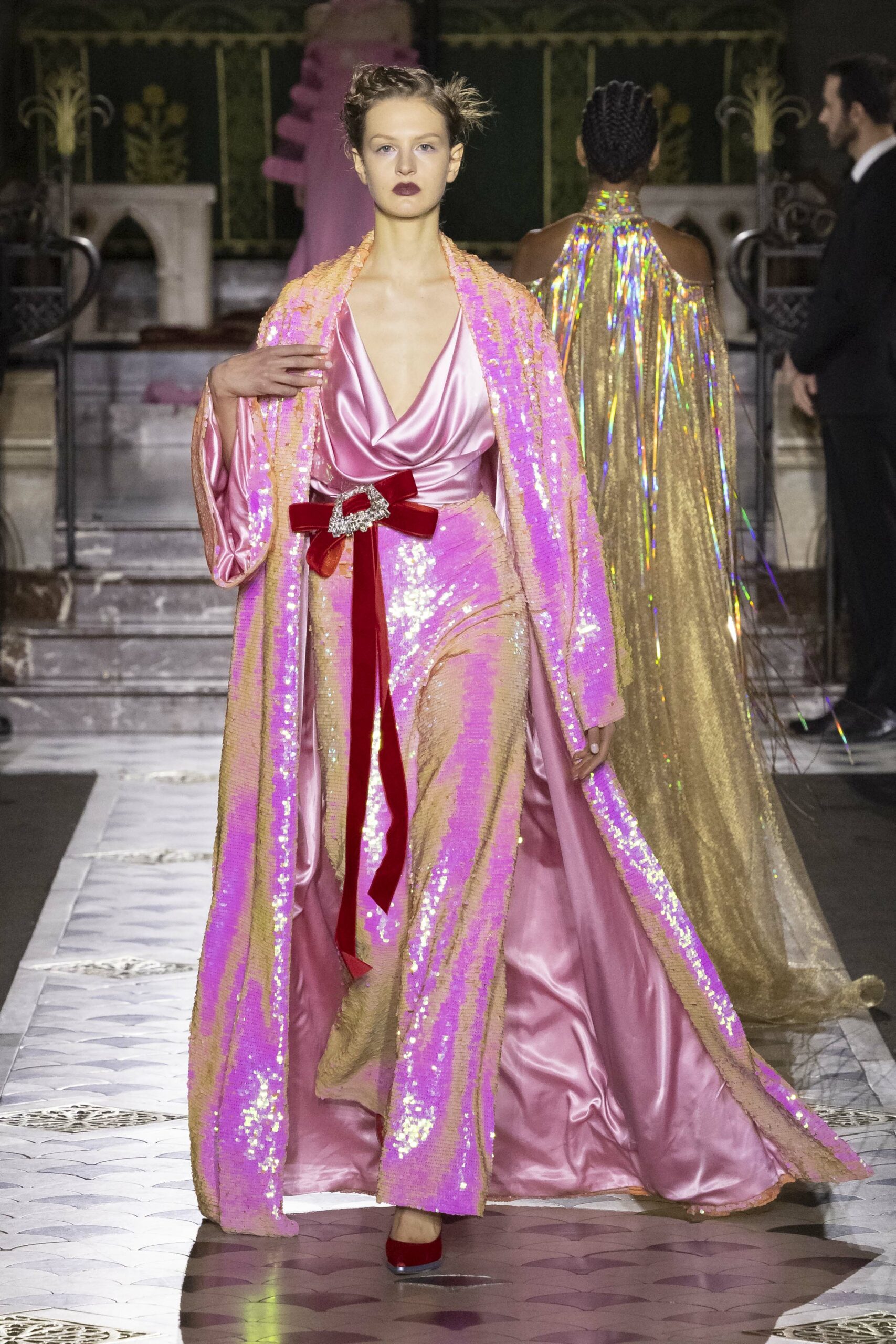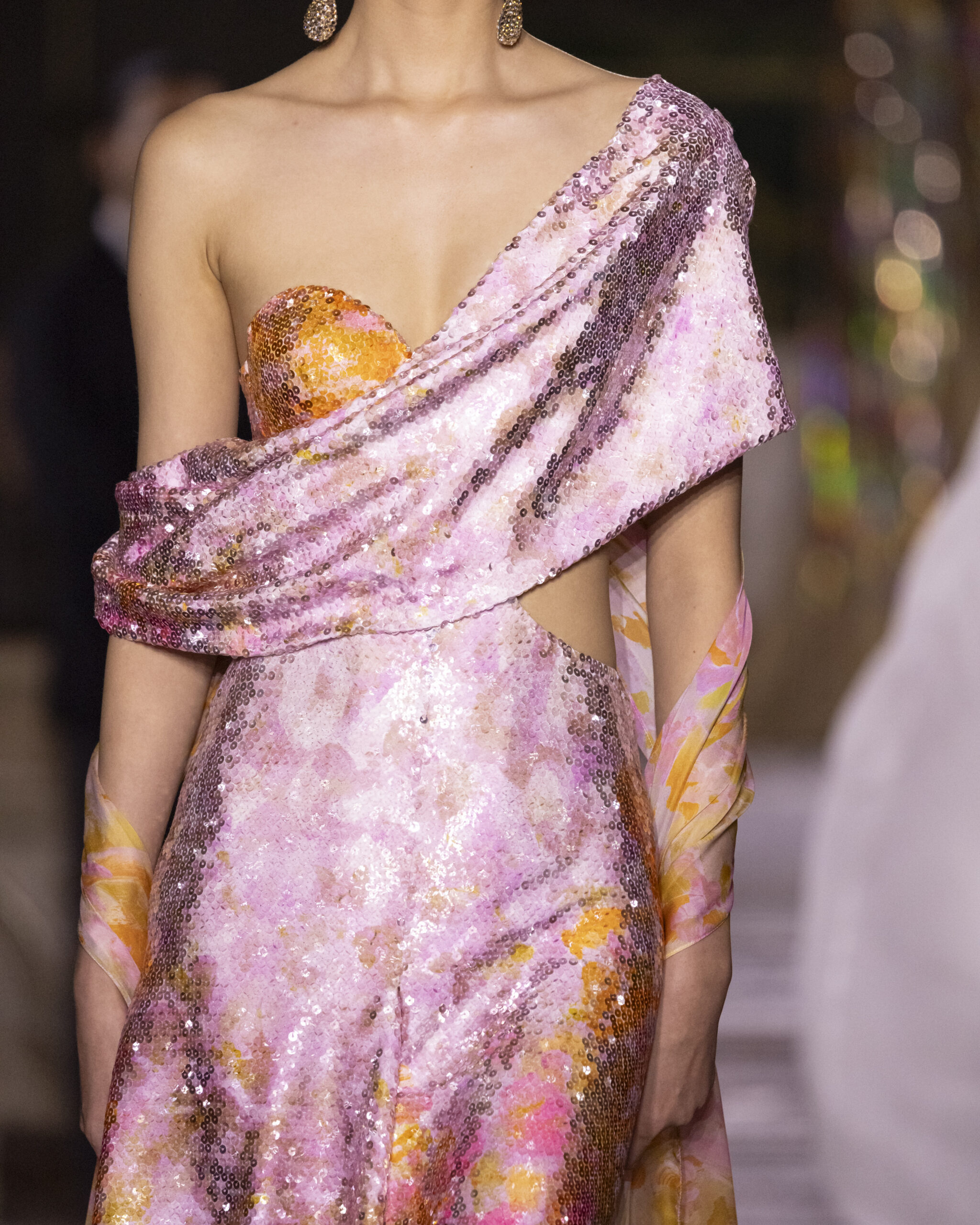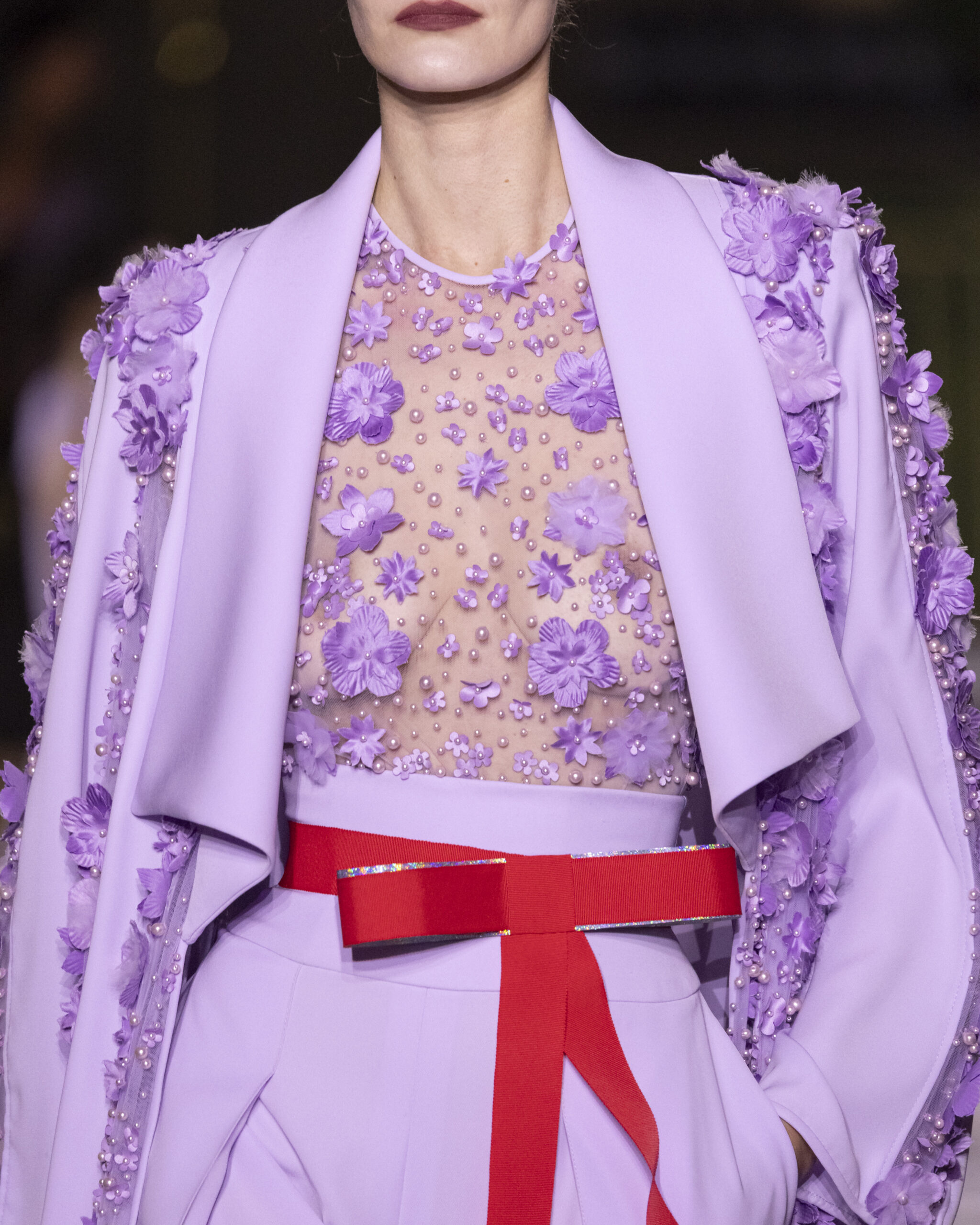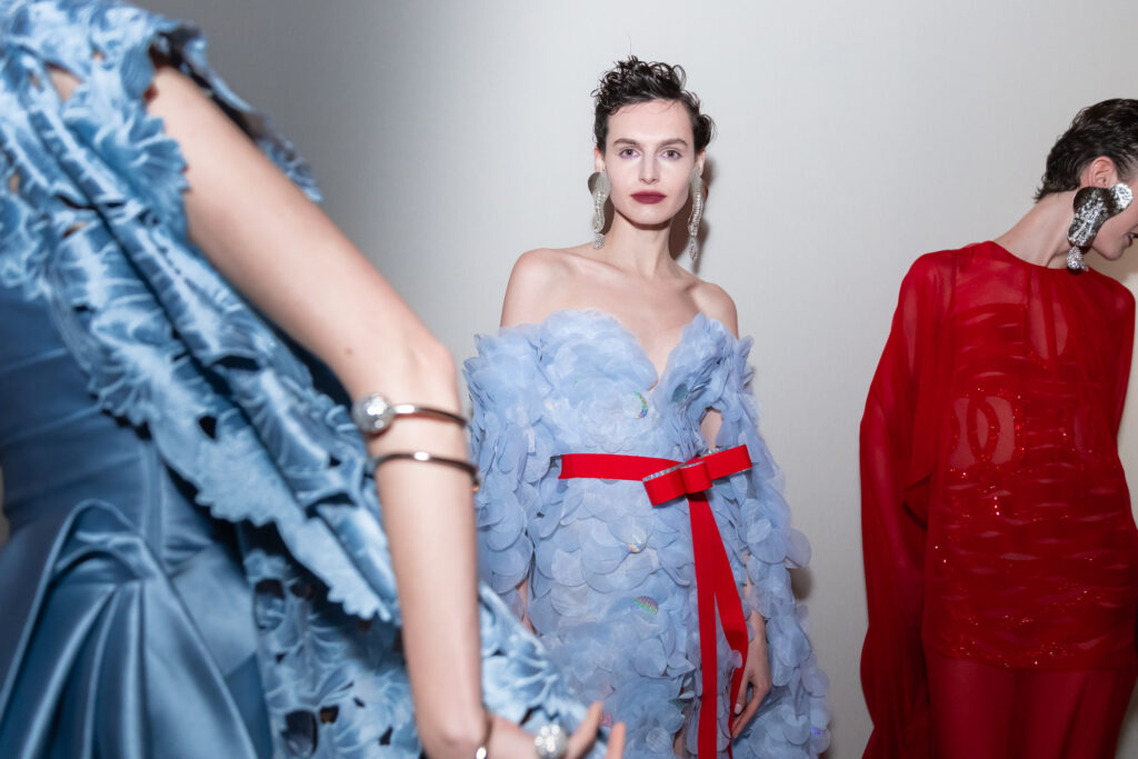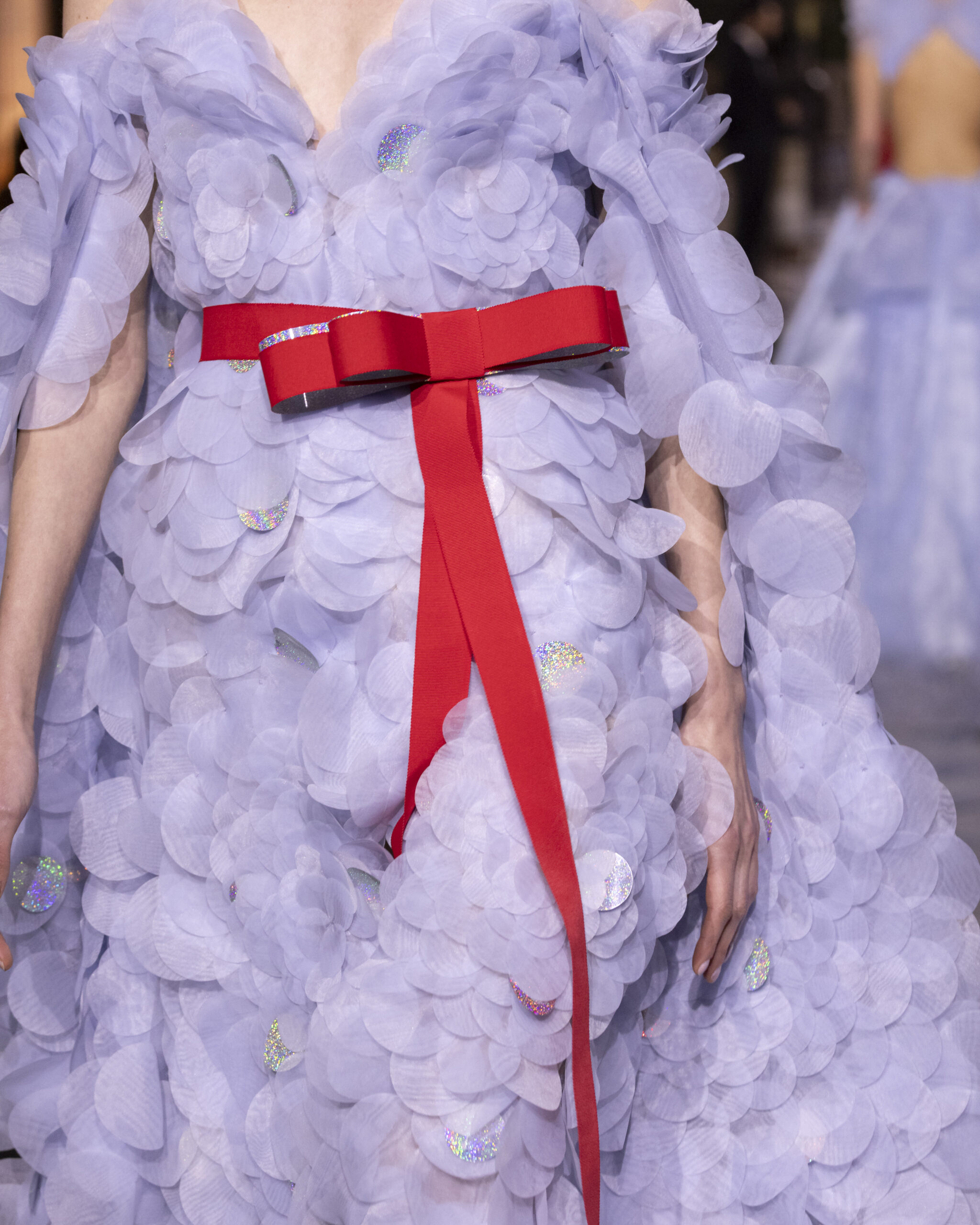 Des notes radieuses d’or et d’argent résonnent aux côtés d’une palette de pastels froids – des nuances éthérées de blanc, de bleu givré, de carnation, de rose et de lilas. La présence constante de carmin à travers la collection sert de force unificatrice audacieuse. Chaque création tisse sa propre histoire sur le podium, offrant une célébration immersive de l’extraordinaire et un voyage vibrant à travers les royaumes de la magie et de l’élégance intemporelle.