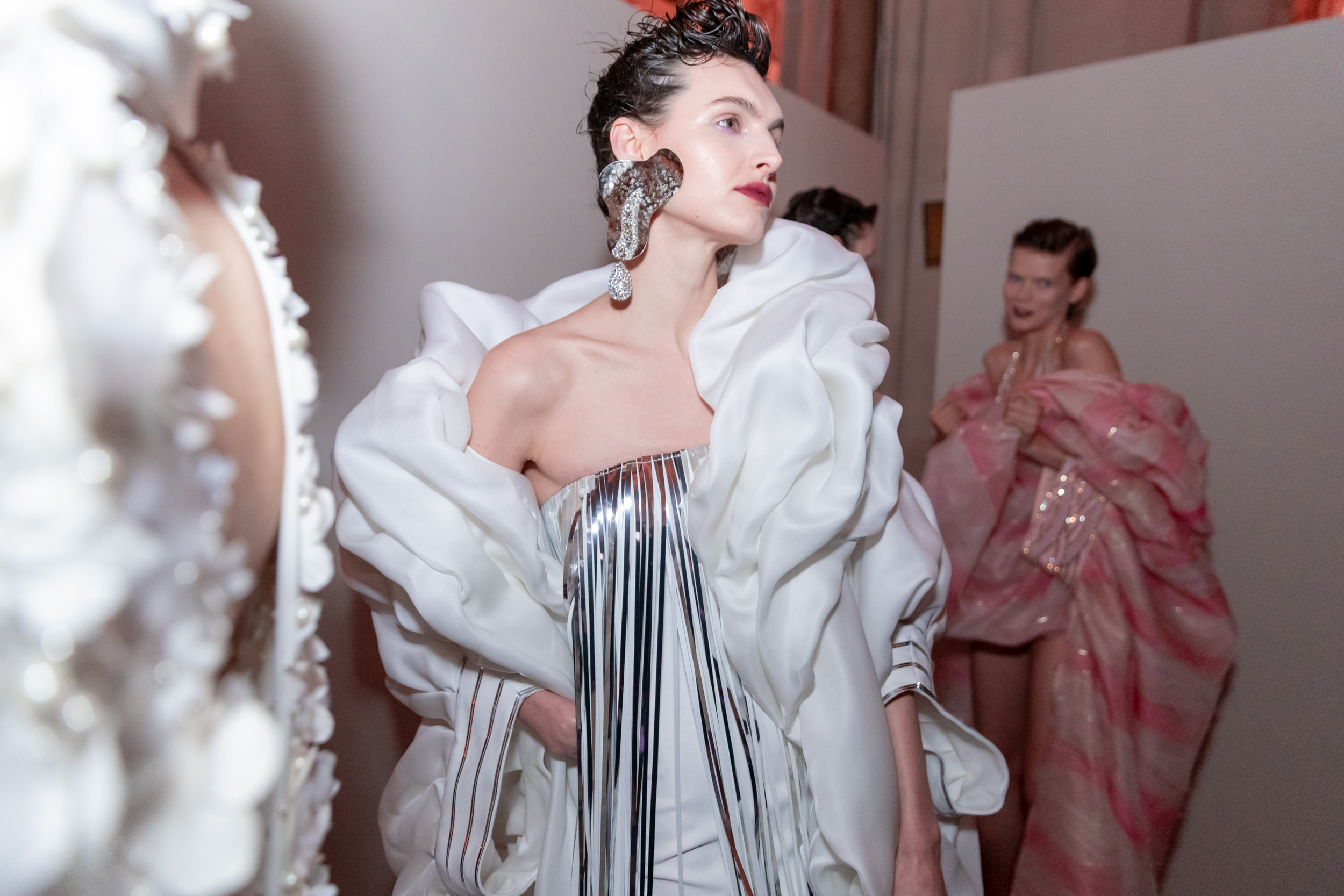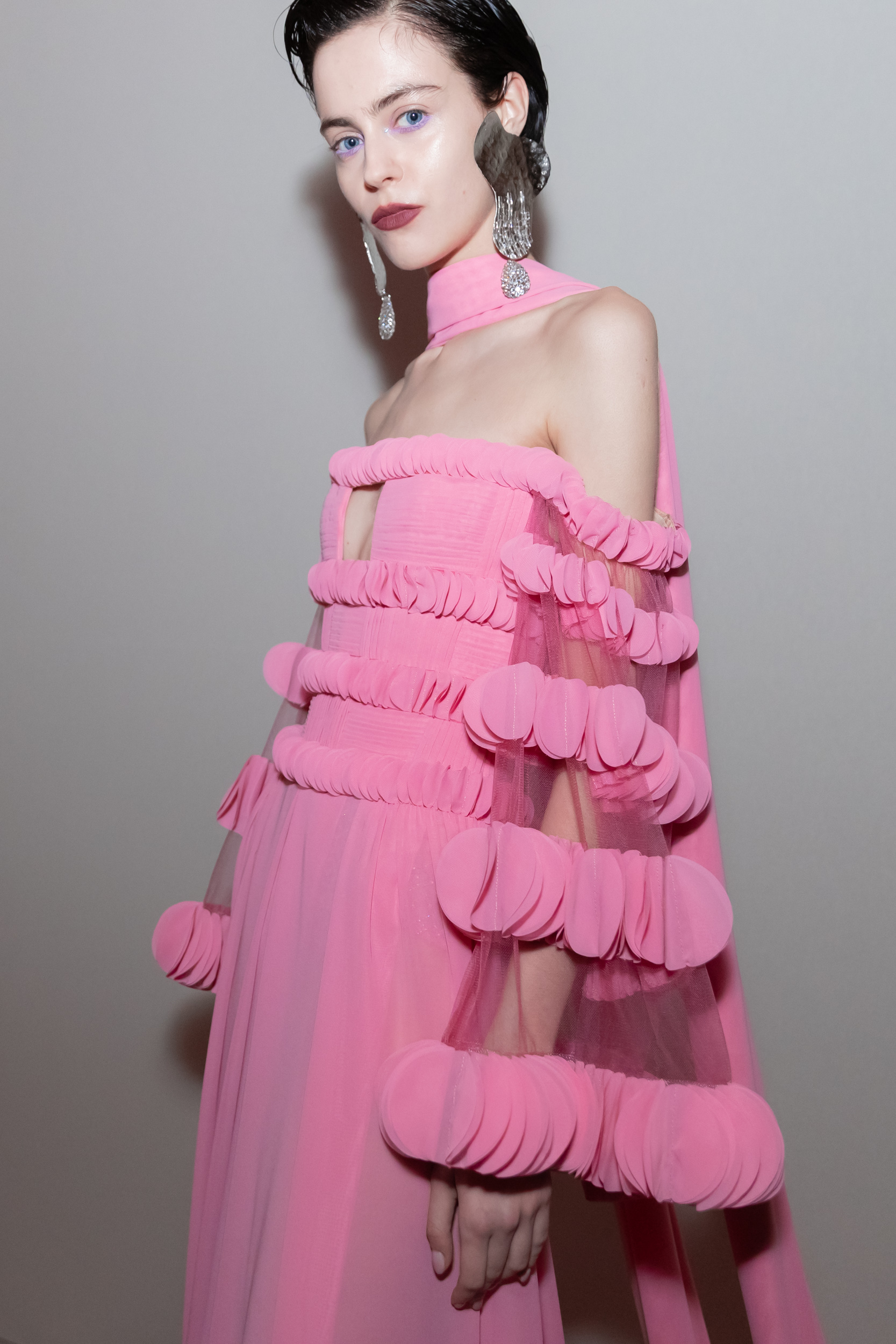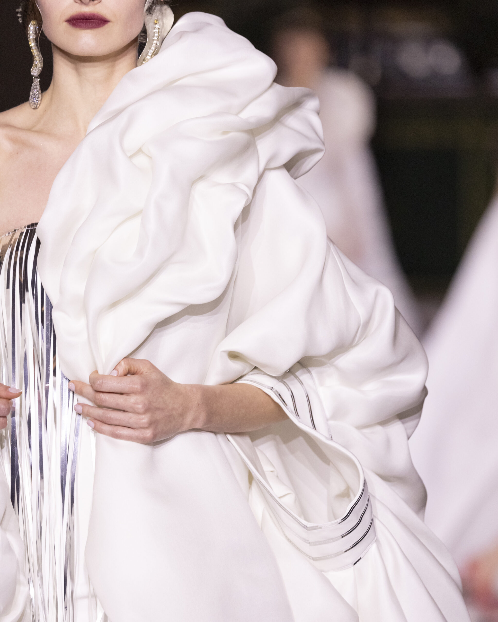 Le récit enchanteur et les éléments d’un autre monde s’entremêlent harmonieusement dans le tissu de la collection, offrant une sélection de matériaux qui éveille les émotions et déploie un paysage de rêve. Le spectre de couleurs comprend des satins irisés, des mousselines diaphanes et des drapés duchesse, soulignant l’élégance discrète, la sophistication structurée des manteaux longs, l’attention portée à la précision architecturale et les pièces sculpturales volumineuses qui repoussent les limites de la forme.