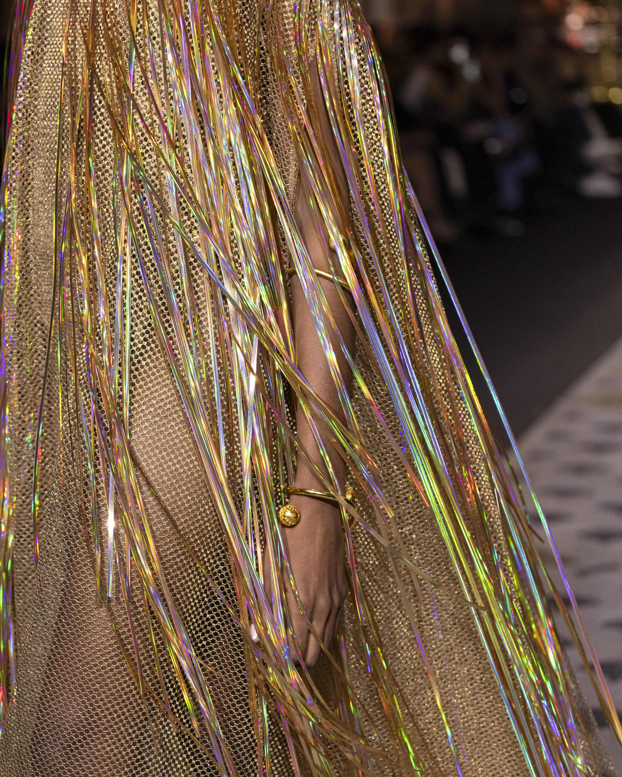 Dans cette collection, Georges Chakra célèbre l’opulence et fait écho à l’influence de l’Art Deco, une esthétique qui traverse le temps. Des motifs géométriques, des lignes audacieuses et des ornements somptueux reflètent la sophistication visuelle caractéristique de cette époque artistique prolifique. L’association du réalisme magique avec l’Art Deco agit comme une pierre angulaire intemporelle, rehaussant le récit et contribuant à la richesse visuelle de chaque pièce de haute couture.
