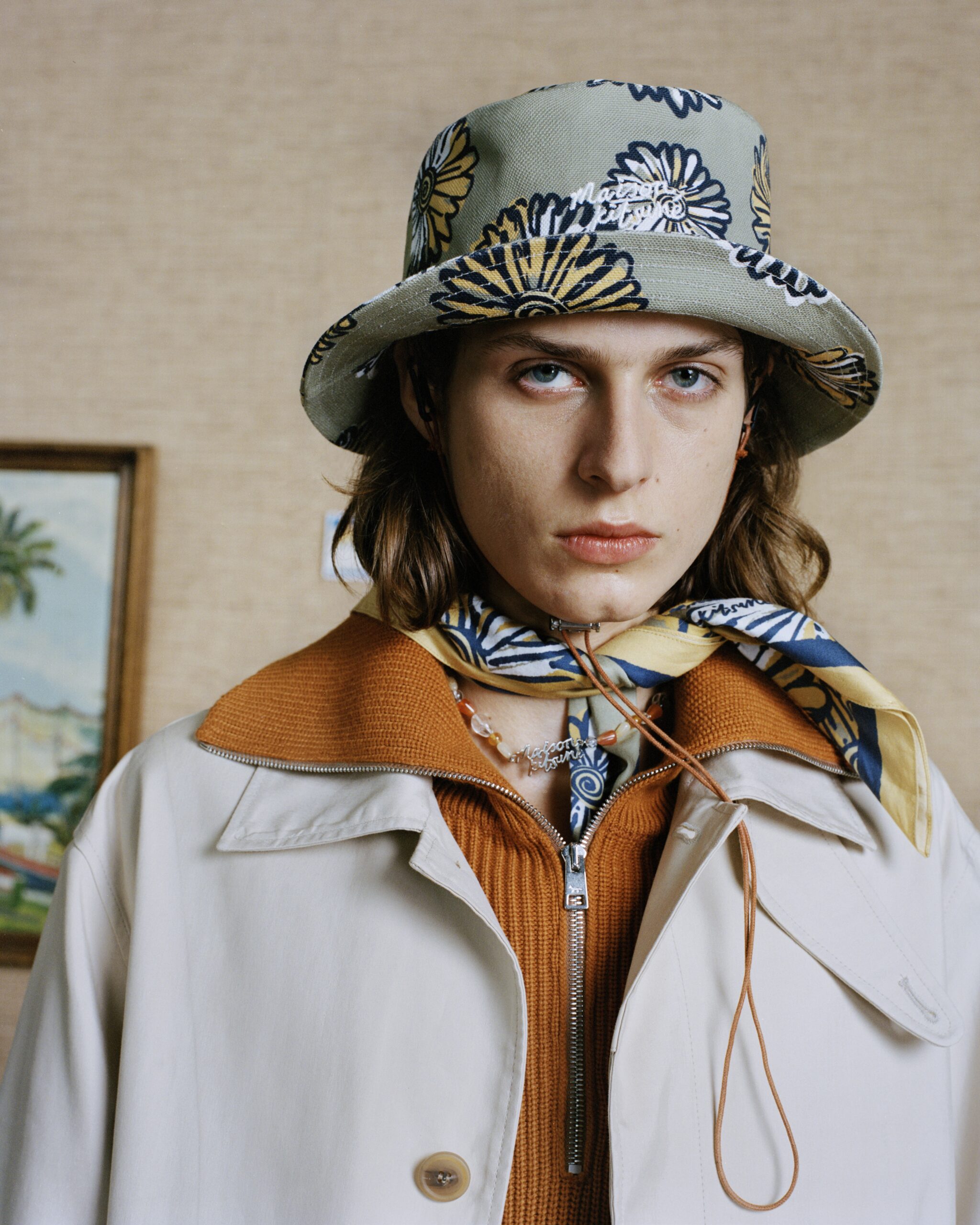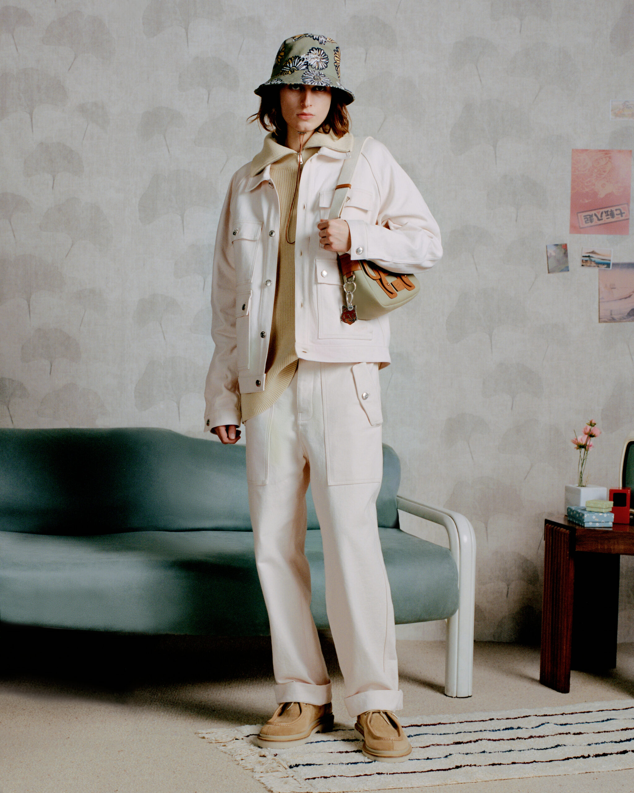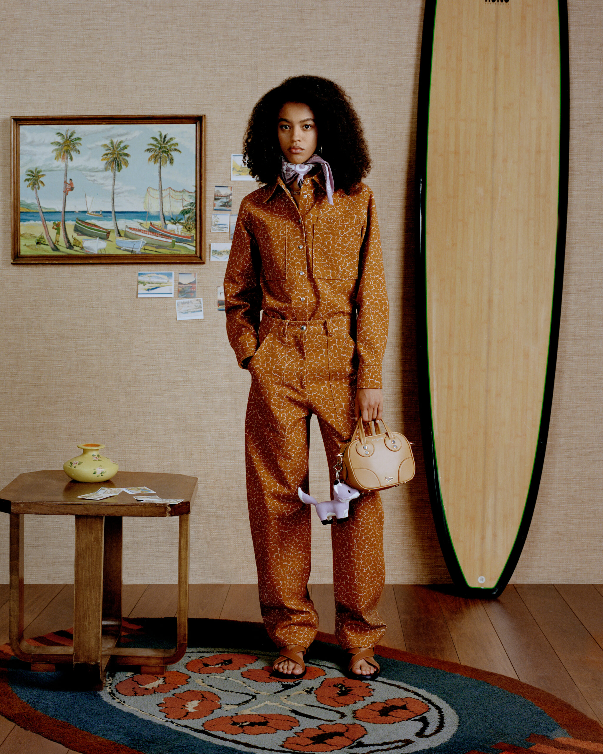 Poursuivant sur les routes, la collection s’imprègne de l’esprit californien avec des imprimés fleuris psychédéliques, des tricots en mérinos, et des vêtements de travail vintage. Les silhouettes raffinées fusionnent avec les coupes actuelles, évoquant un univers de road trip où stations-services et motels influencent les couleurs de la collection.