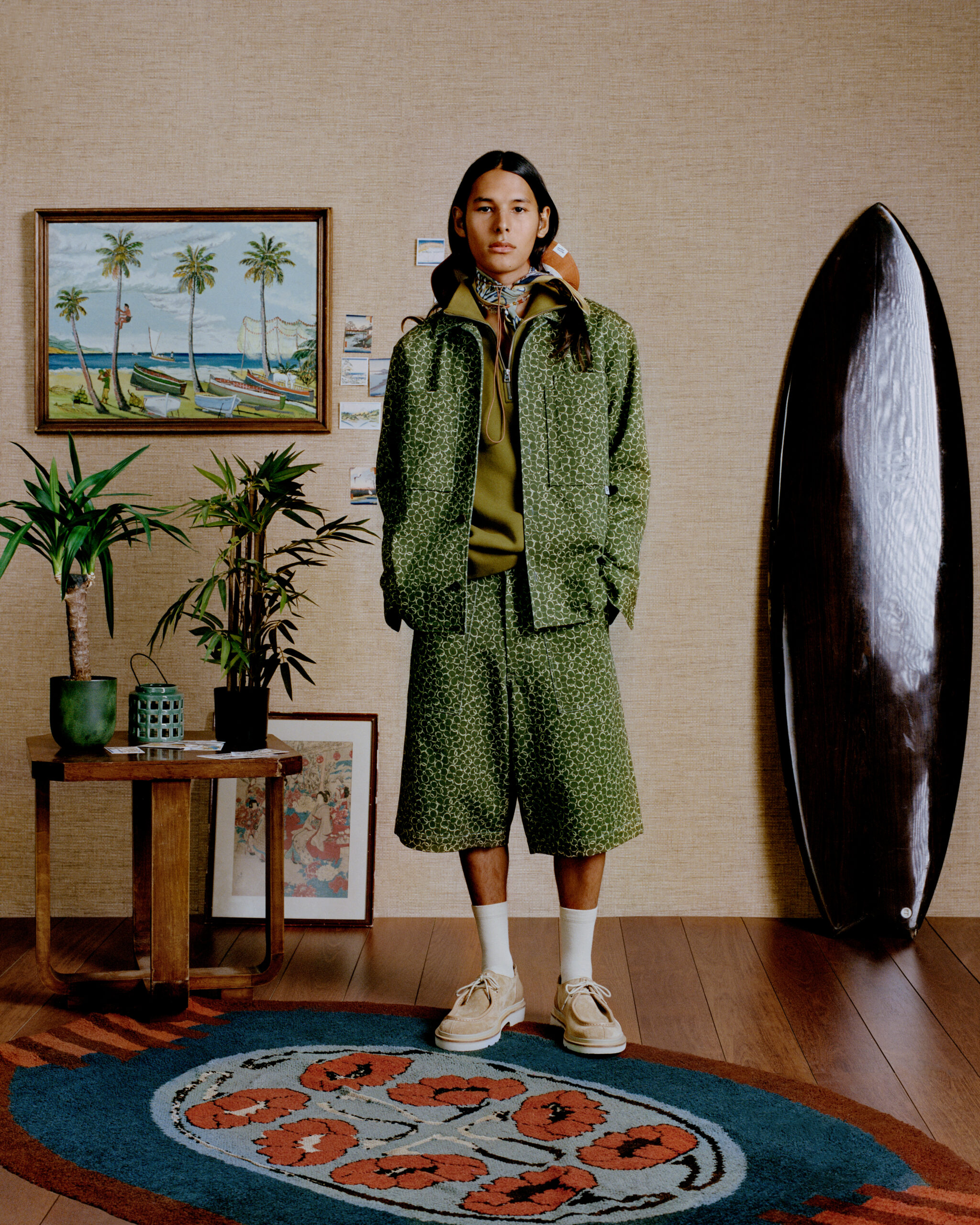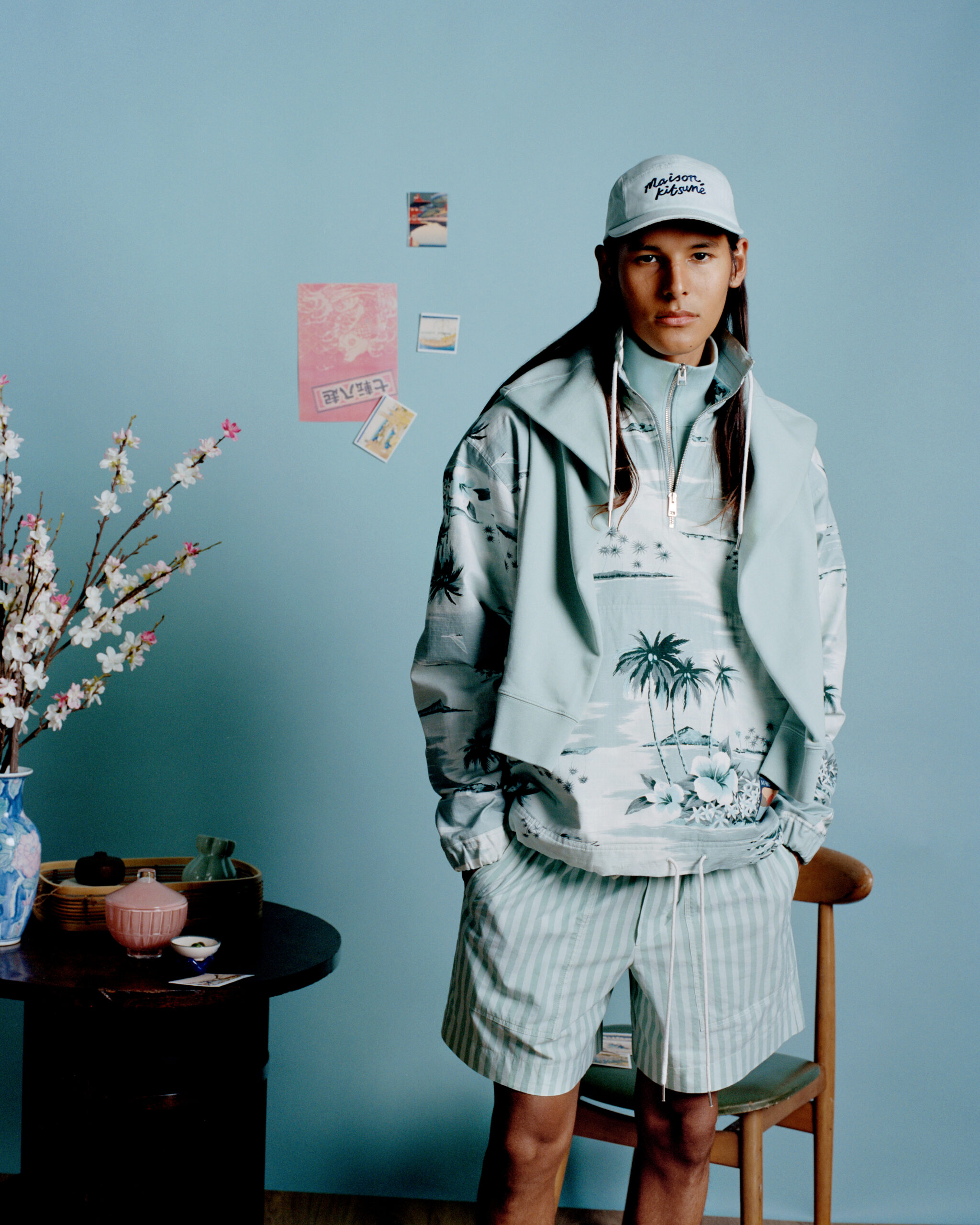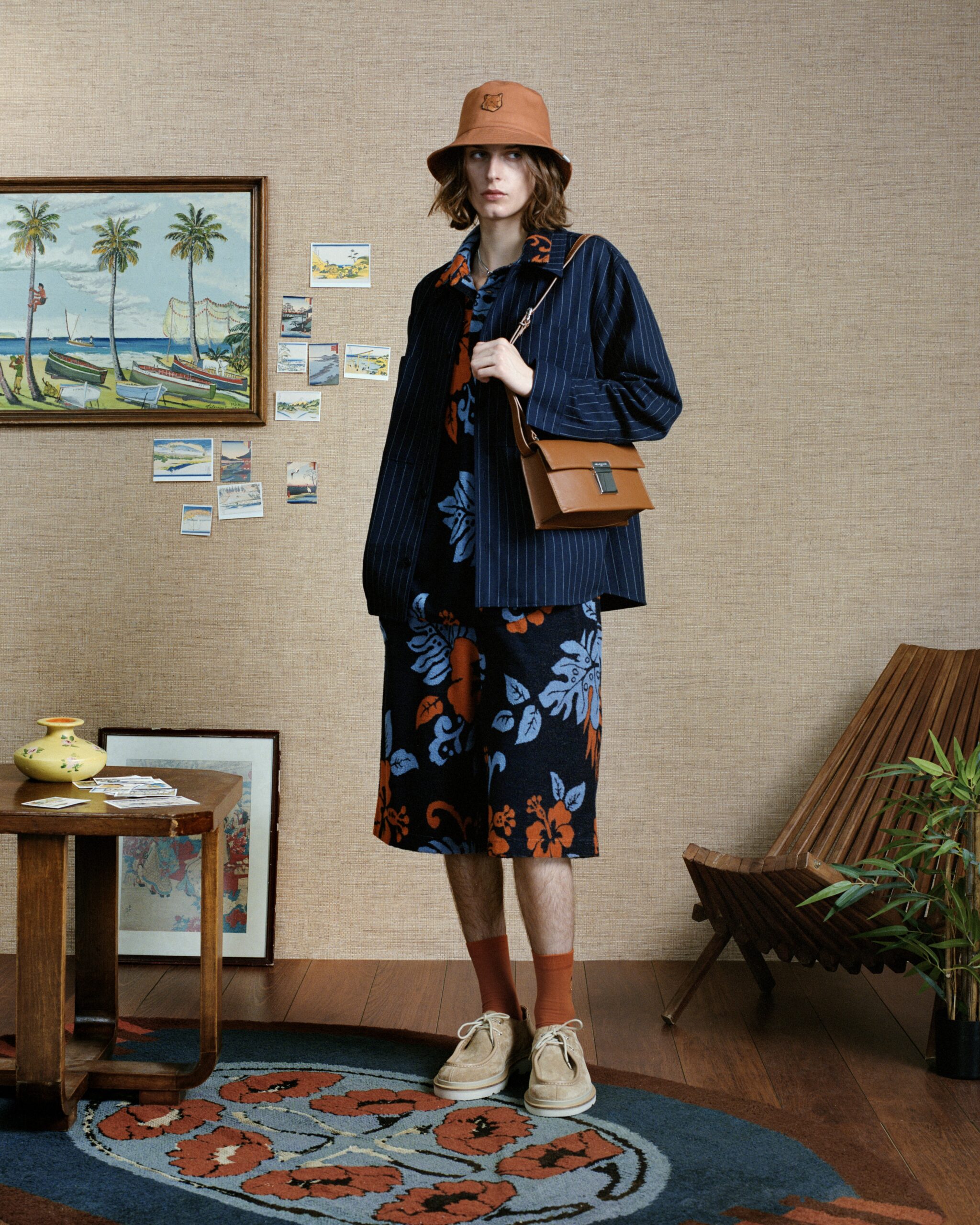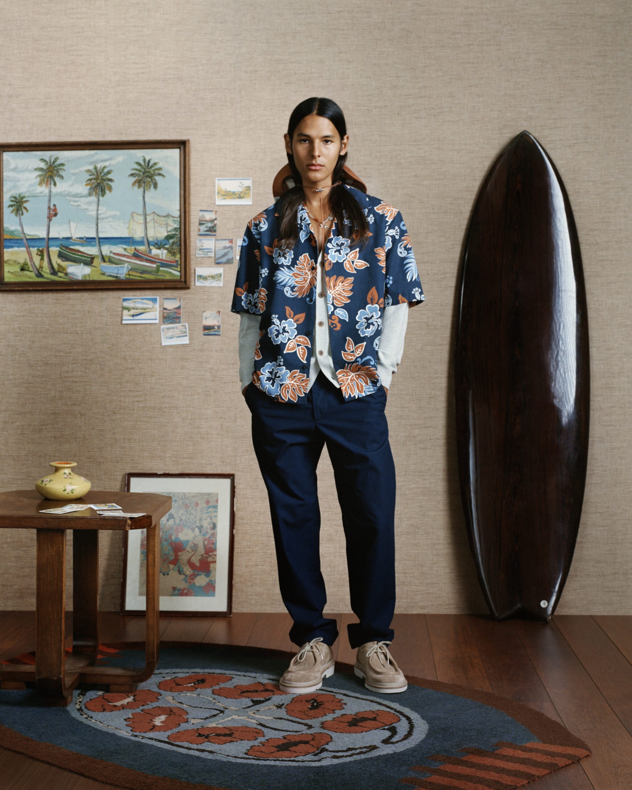 La collection se clôt sous les tropiques à Hawaï. Des tissus légers, des chemises en voile transparent, et des shorts en coton lavé se parent de motifs nénuphars et de cartes postales paradisiaques. L’image de la saison est teintée de bleu écume et d’orange coucher de soleil.