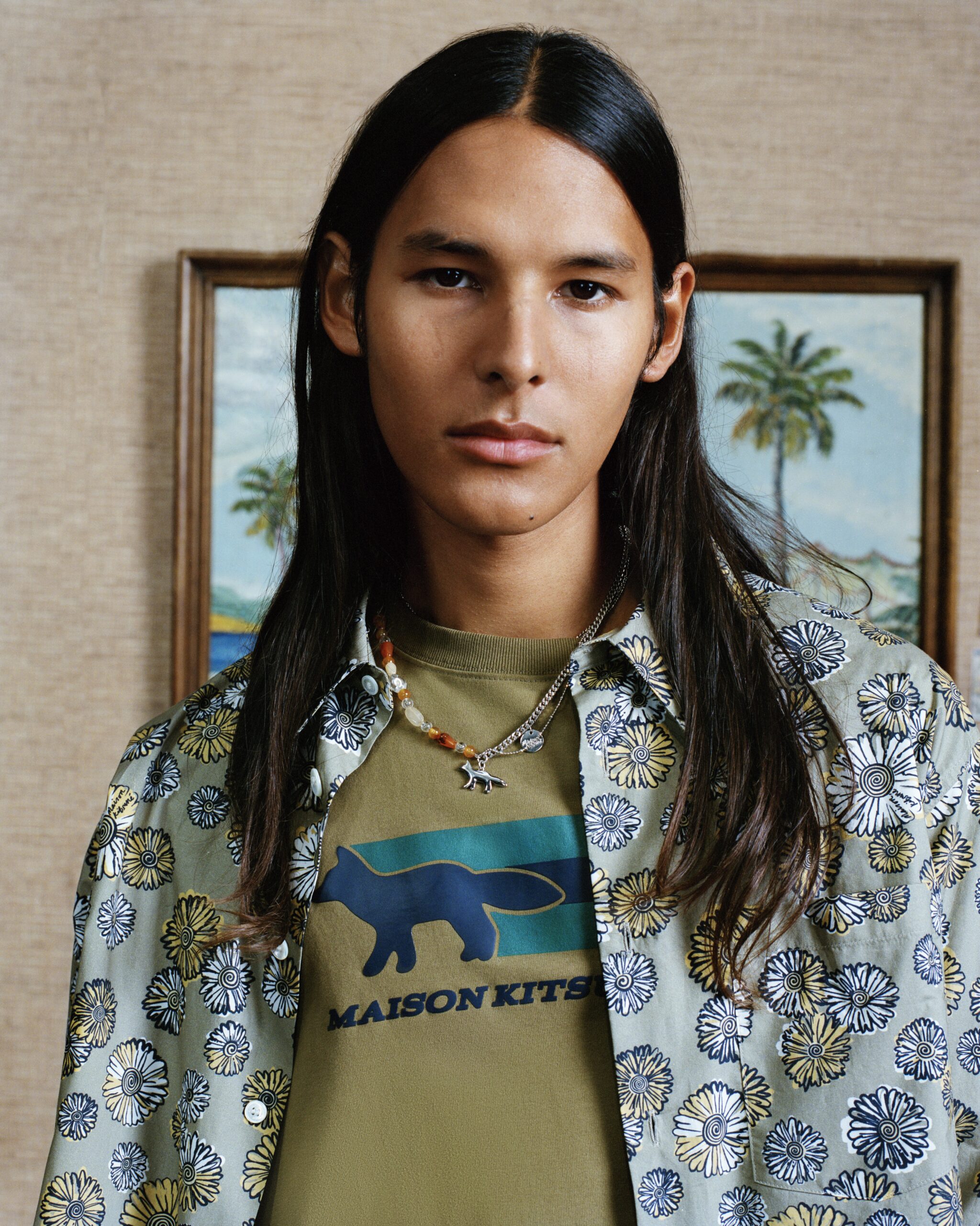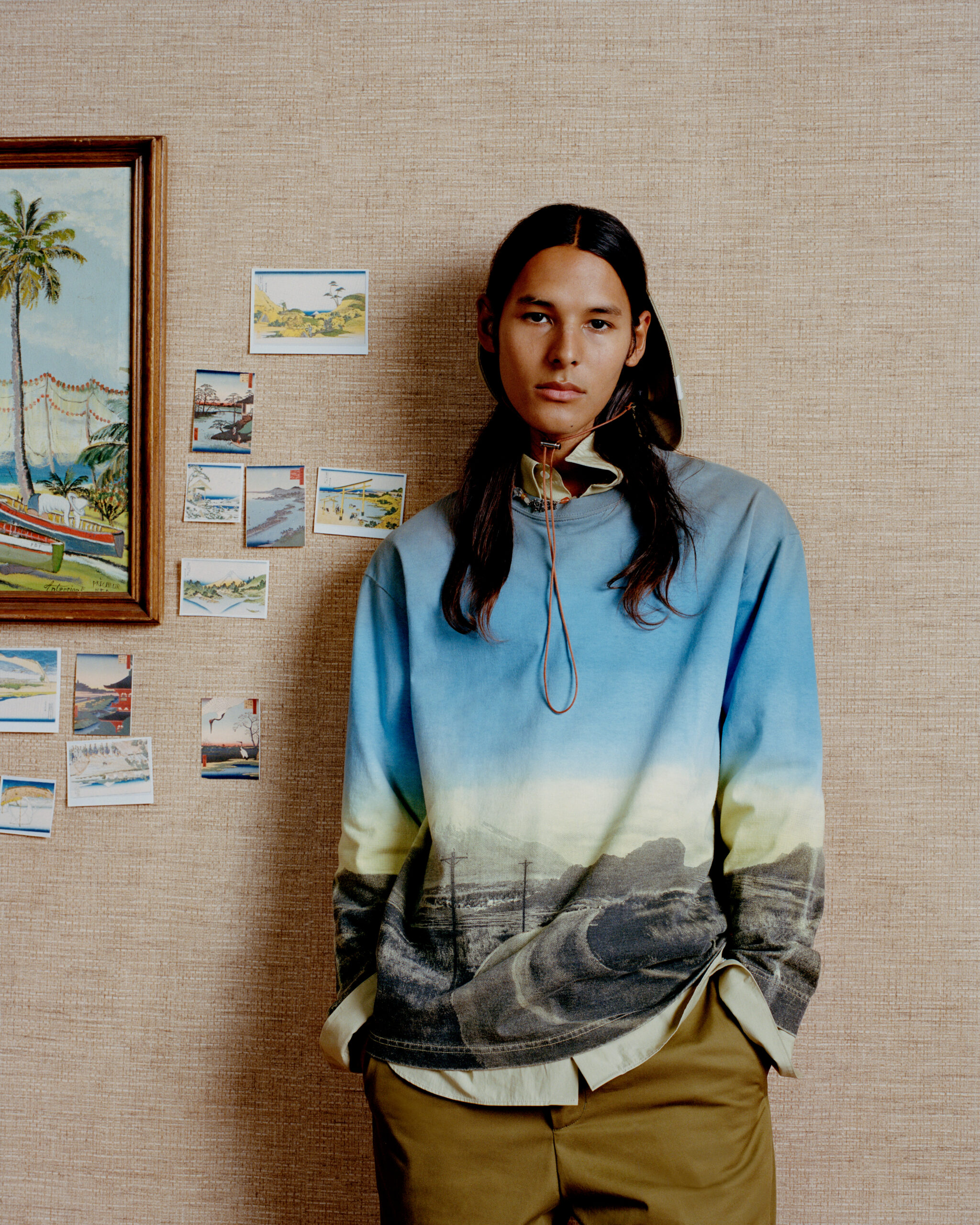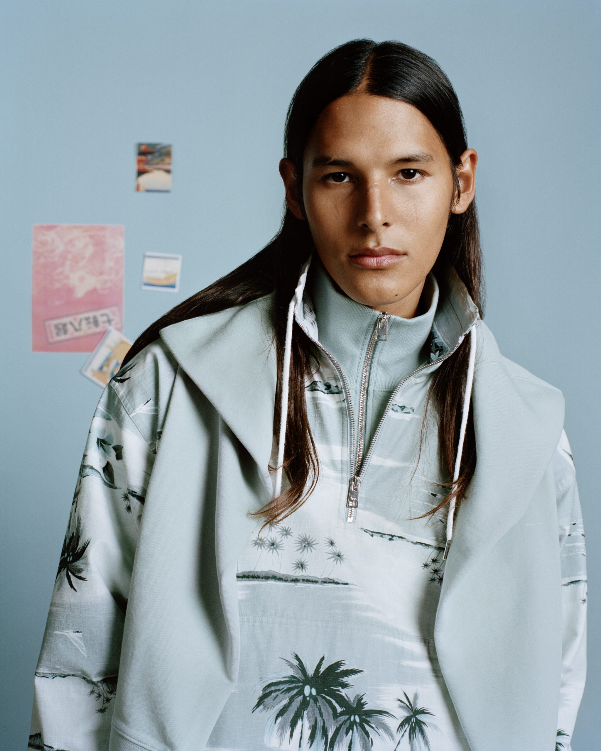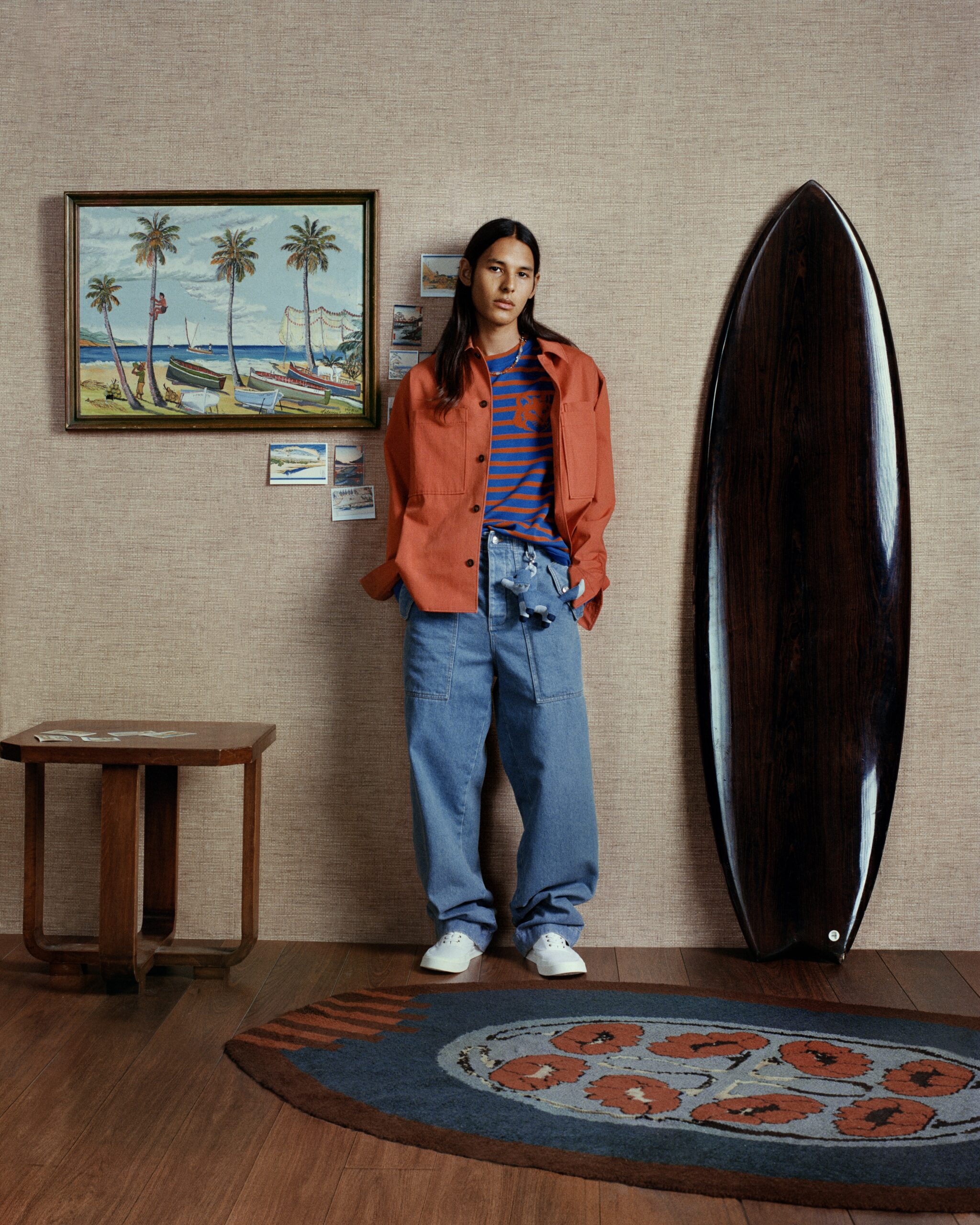 La collection se clôt sous les tropiques à Hawaï. Des tissus légers, des chemises en voile transparent, et des shorts en coton lavé se parent de motifs nénuphars et de cartes postales paradisiaques. L’image de la saison est teintée de bleu écume et d’orange coucher de soleil.