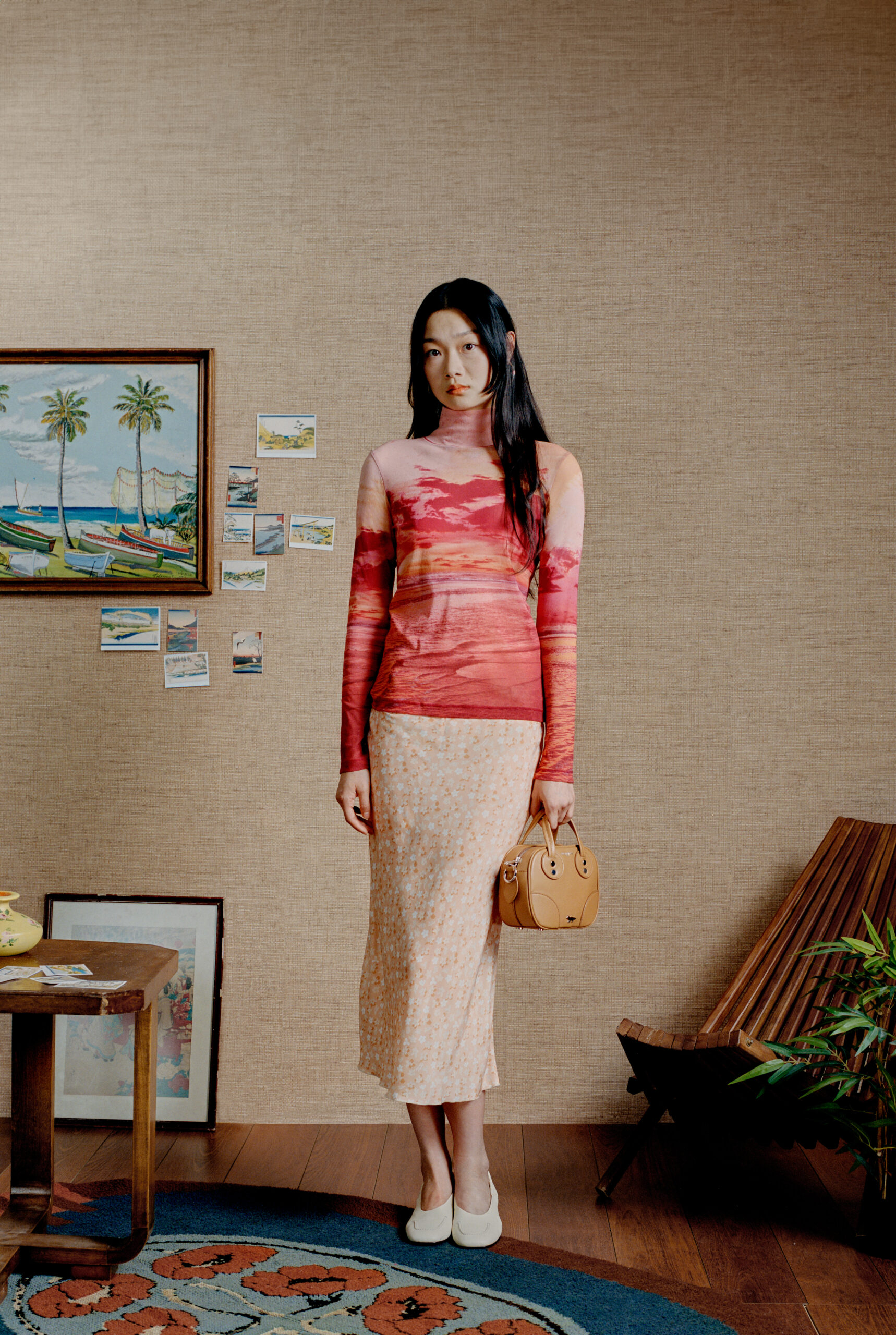 Sur la côte, l’ambiance d’un coucher de soleil colore un vestiaire surfwear axé années 90. Chemises oversize, claquettes, sandales à bout carré, et petites robes à bretelles conjuguent style décontracté et simplicité. The Cloud, le nouveau sac baguette en cuir souple, avec ses teintes pastel, illumine cette atmosphère estivale.