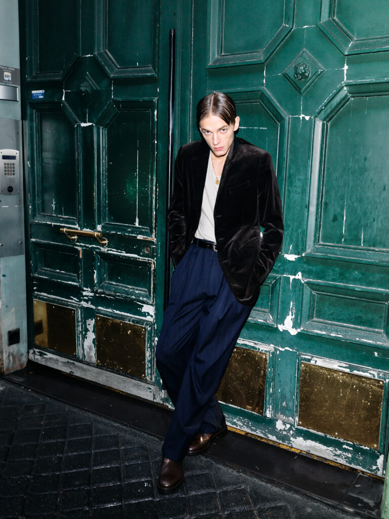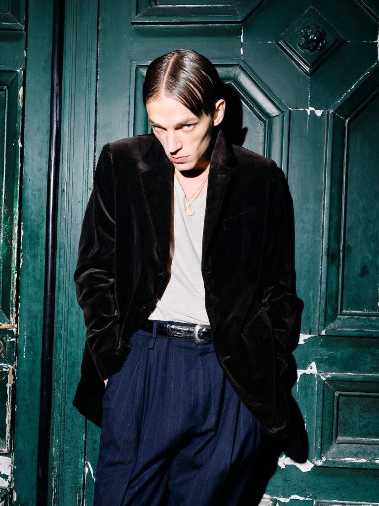 Dans cette collection, le designer souhaite raconter l’âme sartoriale de la sous-culture gypsy à travers un mélange de couleurs, de matériaux et de proportions contrastées, revisitées à travers le regard d’aujourd’hui. Les costumes en laine à fines rayures brunes, les velours japonais, les vestes de smoking en mohair avec revers en soie lavée, après avoir été lavés, se marient avec des chemises en toile de coton brut et des tissus texturés évoquant les cultures balkaniques, ainsi que des débardeurs en somptueux cachemire lavé. La palette de couleurs varie des tons naturels de l’ivoire au brun chocolat, en passant par le bleu, jusqu’au noir profond.