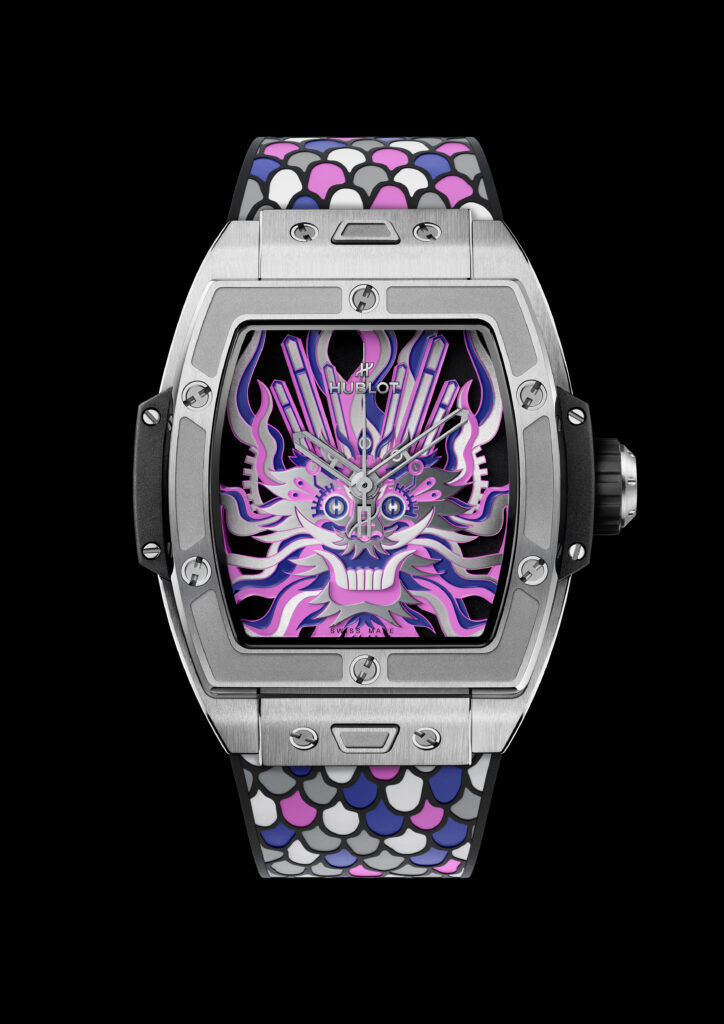 Habillée d’un boîtier titane satiné poli abritant le mouvement HUB1710, cette montre dévoile un cadran multi-niveaux reflétant l’art ancestral du papier découpé. Grâce à la technique innovante de l’artiste chinois Chen Fenwan, aiguilles, roues et vis dessinent en 3D la silhouette majestueuse d’un dragon oriental, incarquant force et sagesse.