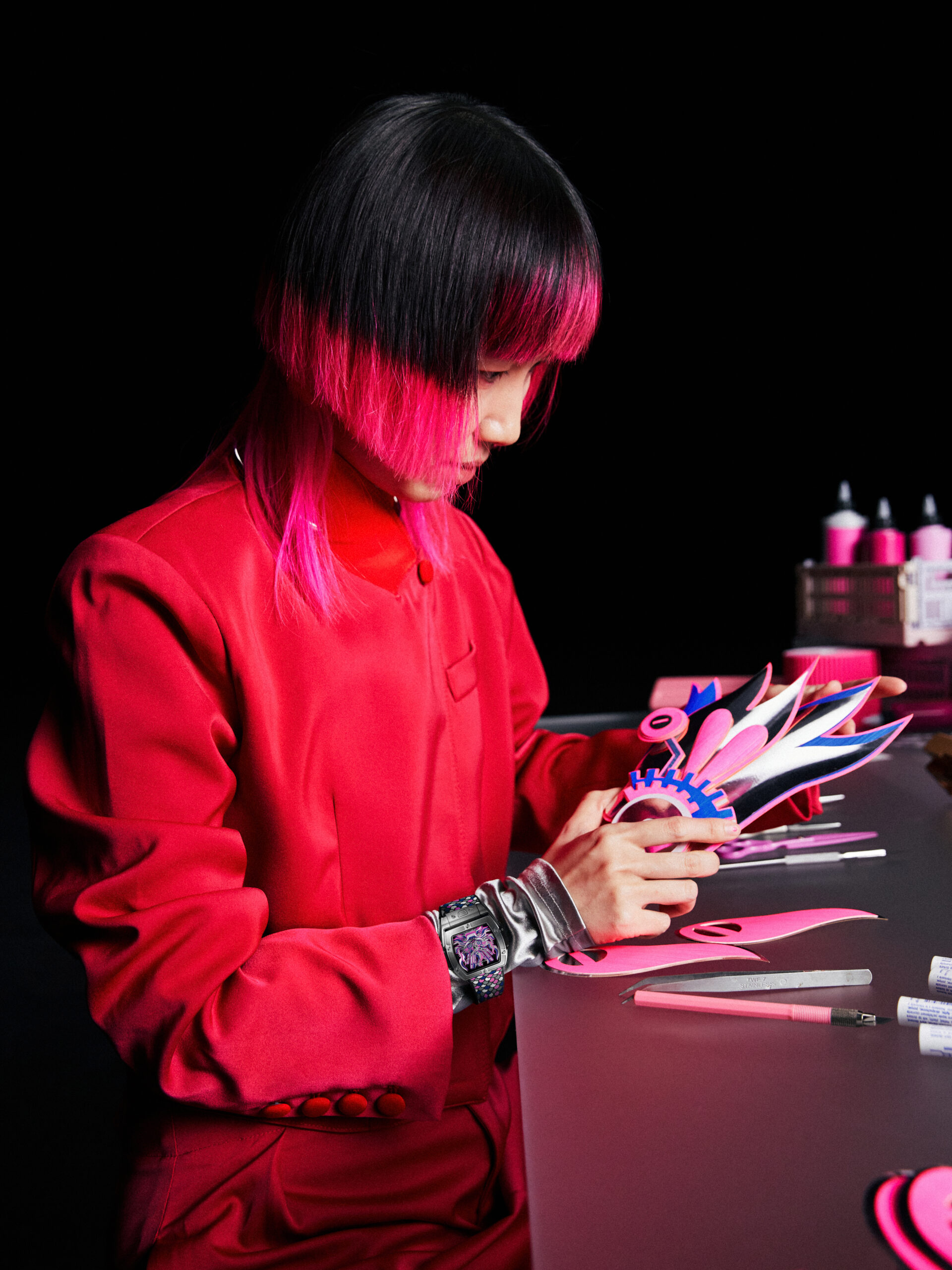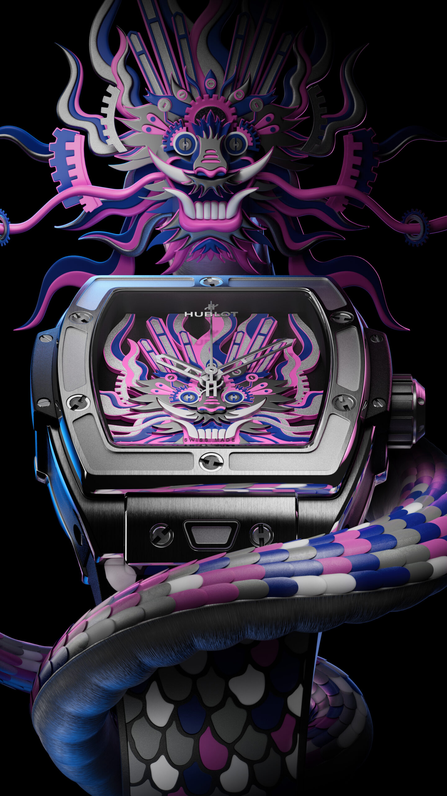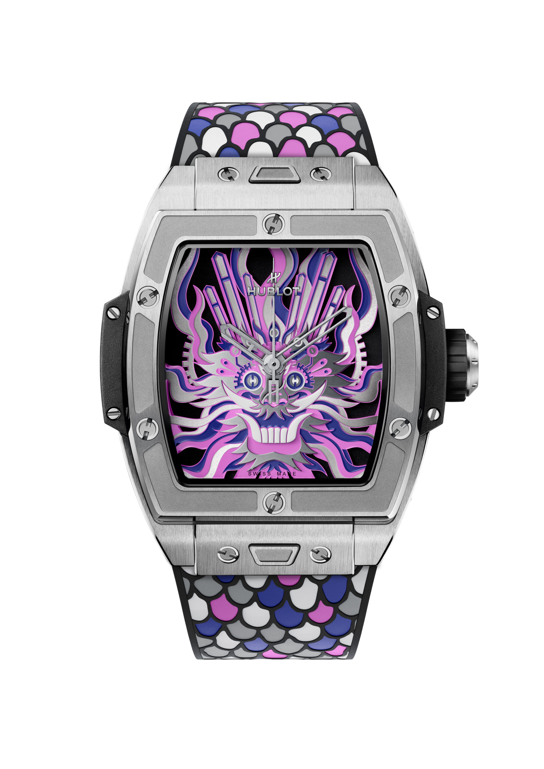 Habillée d’un boîtier titane satiné poli abritant le mouvement HUB1710, cette montre dévoile un cadran multi-niveaux reflétant l’art ancestral du papier découpé. Grâce à la technique innovante de l’artiste chinois Chen Fenwan, aiguilles, roues et vis dessinent en 3D la silhouette majestueuse d’un dragon oriental, incarquant force et sagesse.