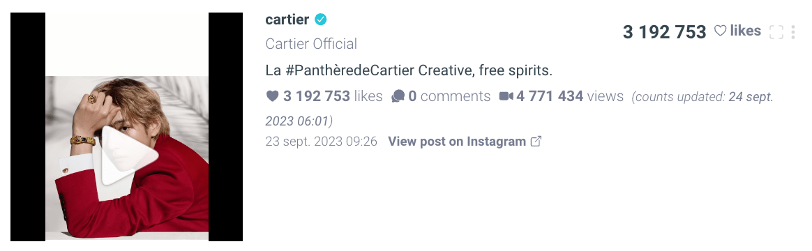 Cette année a été marquée par une adoption accrue des codes des réseaux sociaux par les marques de luxe. Le phénomène de la K-Pop a joué un rôle significatif, avec des collaborations comme celle entre Cartier et le chanteur THV, qui a attiré 3,1 millions de likes sur un Reel de Cartier.
