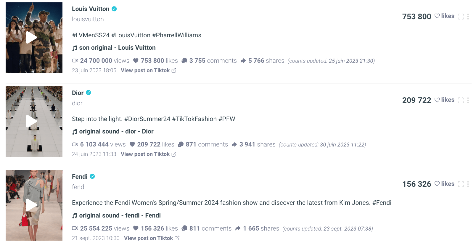 TikTok est devenu un terrain de jeu privilégié pour les maisons de luxe, transformant la plateforme en un véritable catwalk numérique. Les internautes ont ainsi eu le rôle d’invités virtuels à des événements de mode exclusifs. Louis Vuitton, par exemple, a suscité un grand intérêt lors du défilé de son créateur Pharrell Williams, générant 45% des likes du mois de juin sur TikTok.