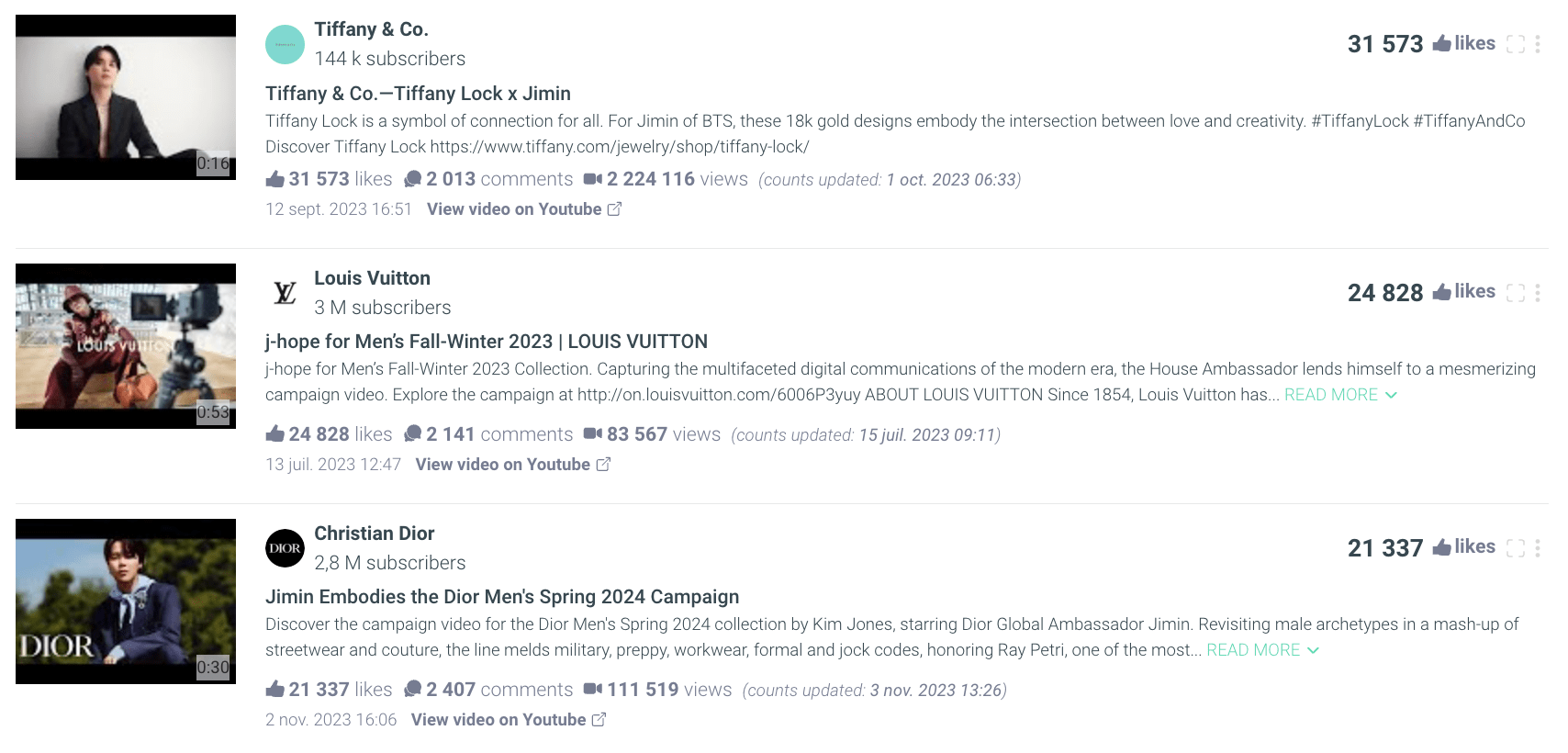 Sur YouTube, les formats courts sont devenus le chouchou des maisons de luxe. La majorité des vidéos publiées par ces marques durent moins d’une minute. Ces spots publicitaires concis mais impactants, comme ceux de Tiffany & Co, Louis Vuitton et Dior, ont excellé en capturant l’attention du public.
