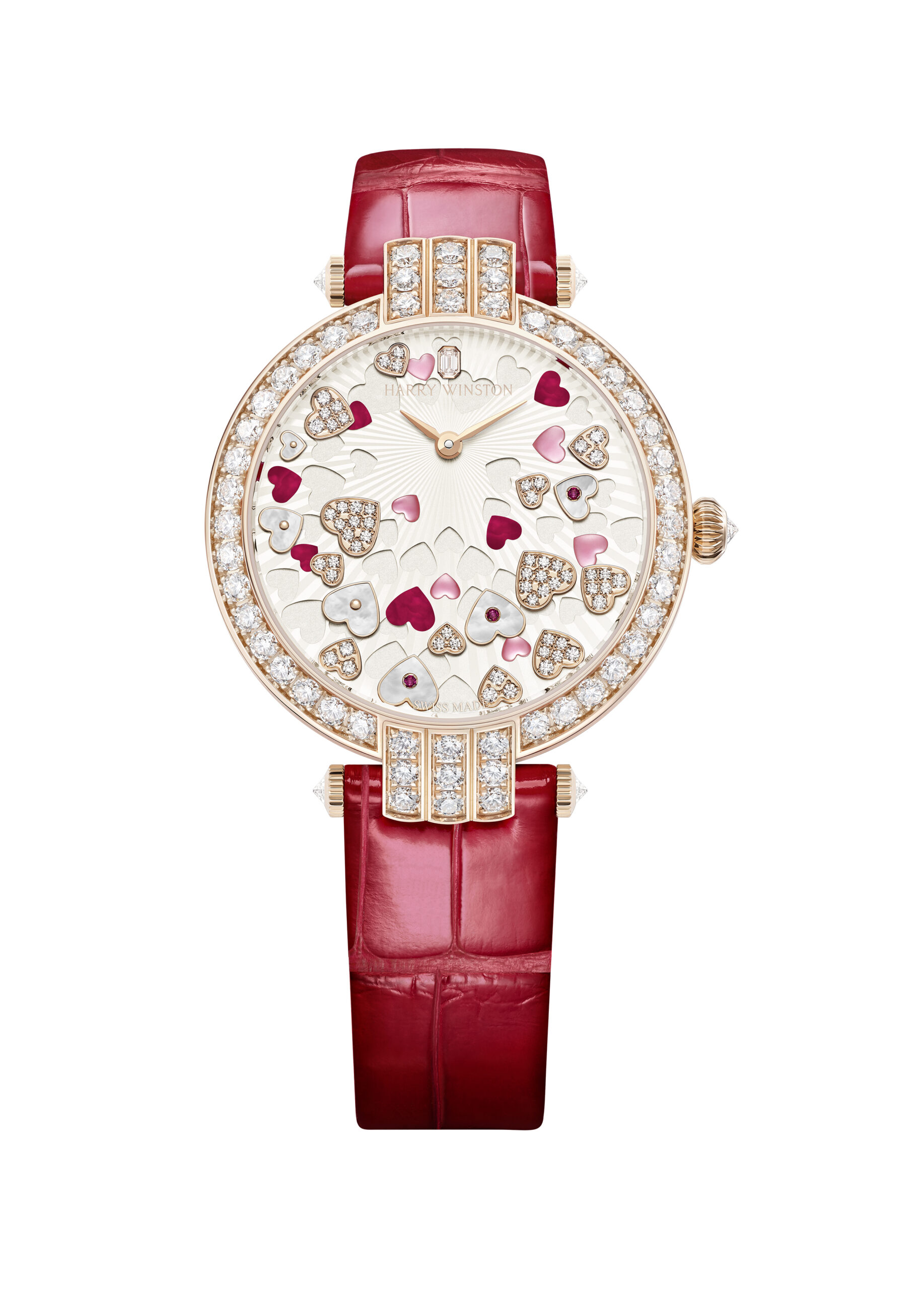 La pièce maîtresse de cette montre est sans doute son cadran. Inspiré par la passion amoureuse et la féérie des feux d’artifice, il représente un spectacle éblouissant de cœurs en diamant, pierres précieuses et nacre. Chaque détail du cadran a été pensé pour évoquer la magie de l’amour. Les cœurs de différentes tailles, couleurs et matériaux semblent danser sur le cadran opalin couleur argent, créant une impression de relief et de mouvement. Cette métaphore visuelle du feu d’artifice amoureux n’est pas seulement un exploit artistique, mais aussi une démonstration de l’habileté technique de la maison Harry Winston.