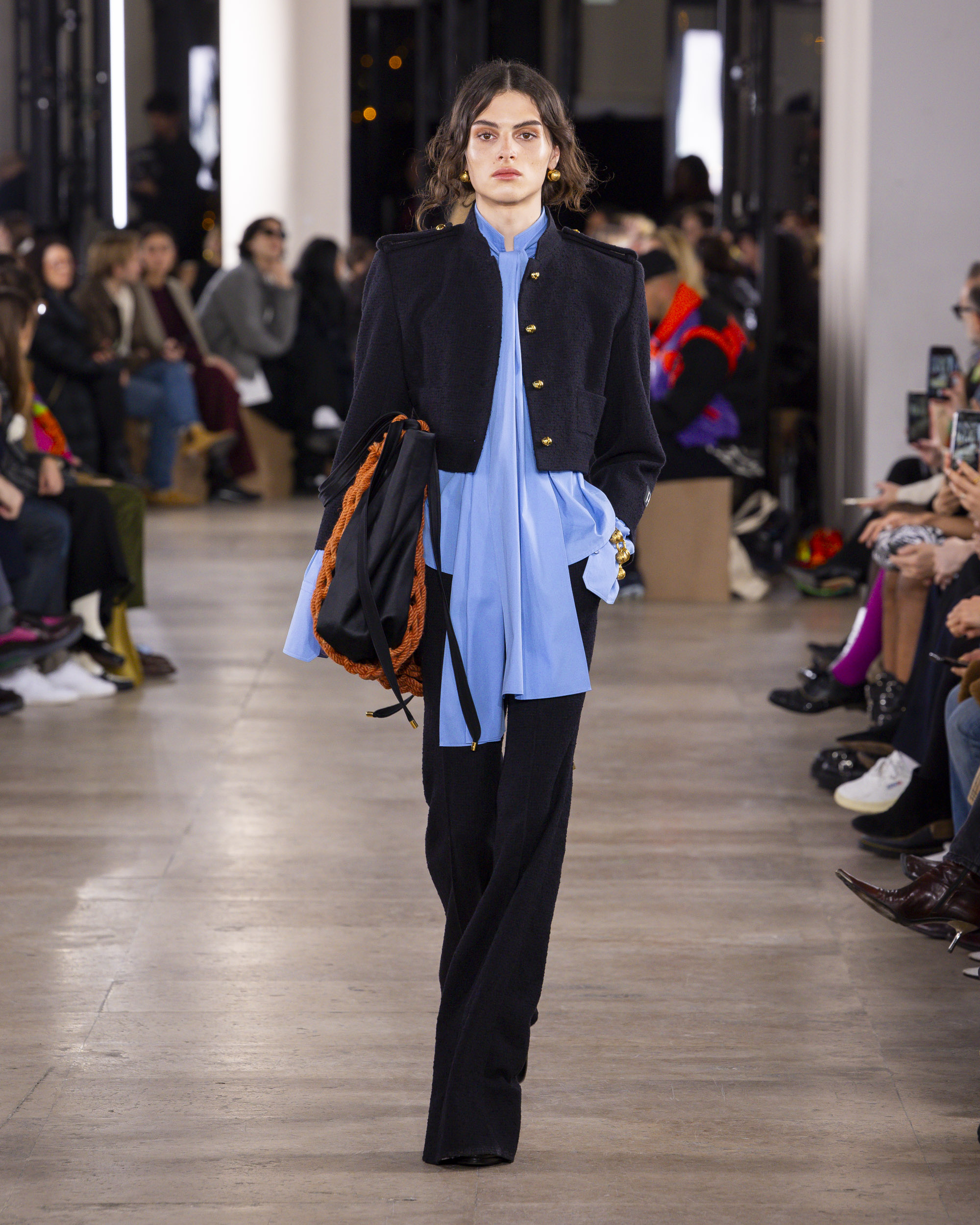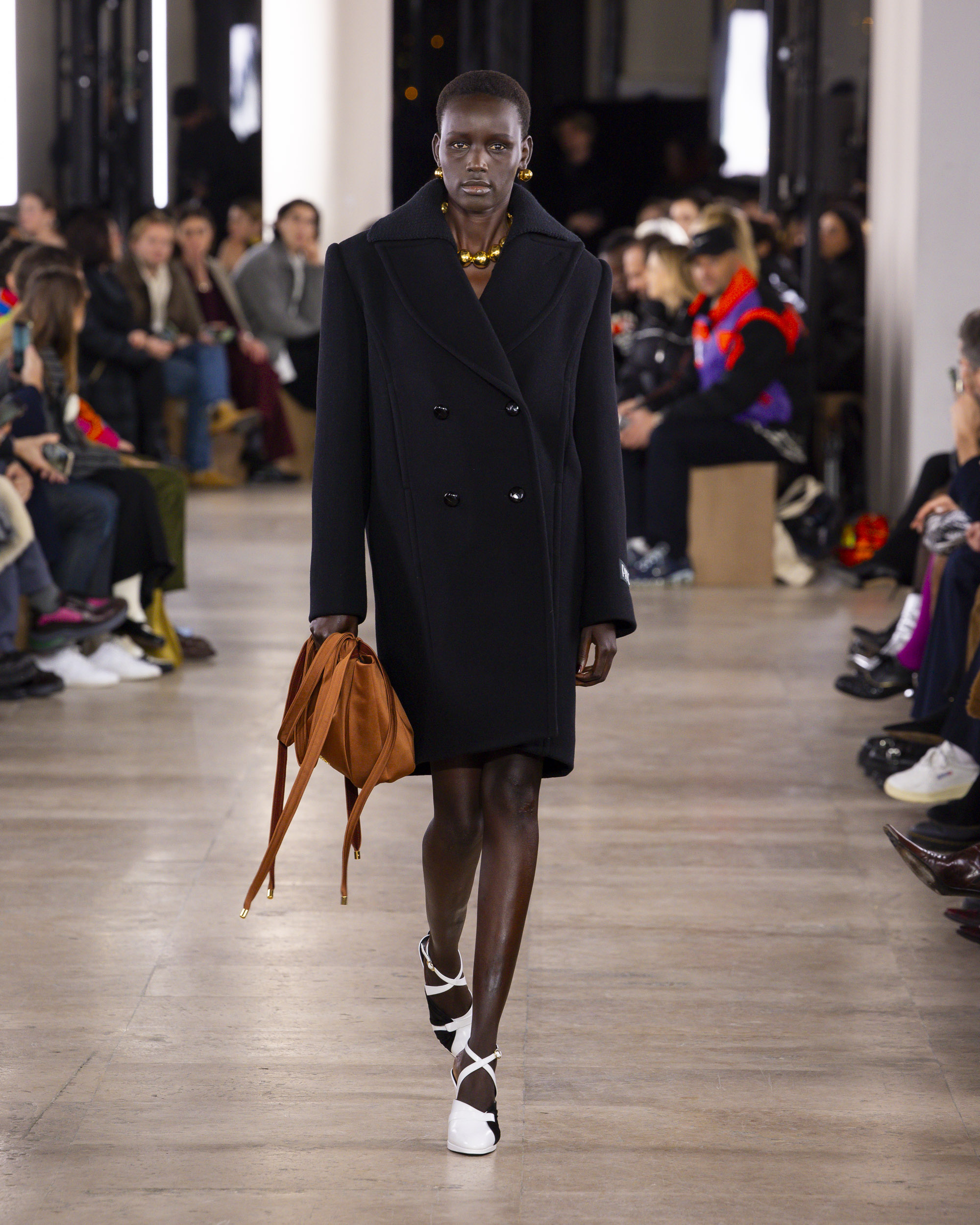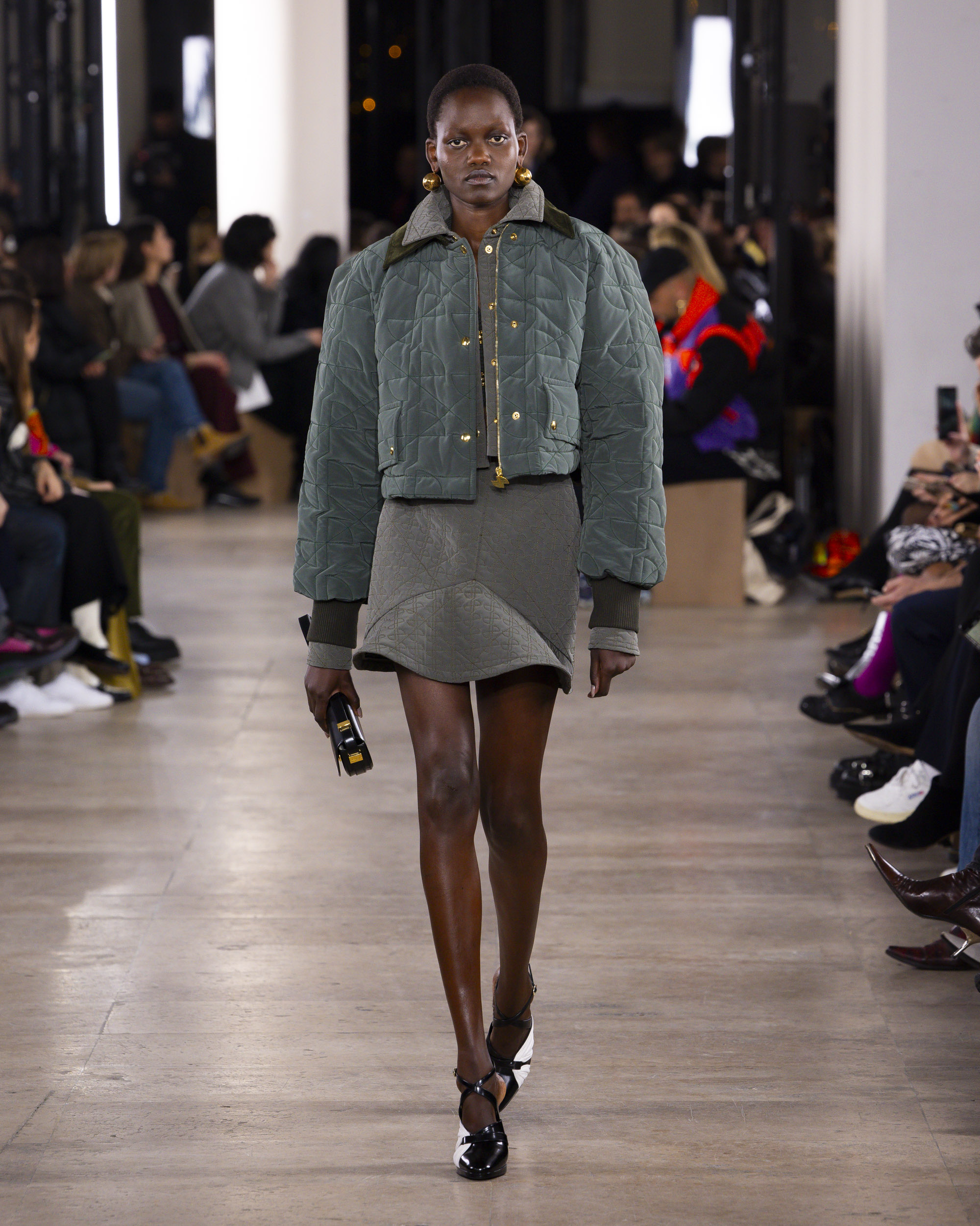 Le colorama de la collection, un patchwork rassurant de beiges chauds, kakis, noirs, et bleus, évoque un esprit de collage artistique. Les détails, tels que le bouton bijou JP, ajoutent une touche dorée et raffinée aux silhouettes. Les parures, traitées comme des œuvres d’art, et la maroquinerie, notamment les sacs fermement tenus avec leur verrou monogramme, complètent ces ensembles avec élégance.