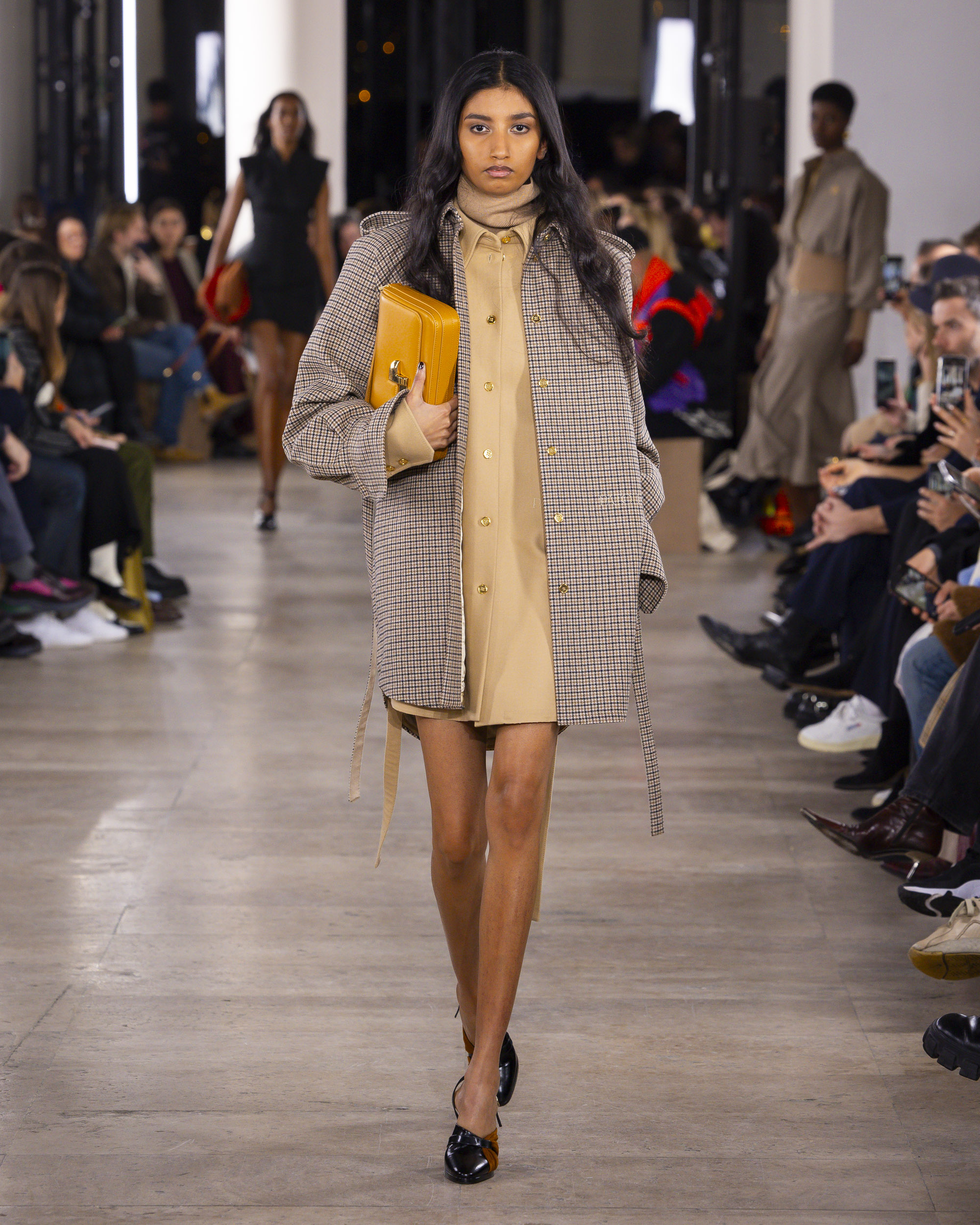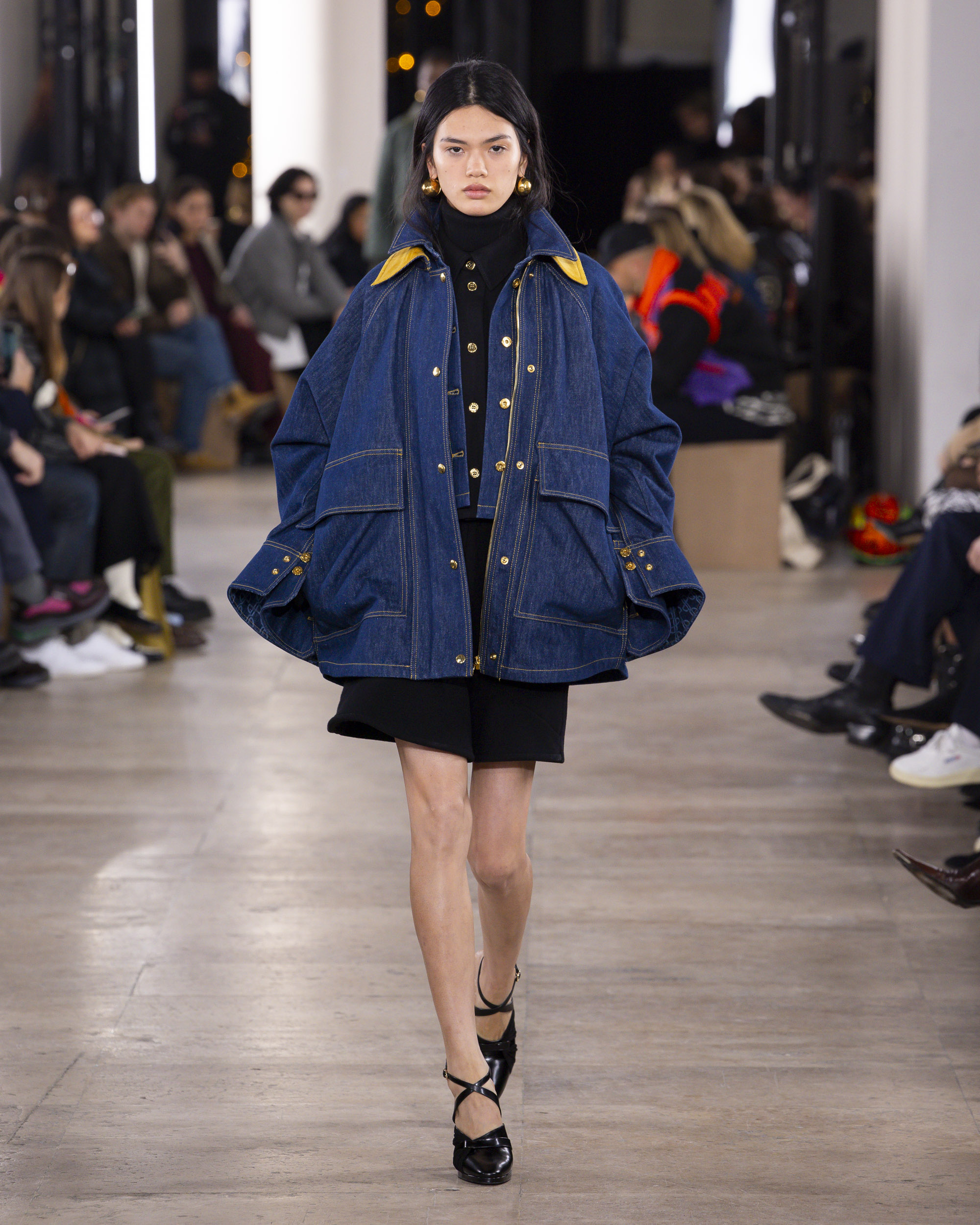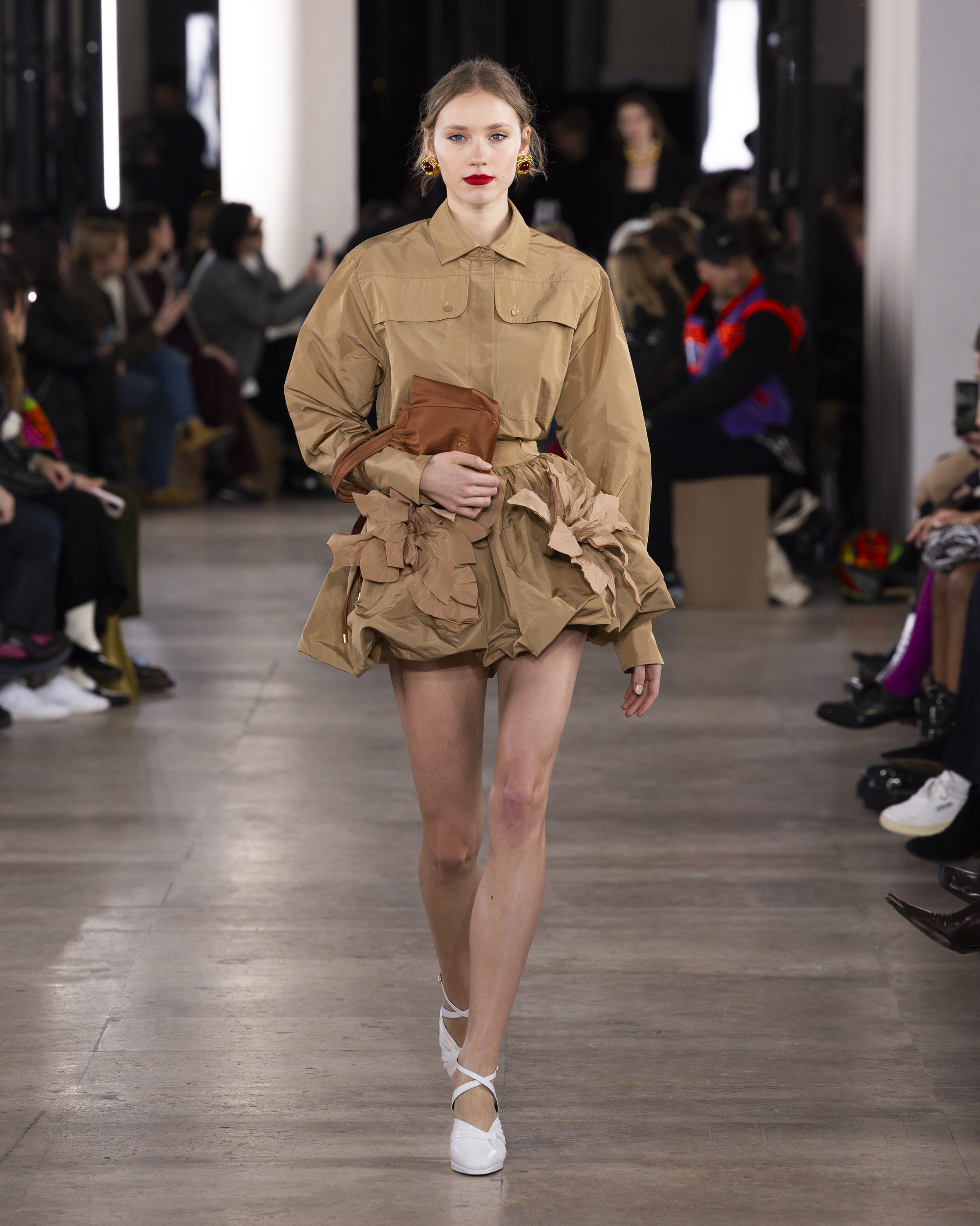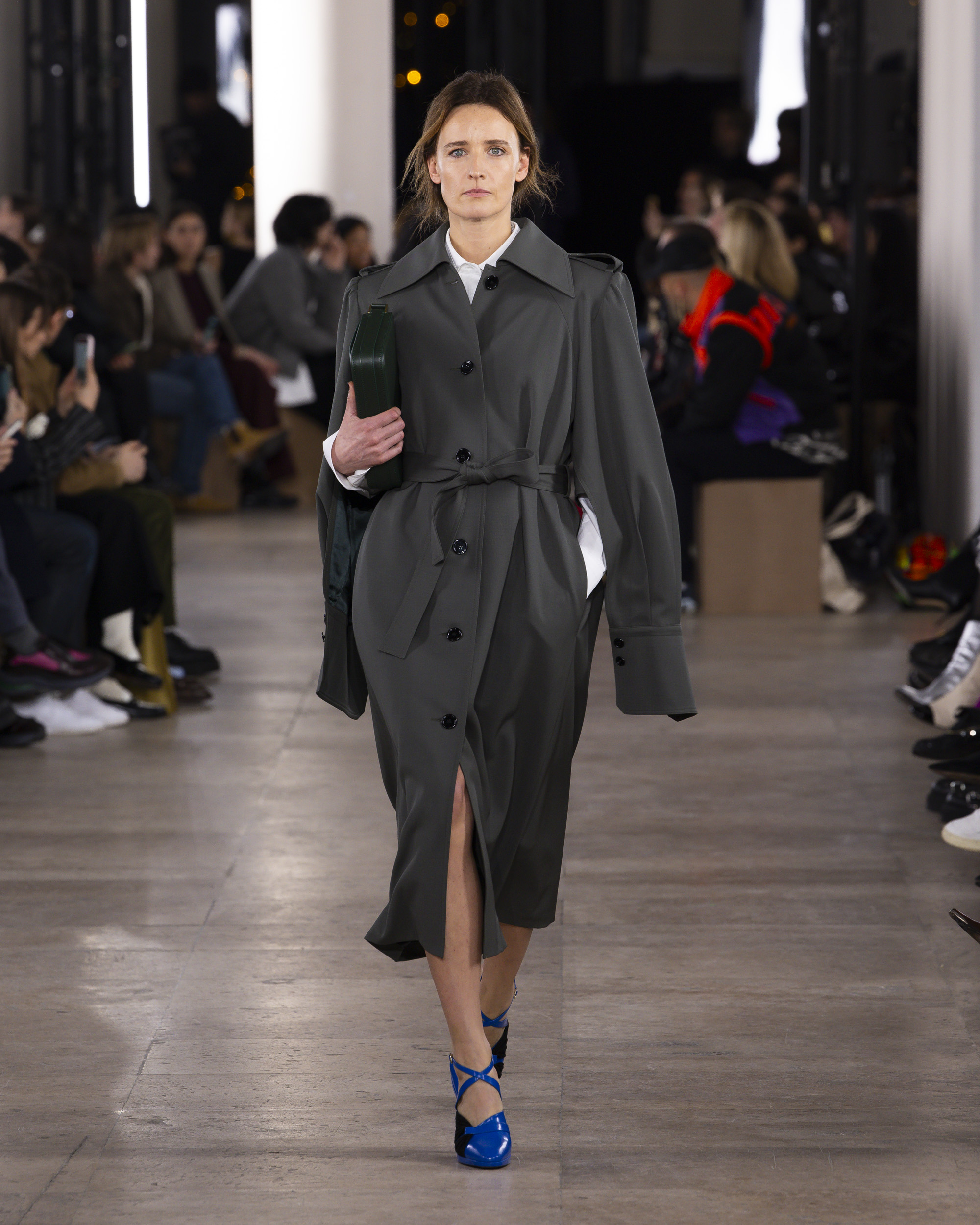 Le colorama de la collection, un patchwork rassurant de beiges chauds, kakis, noirs, et bleus, évoque un esprit de collage artistique. Les détails, tels que le bouton bijou JP, ajoutent une touche dorée et raffinée aux silhouettes. Les parures, traitées comme des œuvres d’art, et la maroquinerie, notamment les sacs fermement tenus avec leur verrou monogramme, complètent ces ensembles avec élégance.
