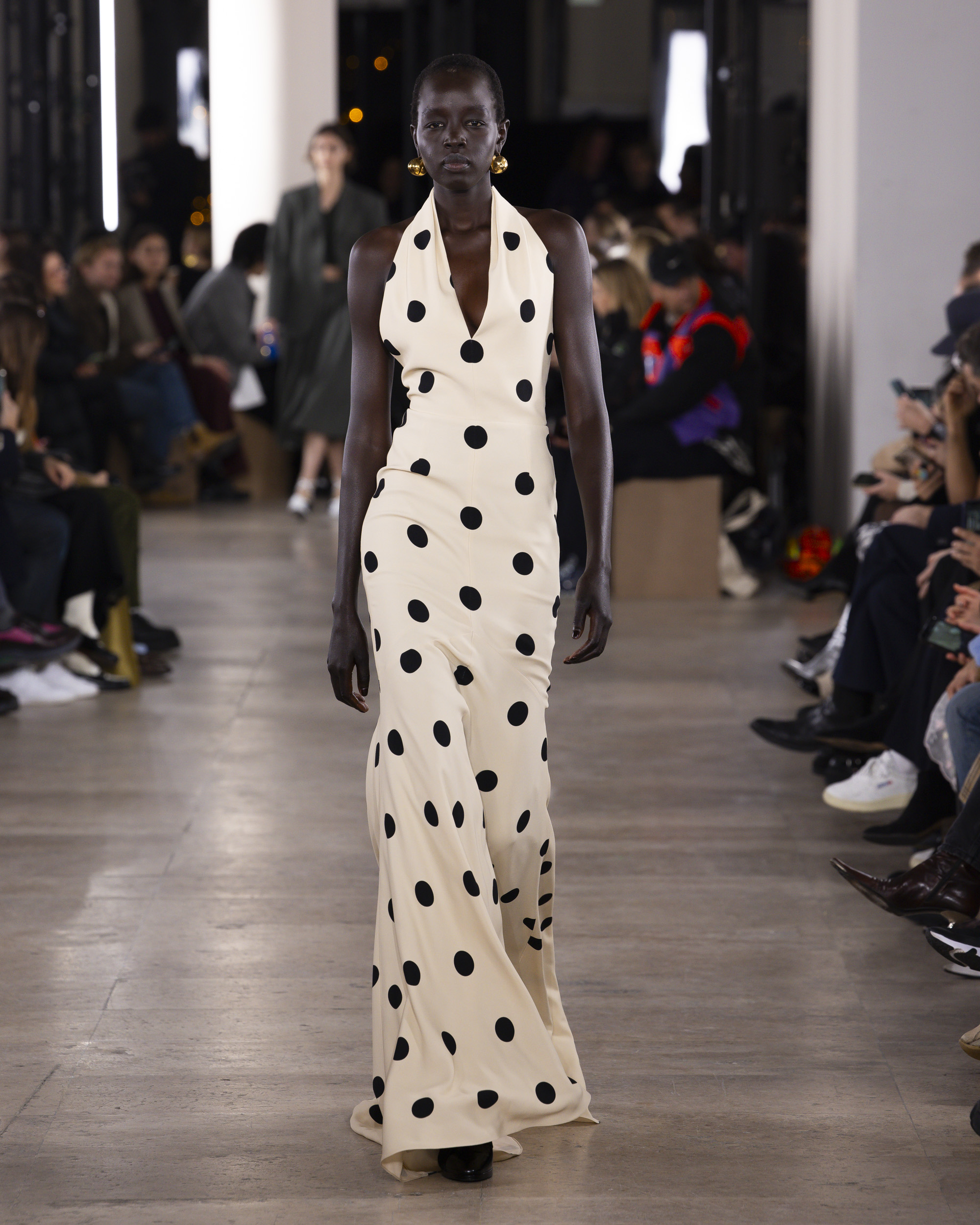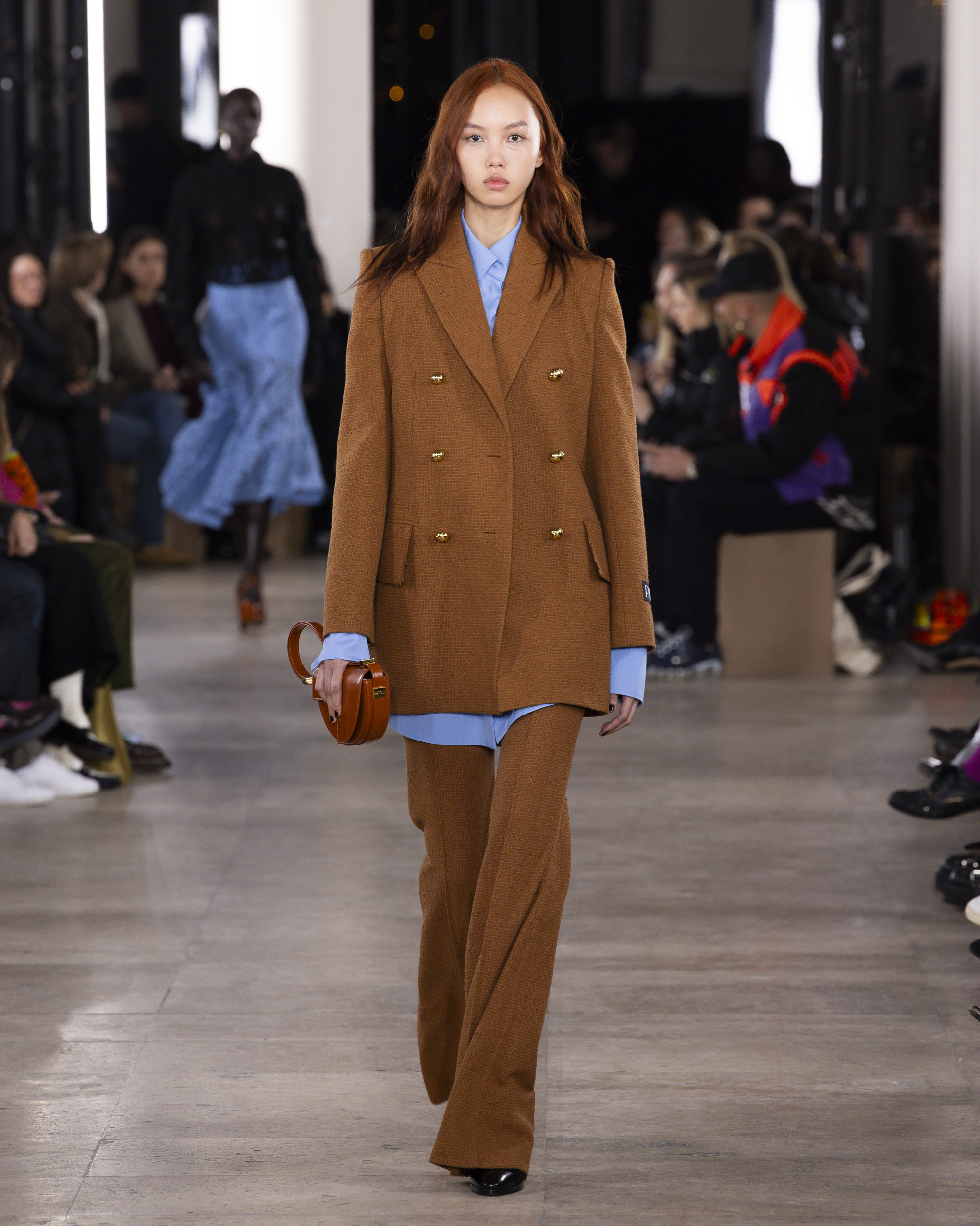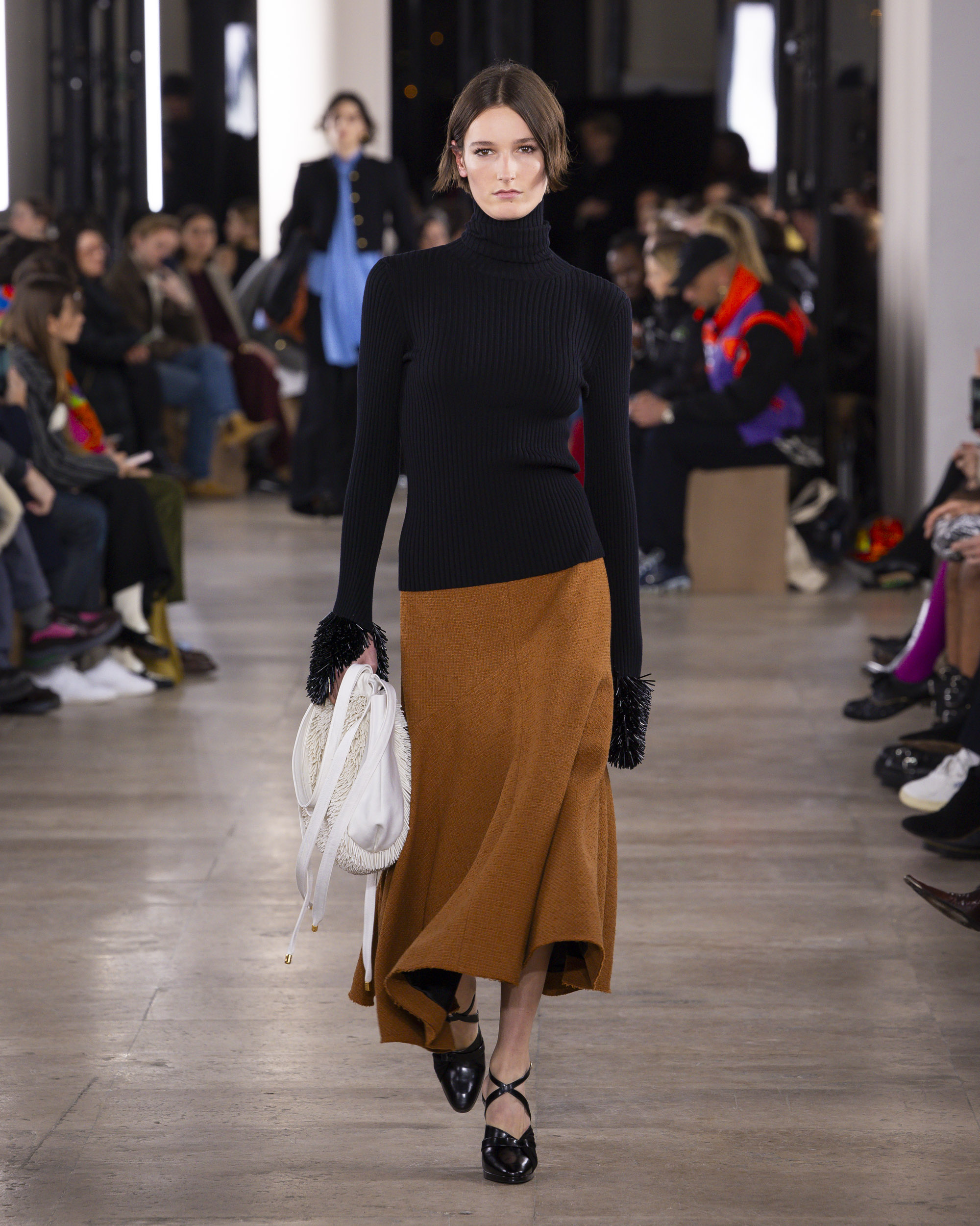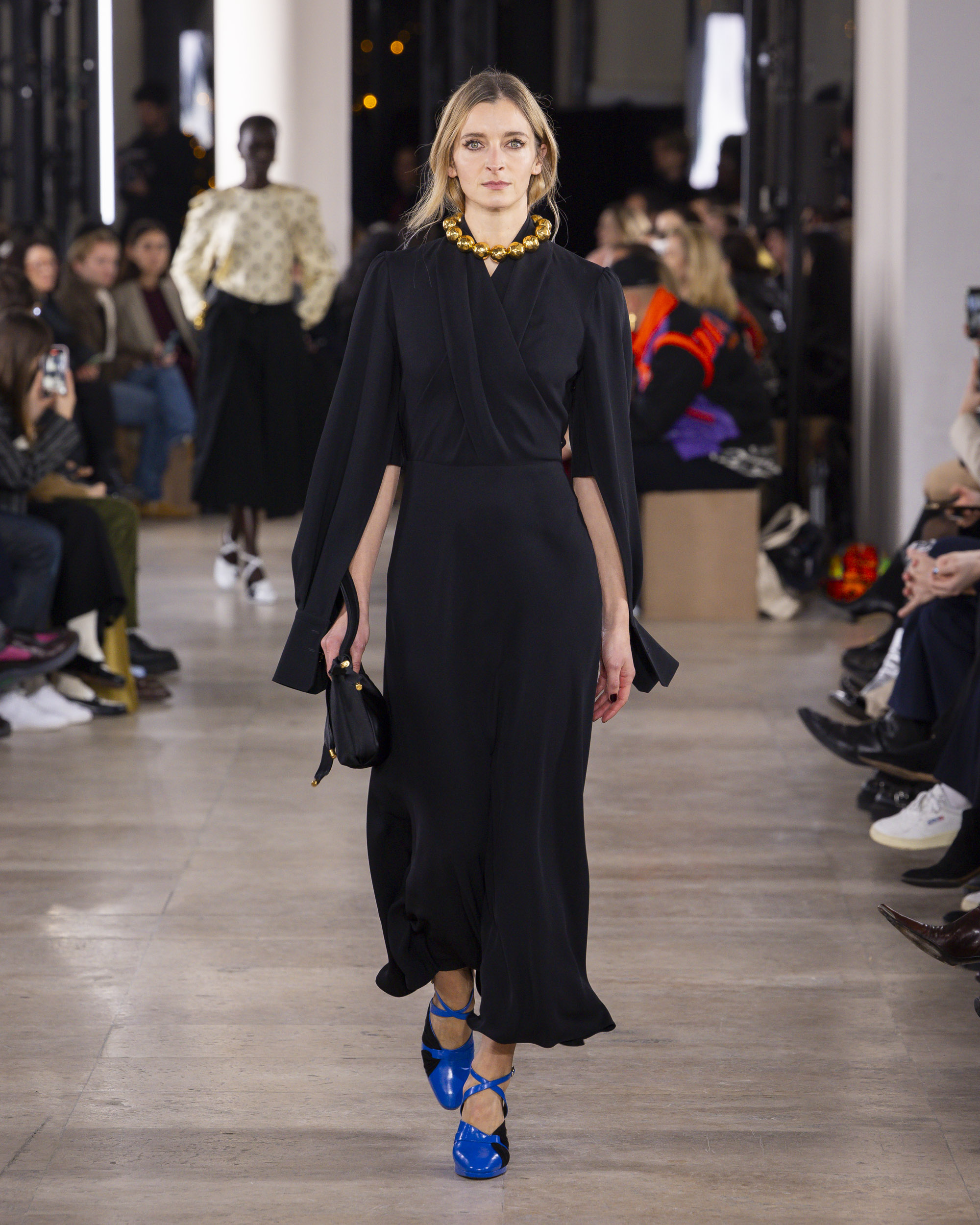 « Hiver 24 » se veut le reflet d’une époque historique, où le vêtement devient un repère essentiel, un uniforme digne et rassurant pour une femme qui avance avec détermination. Les créations de PATOU, dans leur pureté formelle, enveloppent et complètent la silhouette de manière intemporelle, offrant à la fois confort et assurance.