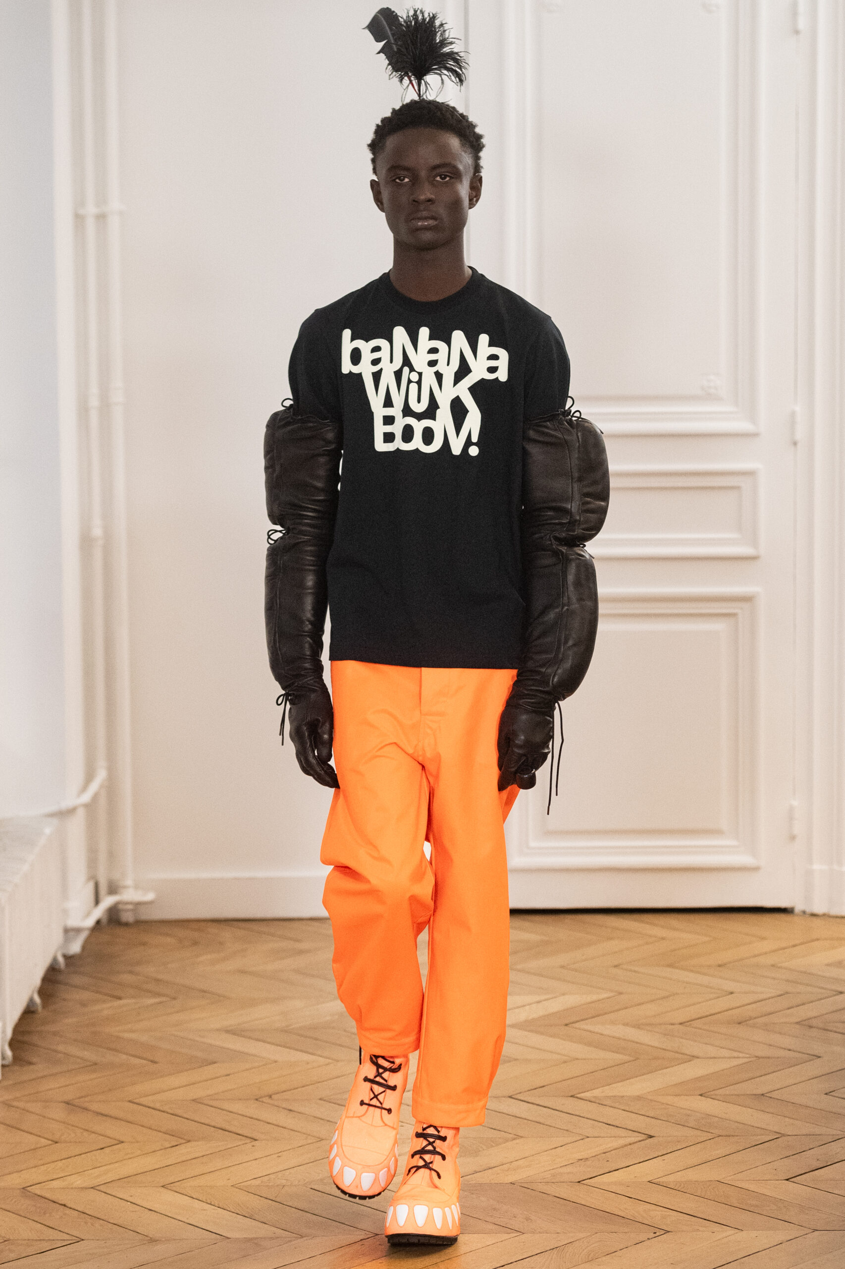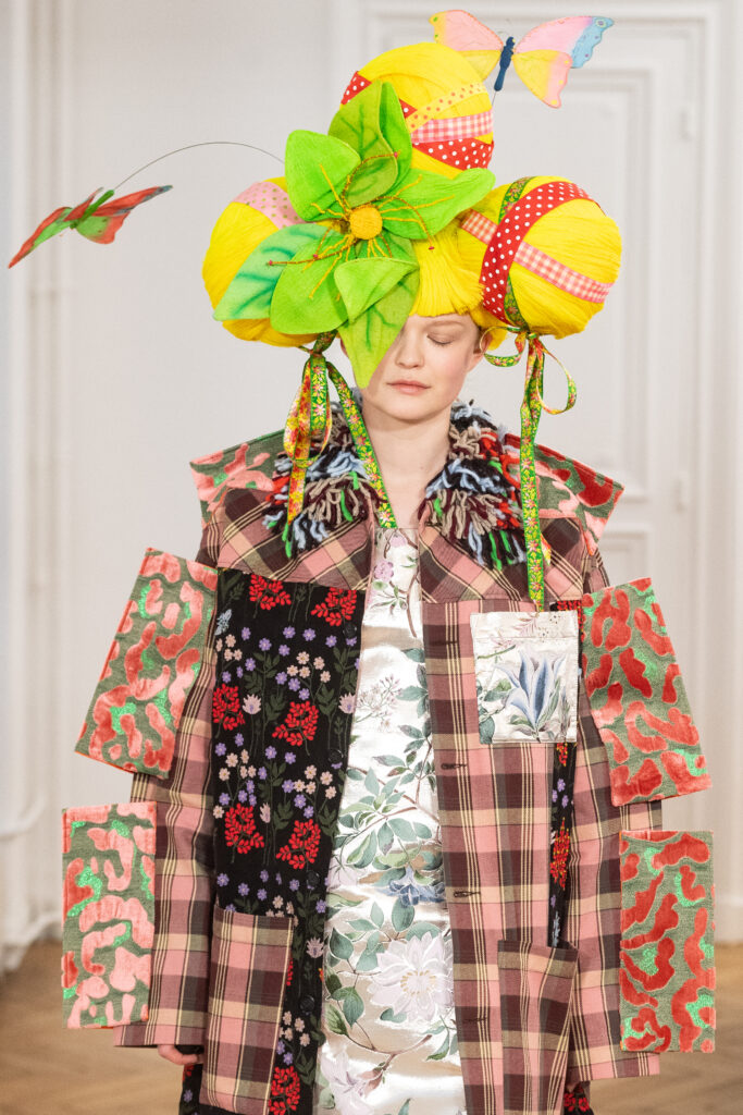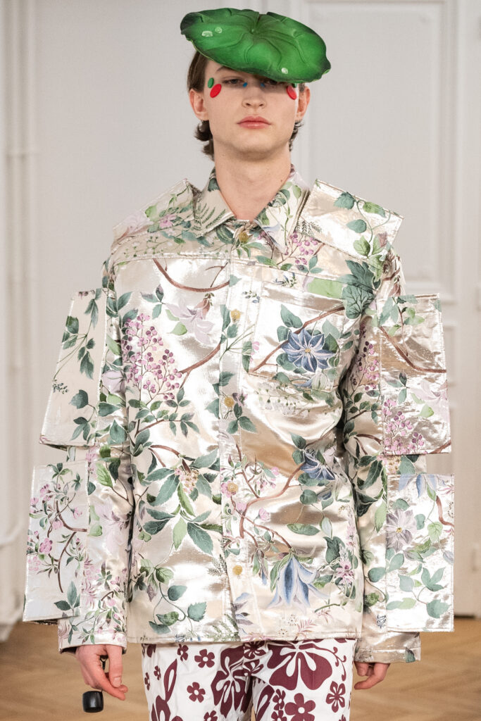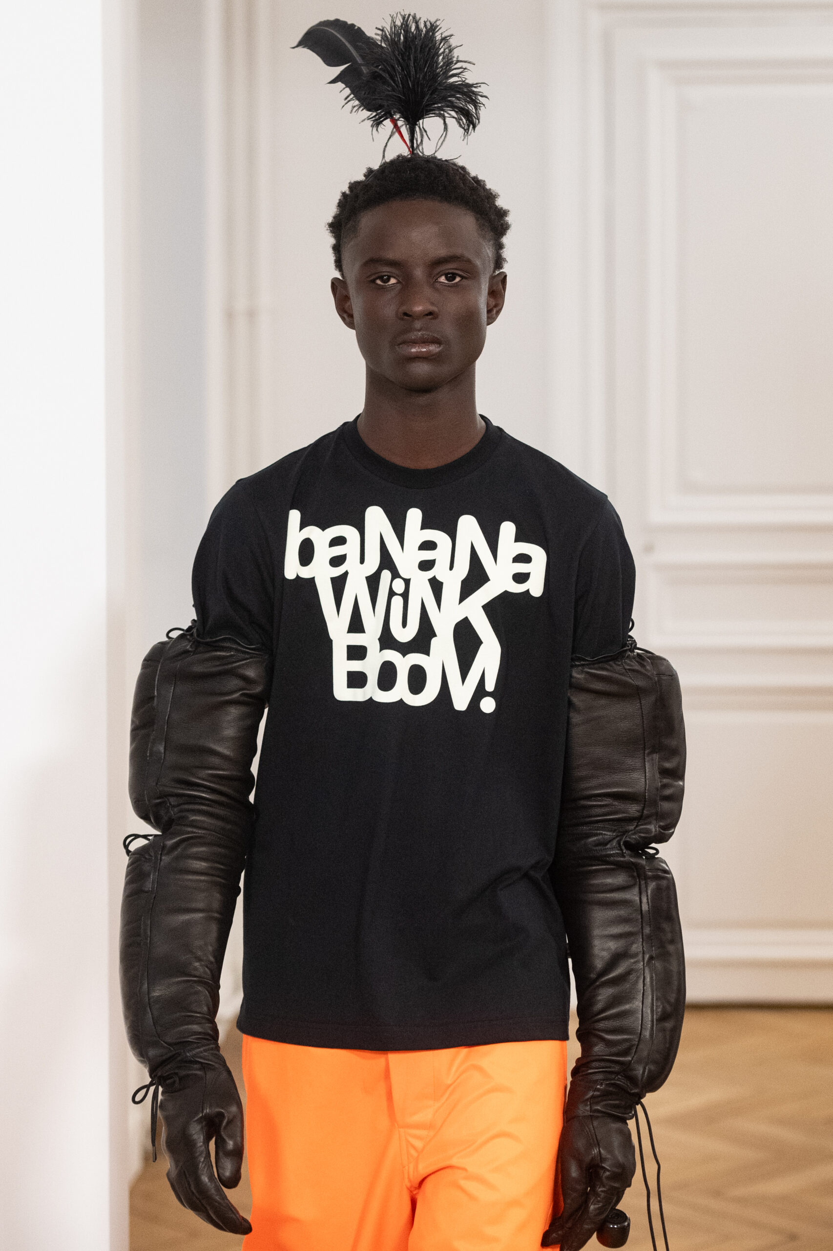 La collection, intitulée « BANANA WINK BOOM! », se caractérise par sa liberté d’expression, mélangeant l’absurde et le merveilleux. Les vêtements, entièrement nouveaux, s’inspirent des méthodes de création aléatoires de Van Beirendonck, écho à son travail de stylisme et de maquillage réalisé il y a 30 ans pour les spectacles W.&L.T. Les chapeaux, conçus par Stephen Jones, et les accessoires issus des archives de Van Beirendonck, renforcent ce lien avec le passé tout en restant résolument tournés vers l’avenir.