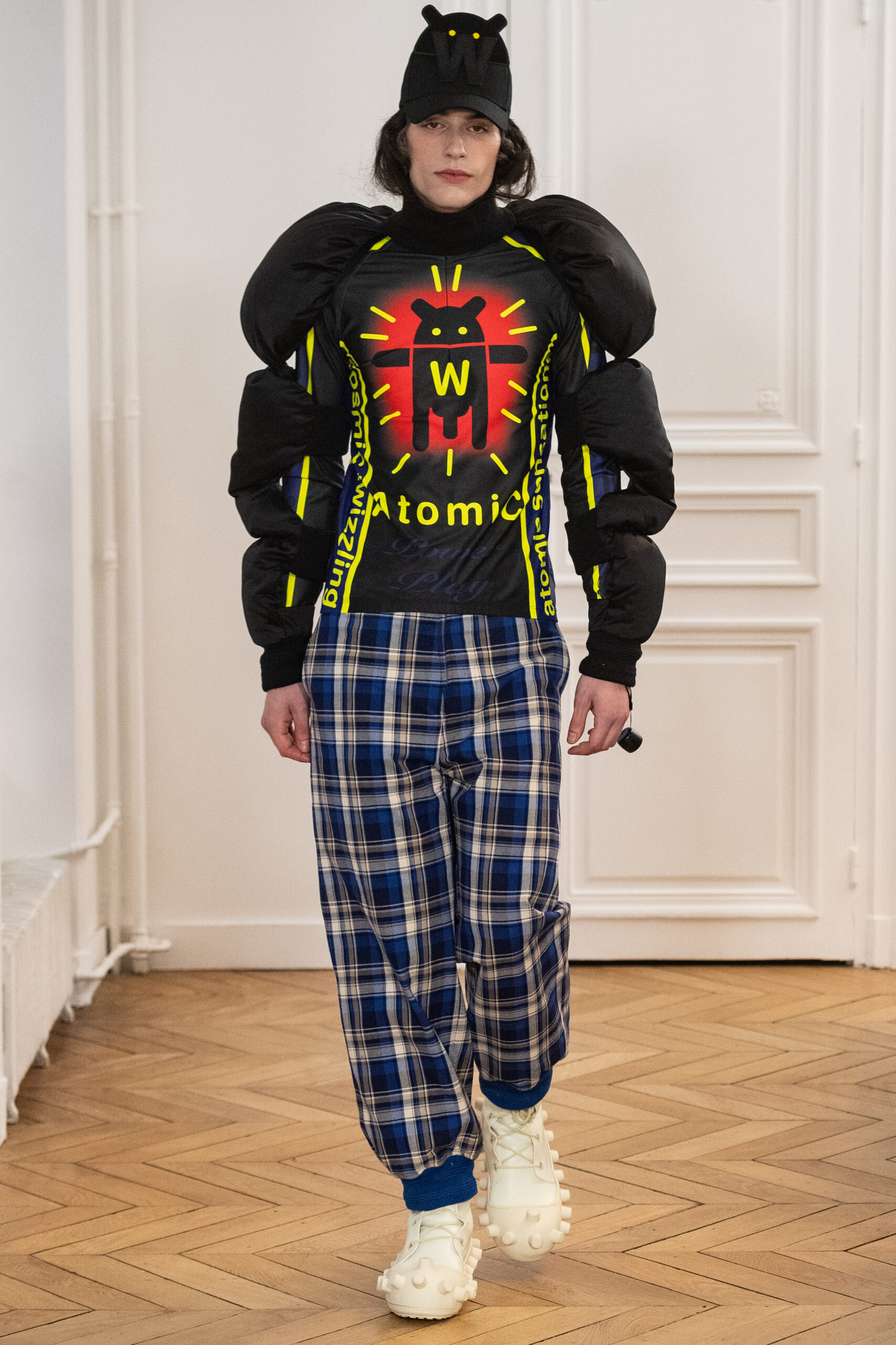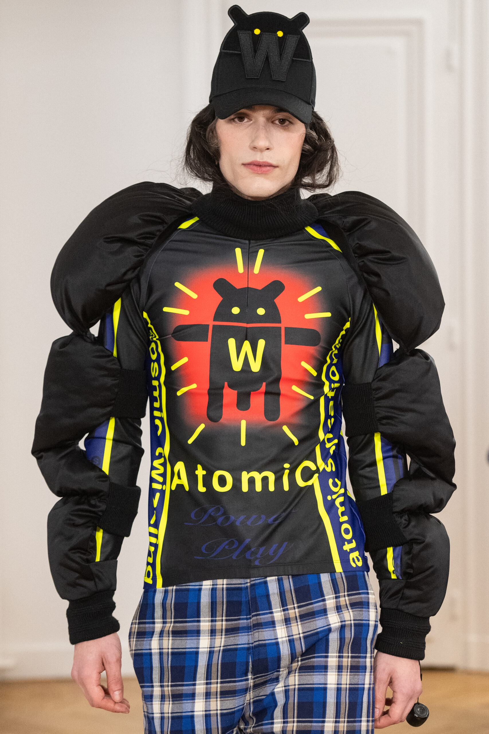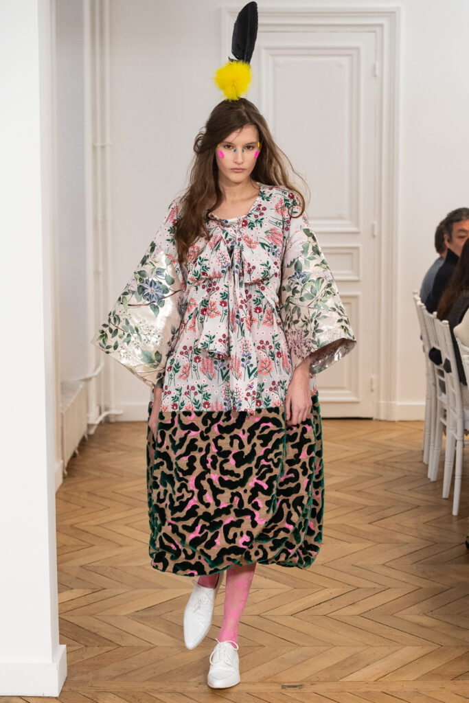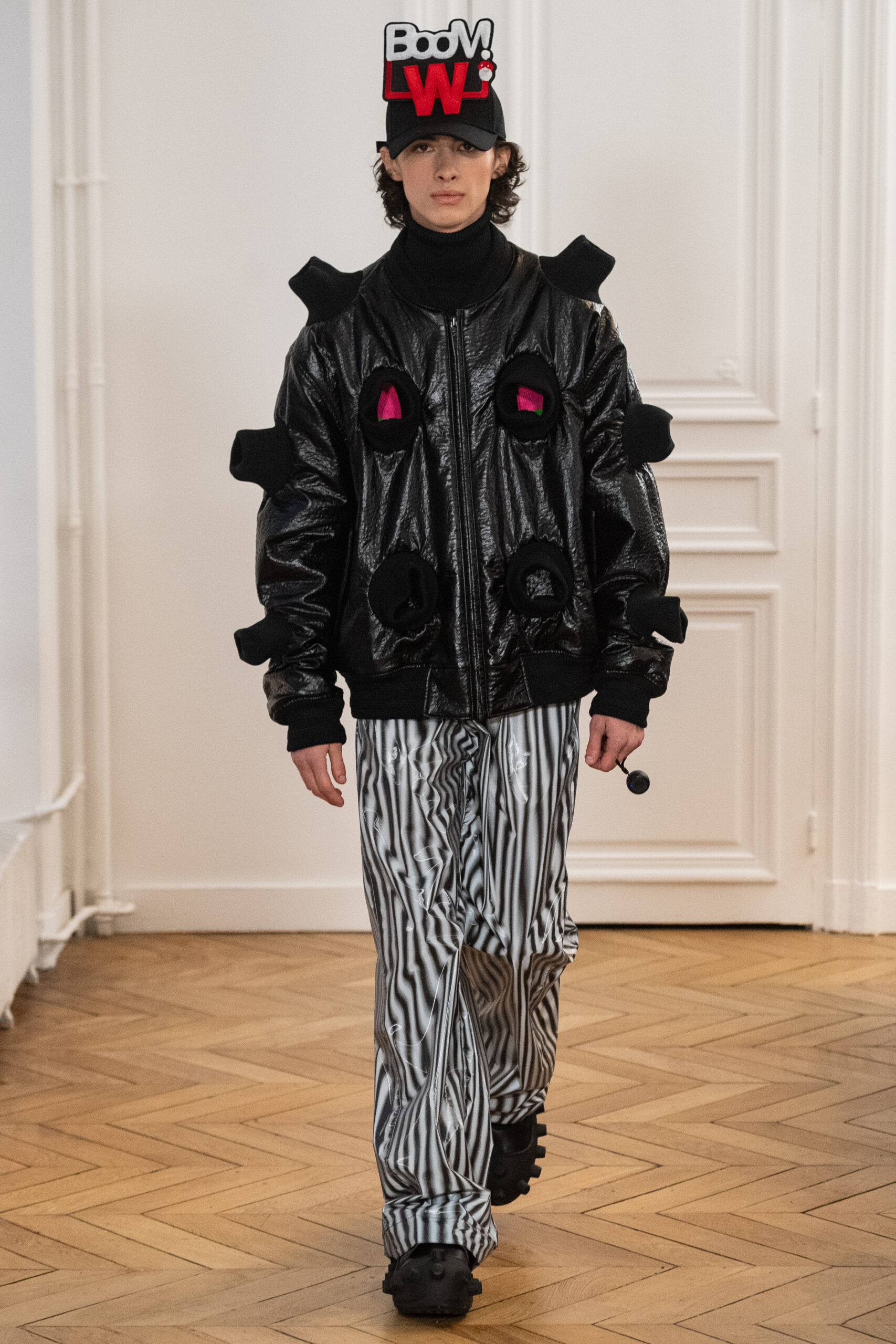 La collection, intitulée « BANANA WINK BOOM! », se caractérise par sa liberté d’expression, mélangeant l’absurde et le merveilleux. Les vêtements, entièrement nouveaux, s’inspirent des méthodes de création aléatoires de Van Beirendonck, écho à son travail de stylisme et de maquillage réalisé il y a 30 ans pour les spectacles W.&L.T. Les chapeaux, conçus par Stephen Jones, et les accessoires issus des archives de Van Beirendonck, renforcent ce lien avec le passé tout en restant résolument tournés vers l’avenir.