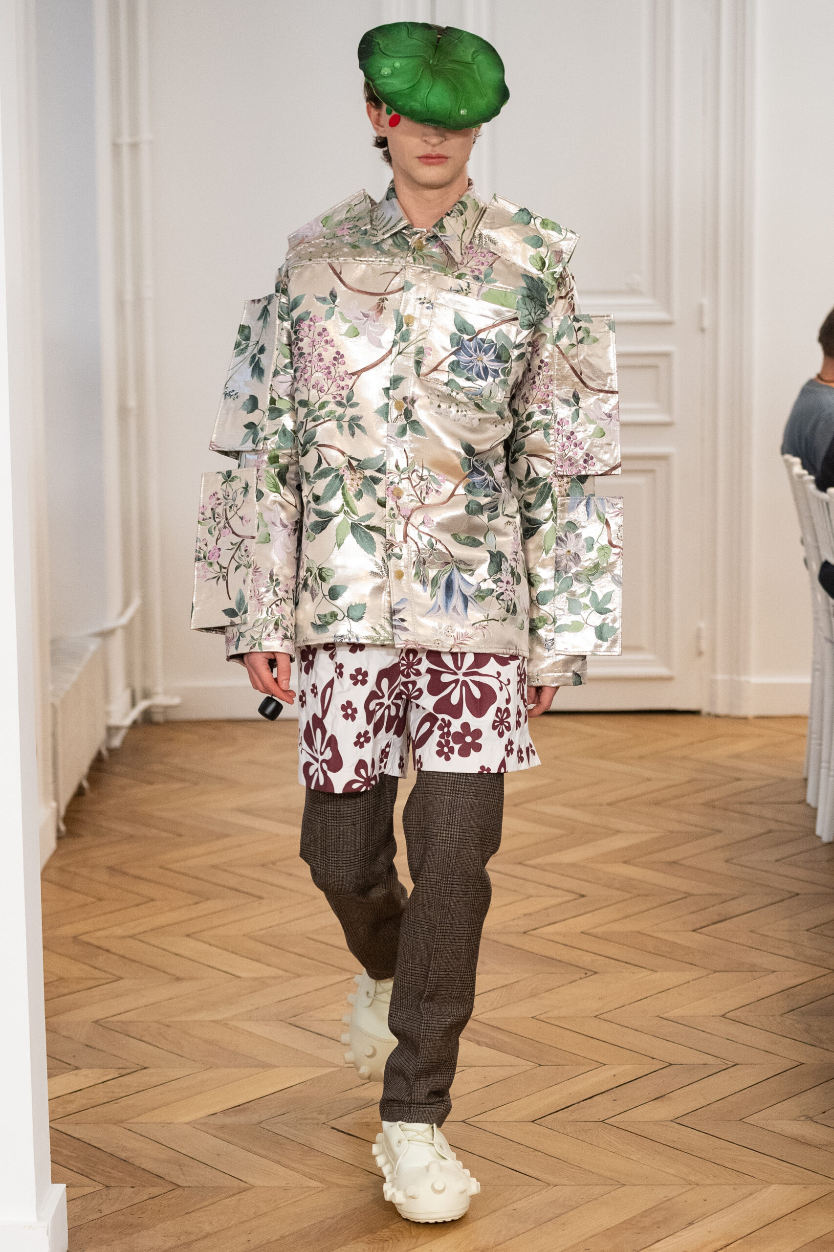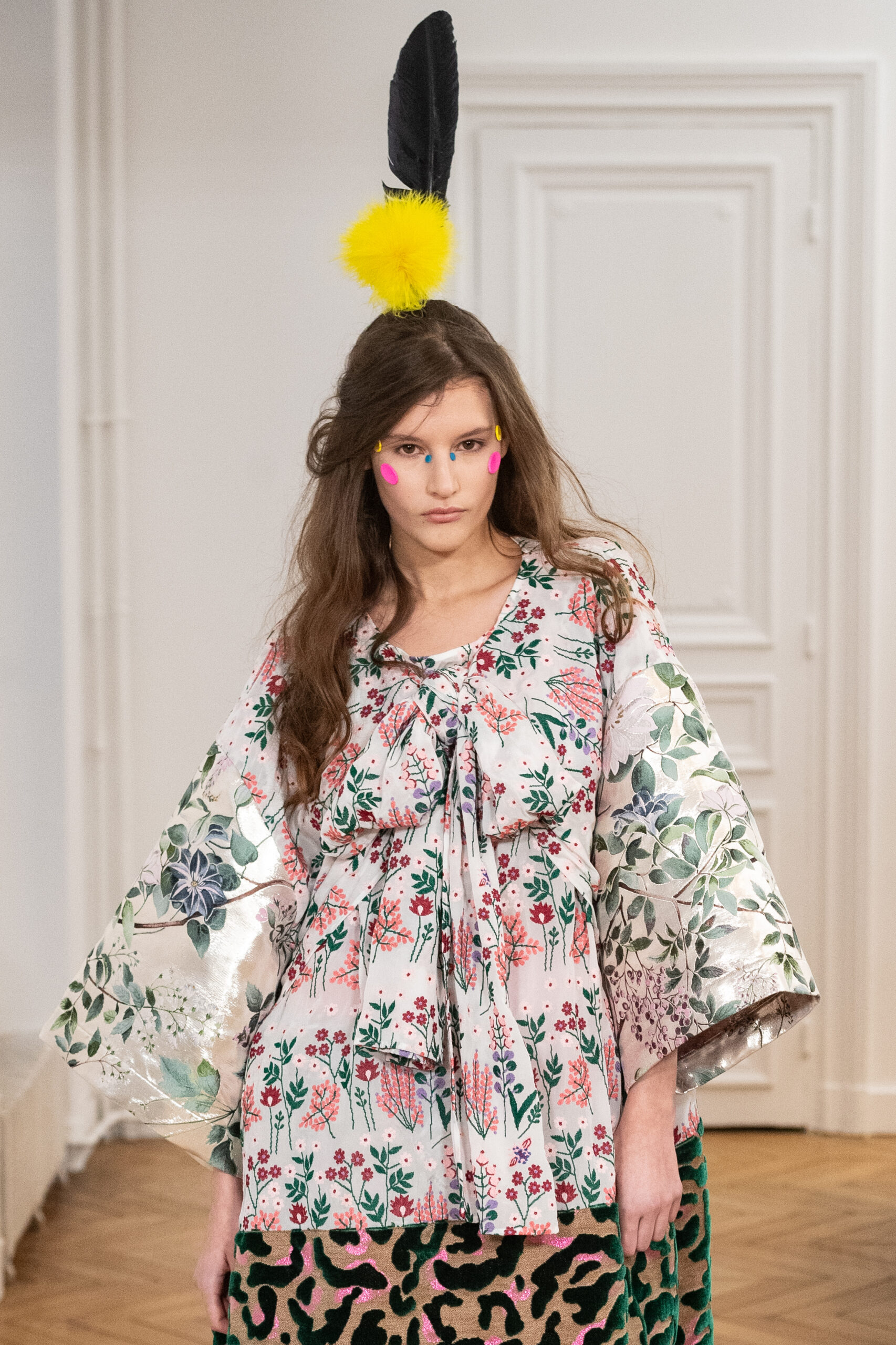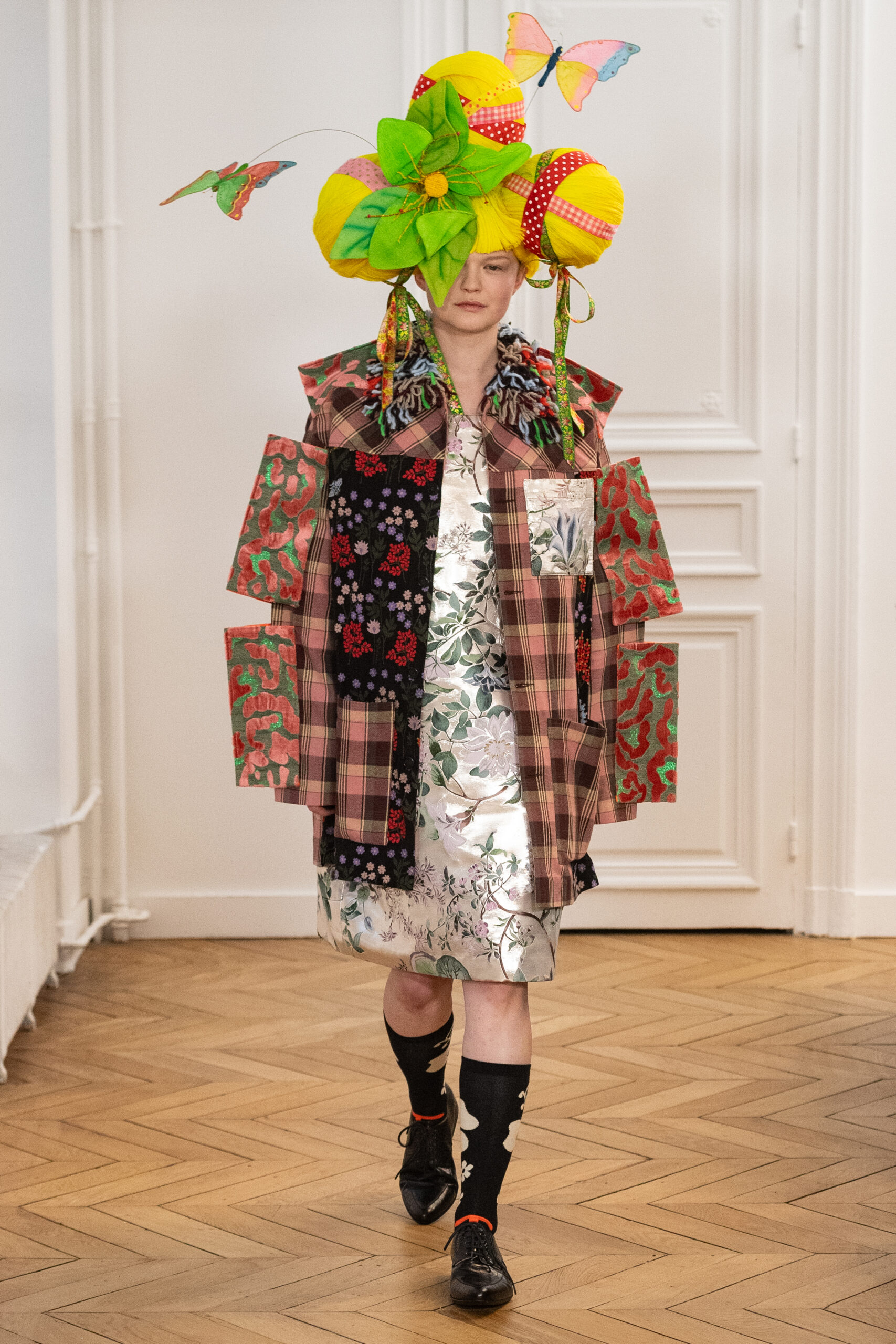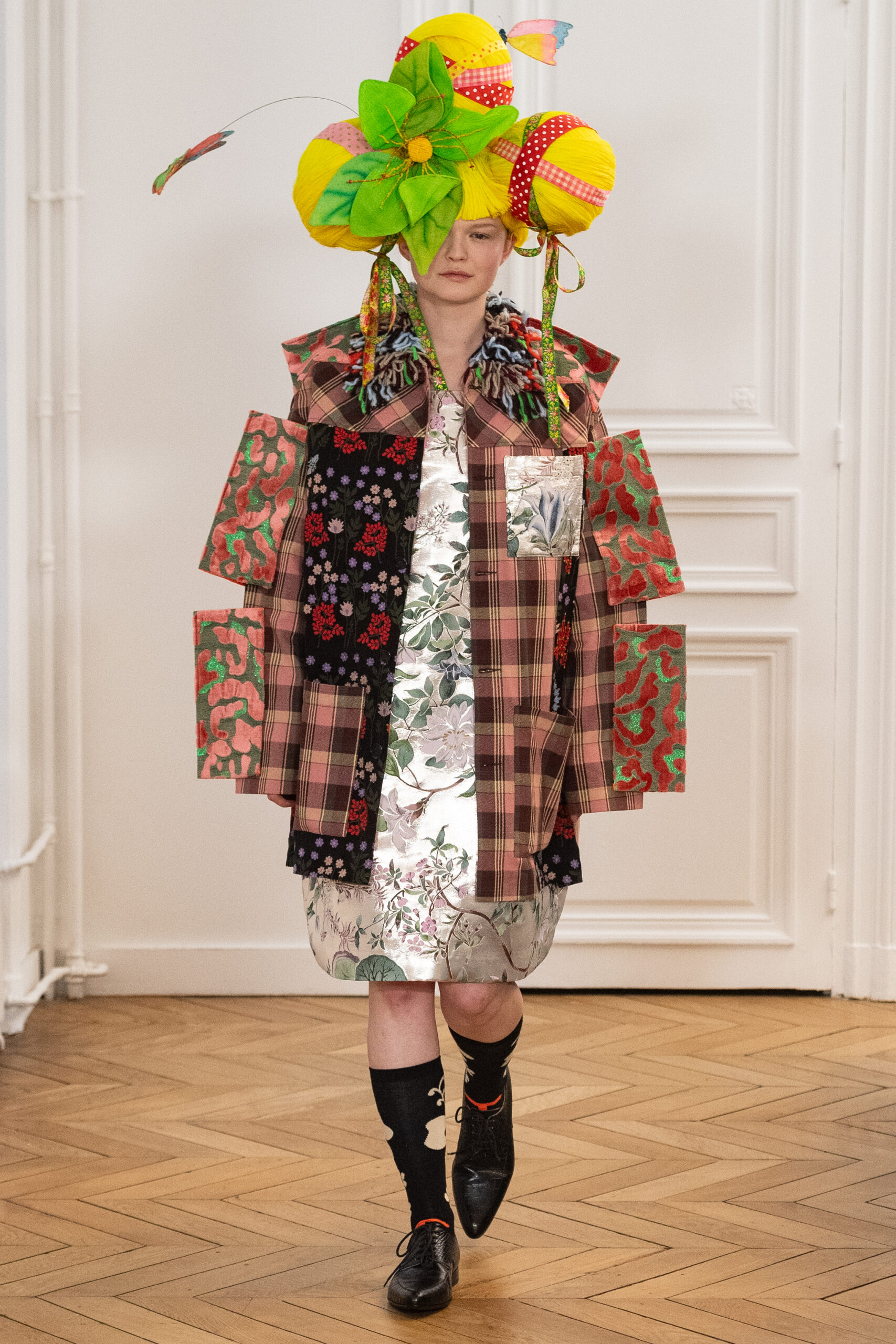 La collection, intitulée « BANANA WINK BOOM! », se caractérise par sa liberté d’expression, mélangeant l’absurde et le merveilleux. Les vêtements, entièrement nouveaux, s’inspirent des méthodes de création aléatoires de Van Beirendonck, écho à son travail de stylisme et de maquillage réalisé il y a 30 ans pour les spectacles W.&L.T. Les chapeaux, conçus par Stephen Jones, et les accessoires issus des archives de Van Beirendonck, renforcent ce lien avec le passé tout en restant résolument tournés vers l’avenir.