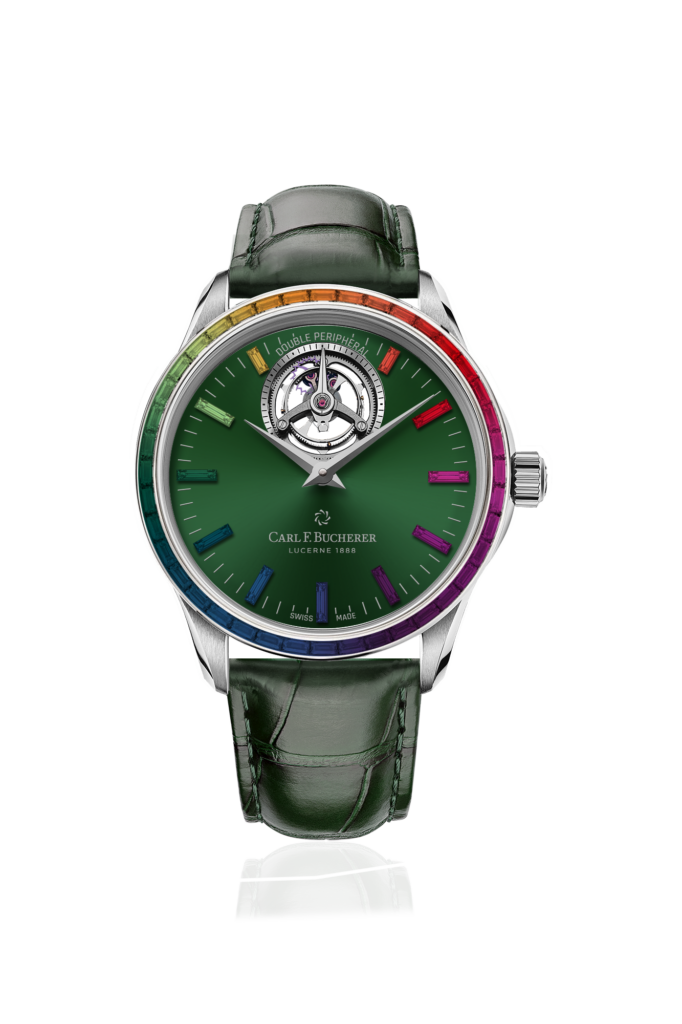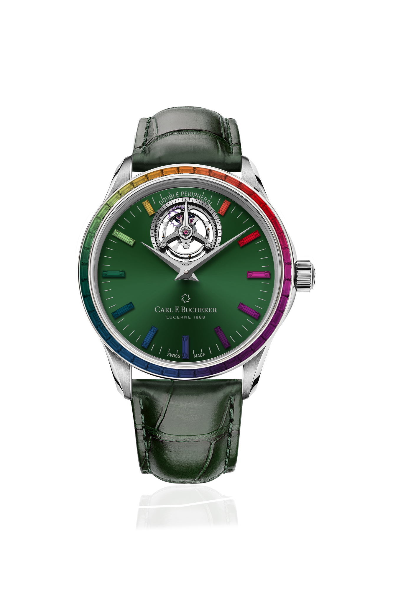 La Manero Tourbillon Double Peripheral « Green Paradise » : Une Ode à la Nature La Manero Tourbillon Double Peripheral « Green Paradise » est une réinterprétation audacieuse et luxuriante du modèle noir édition limitée lancé plus tôt en 2023. Son cadran brossé-soleil vert profond, orné de 11 tsavorites, saphirs et rubis, est un hommage vibrant à la richesse culturelle du Moyen-Orient. La lunette, sertie de 40 pierres précieuses, forme un arc-en-ciel éblouissant, symbolisant l’harmonie et la diversité.