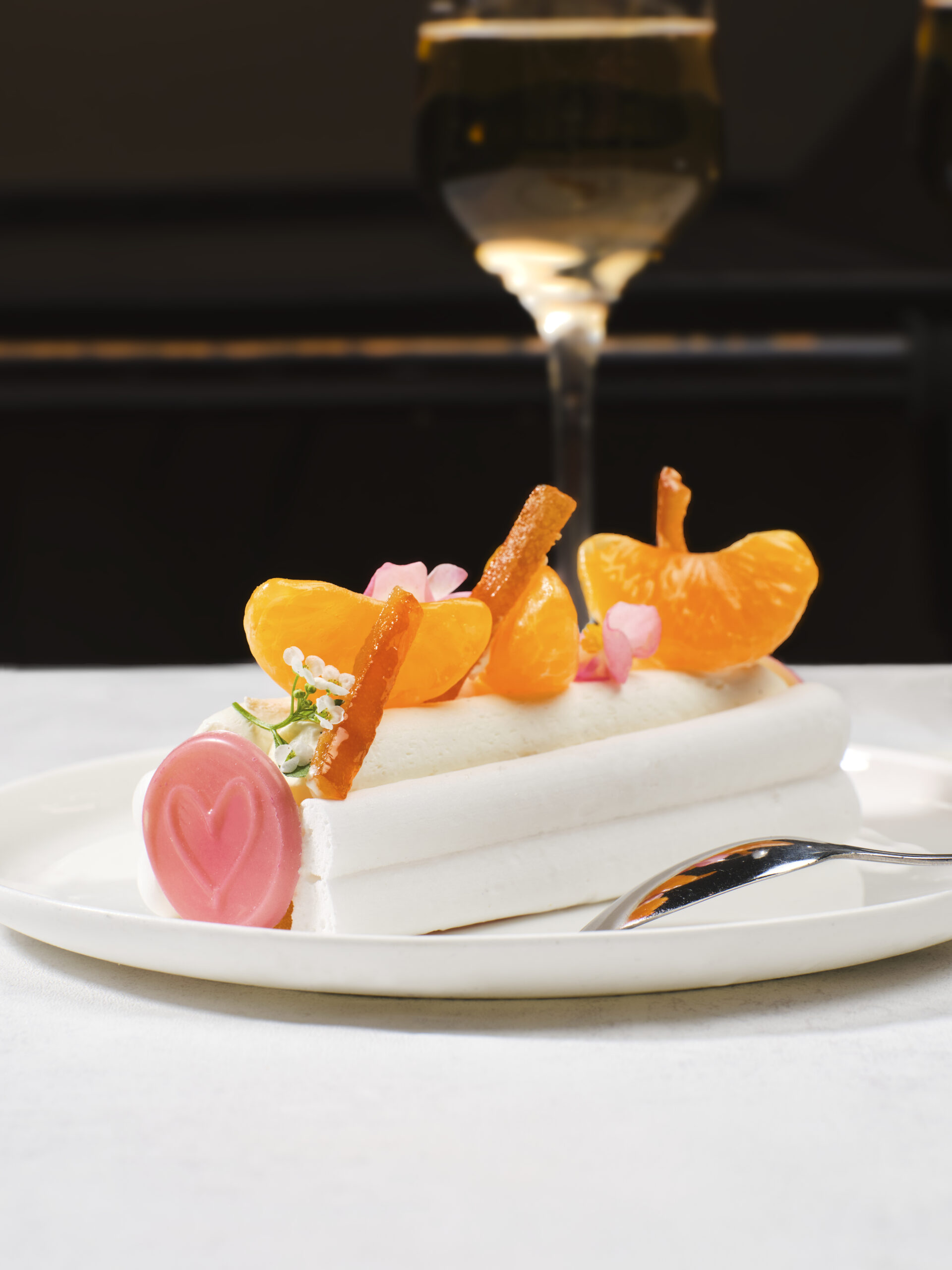 Le premier plat, une spécialité de la maison, est une tourte signée Maison VEROT accompagnée d’un jus de viande acidulé, promesse d’une explosion de saveurs. Suivra un choix entre deux plats principaux : de délicates Saint-Jacques accompagnées de semoule de courge butternut et noisettes torréfiées avec une émulsion de champagne rosé, ou un filet de canette, servi avec une mousseline de panais, poire williams rôti et sauce au vin rouge. Chacune de ces options est une célébration de la gastronomie française.
