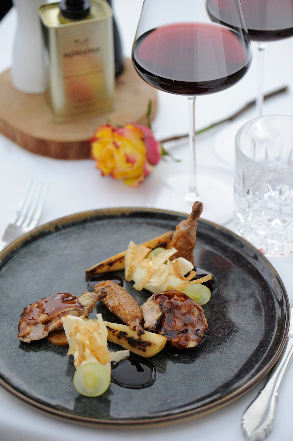La vision culinaire de Diether se traduit par une « cuisine des sens et du sens », où chaque plat est une célébration des saveurs, des couleurs et des textures, conçu pour éveiller les sens et raconter une histoire. C’est une invitation à un voyage gastronomique, où l’authenticité du terroir rencontre l’exploration créative. Parmi les créations phares de Diether, la Caille en deux façons, un plat qui incarne parfaitement cette philosophie, mêlant technique raffinée et simplicité élégante.