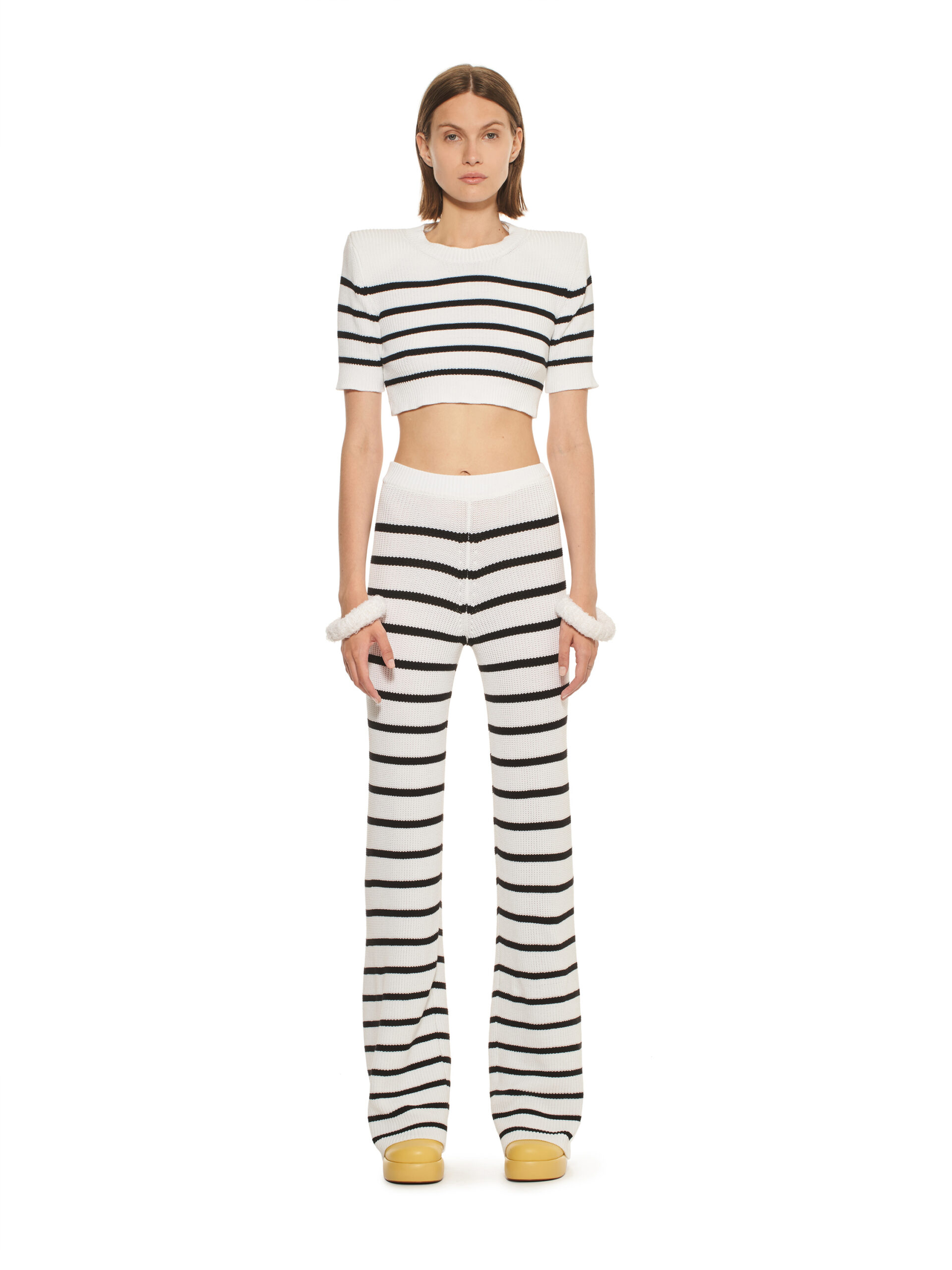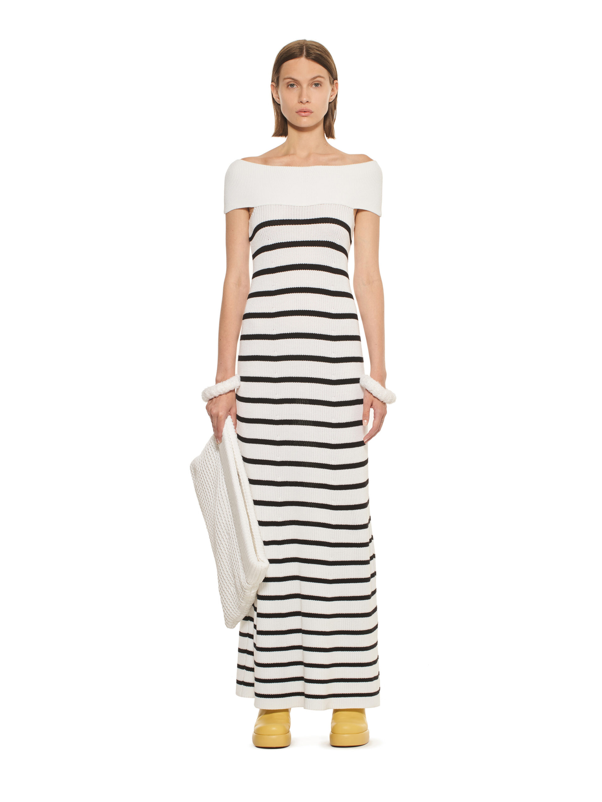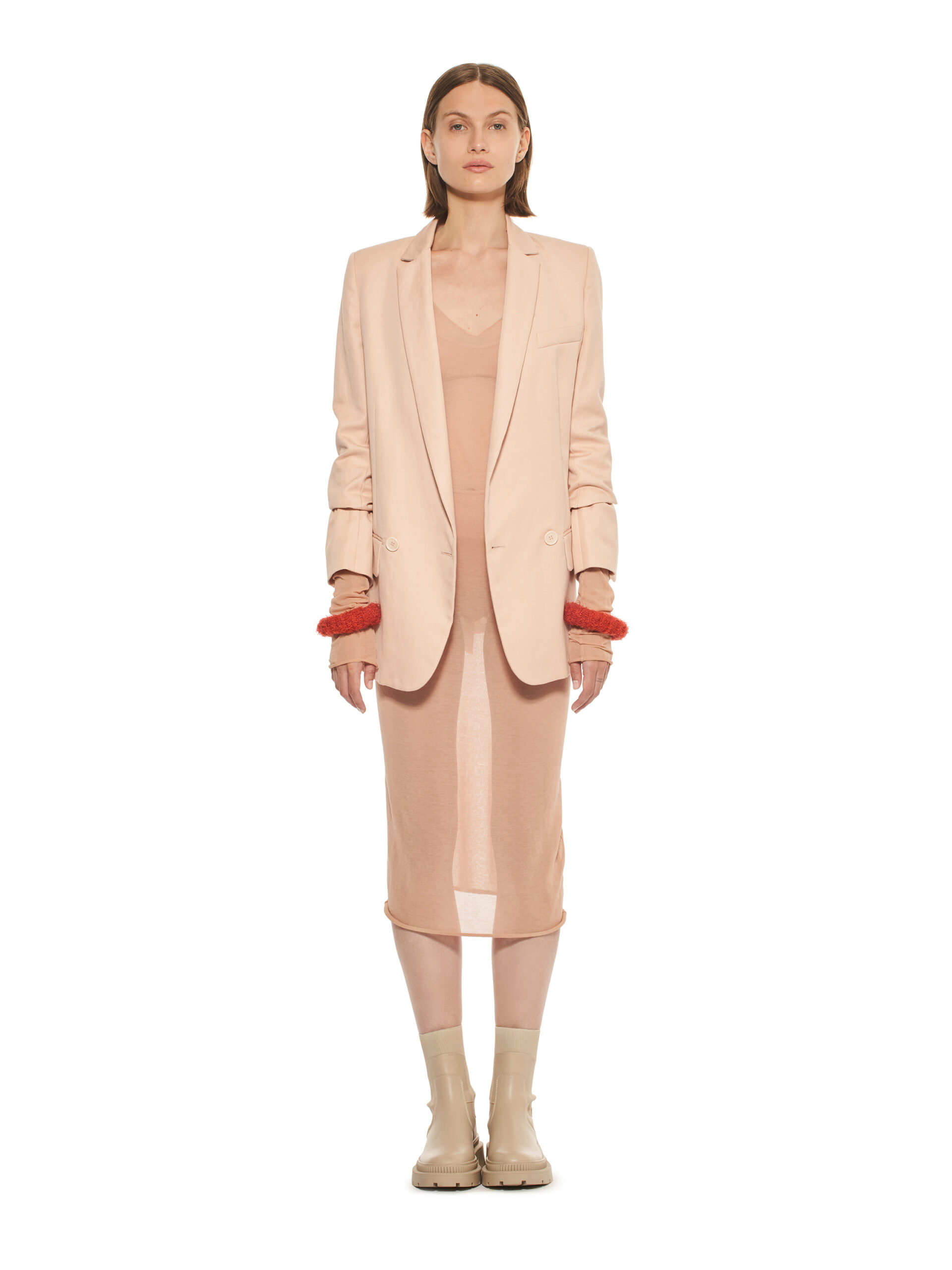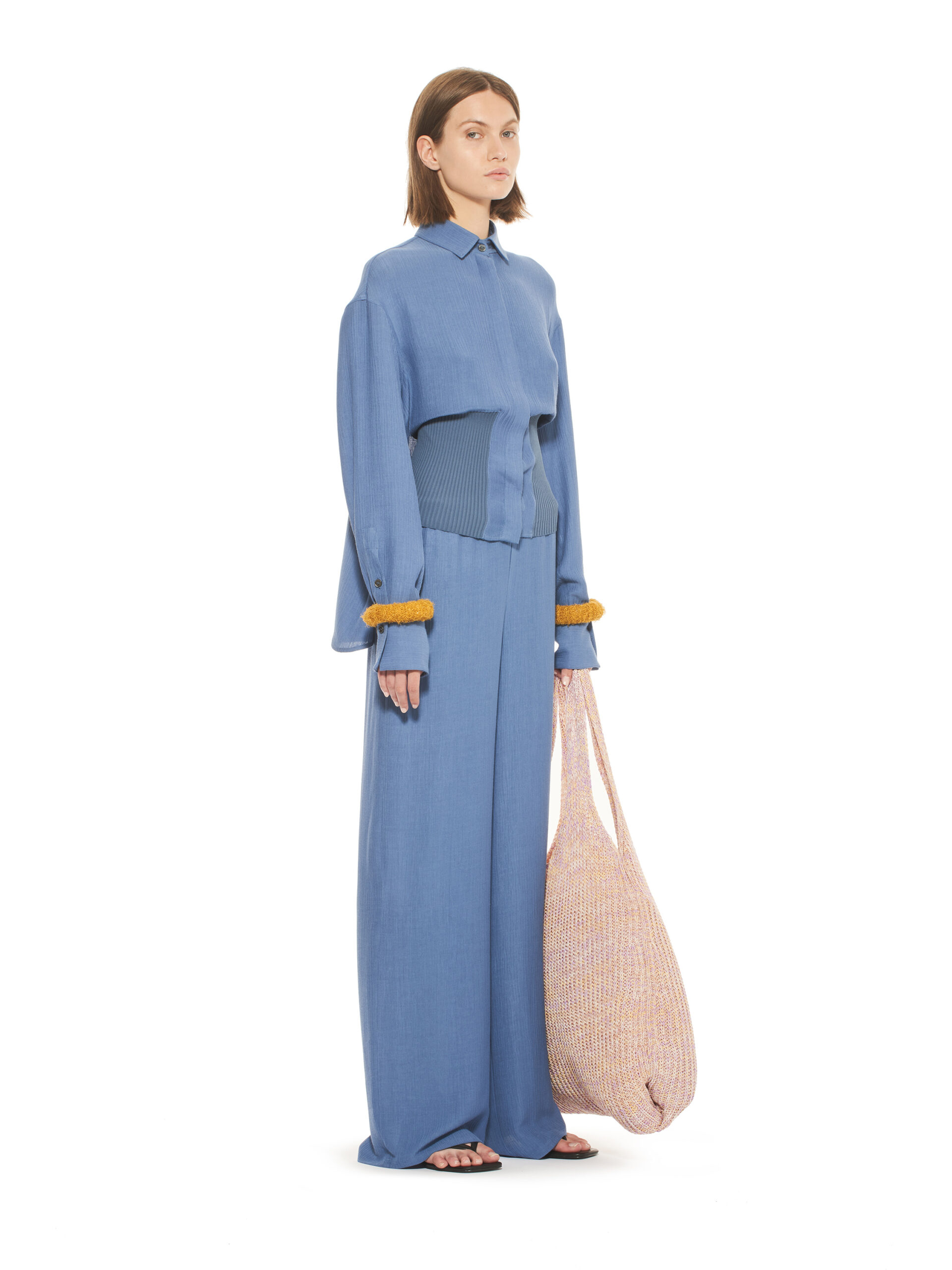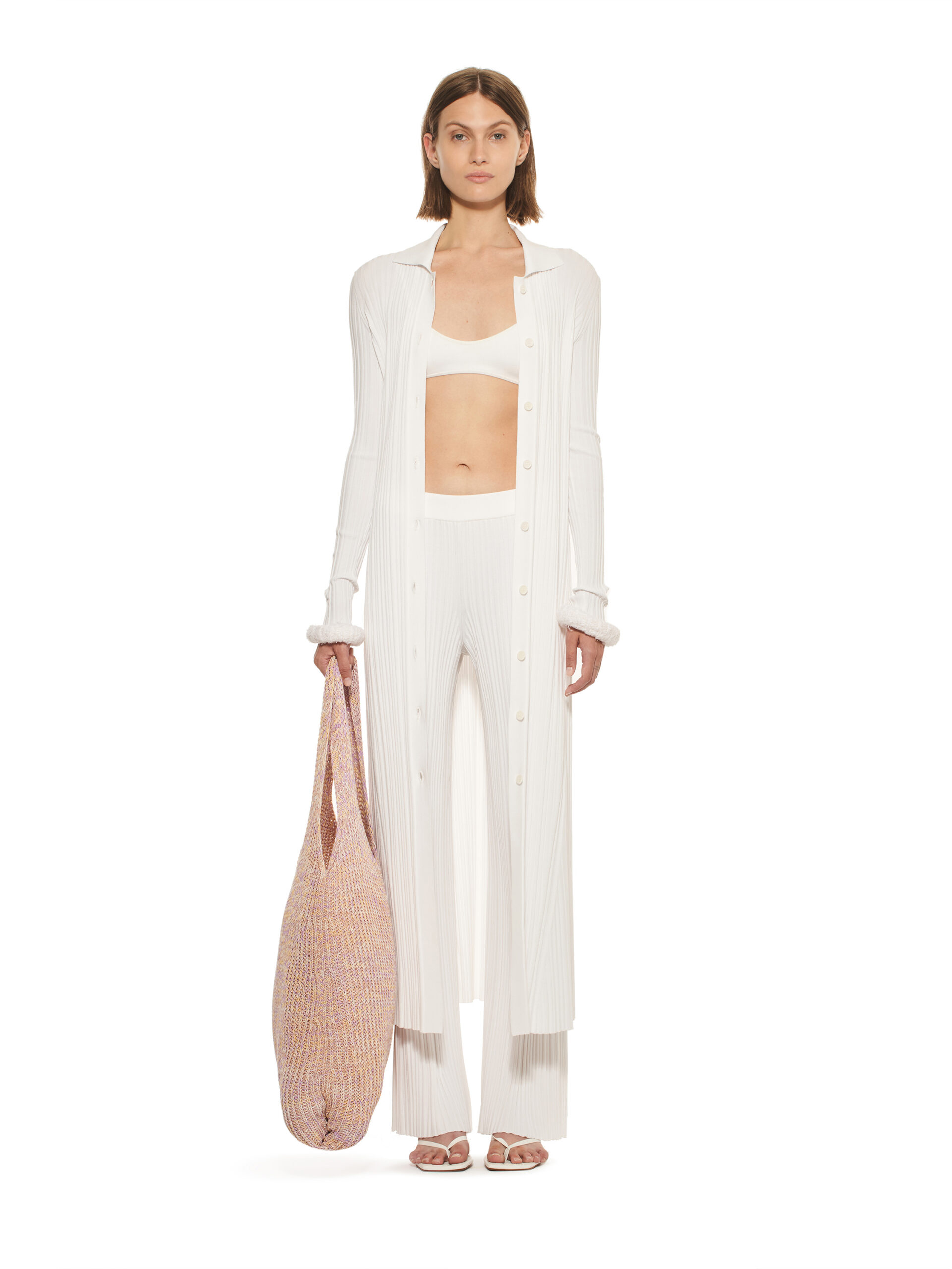 Les robes de la collection glissent sur les corps, offrant légèreté et élégance contemporaine. L’emblématique tailleur en tricot, décliné dans les couleurs de la collection, représente le binôme masculin/féminin de la marque et incarne le style de la femme MRZ. À l’opposé des tailleurs sartoriaux rigides, la collection propose une maille aux aspects matériellement expressifs, interrompant la continuité des surfaces pour créer une tridimensionnalité unique.