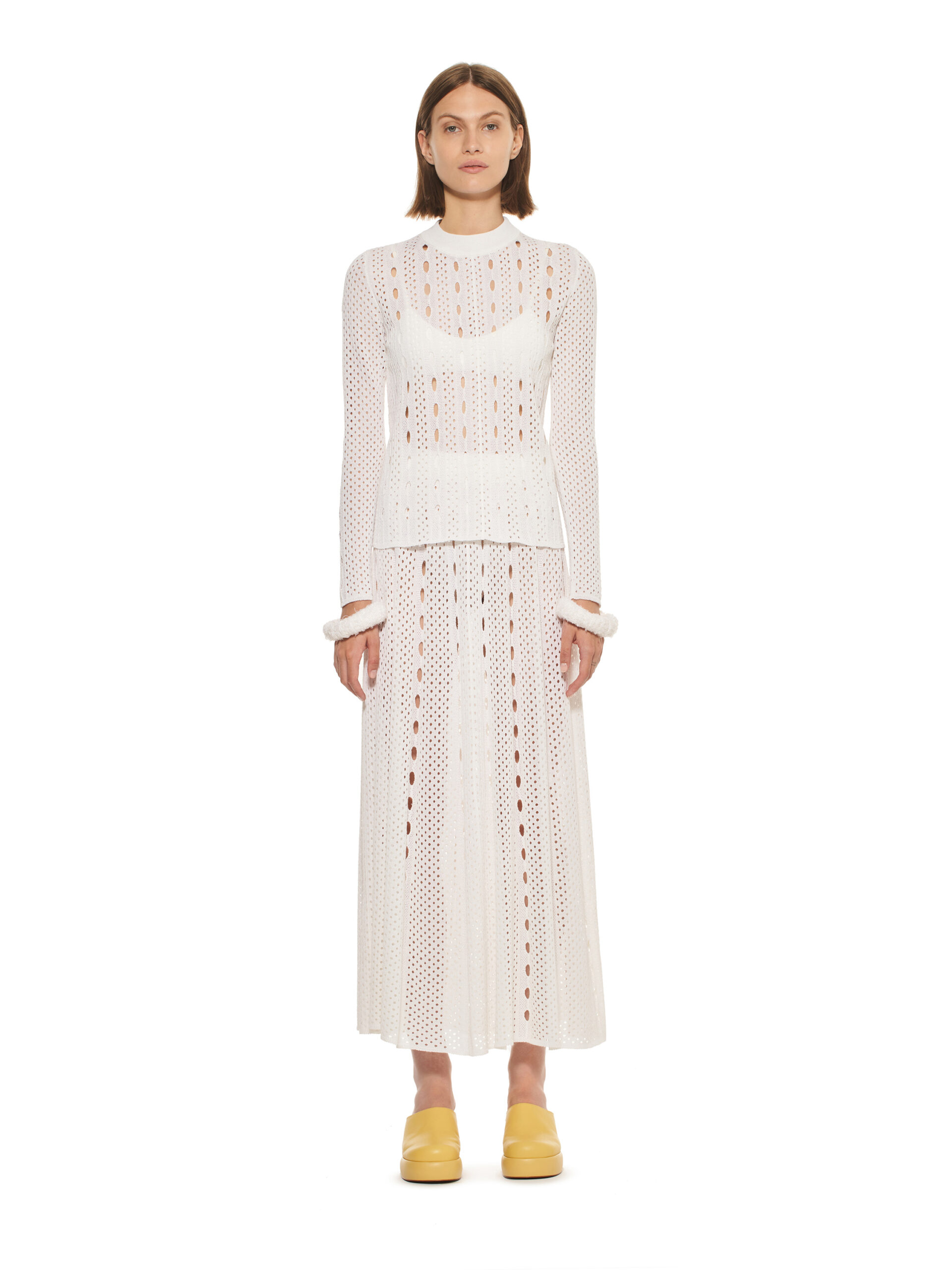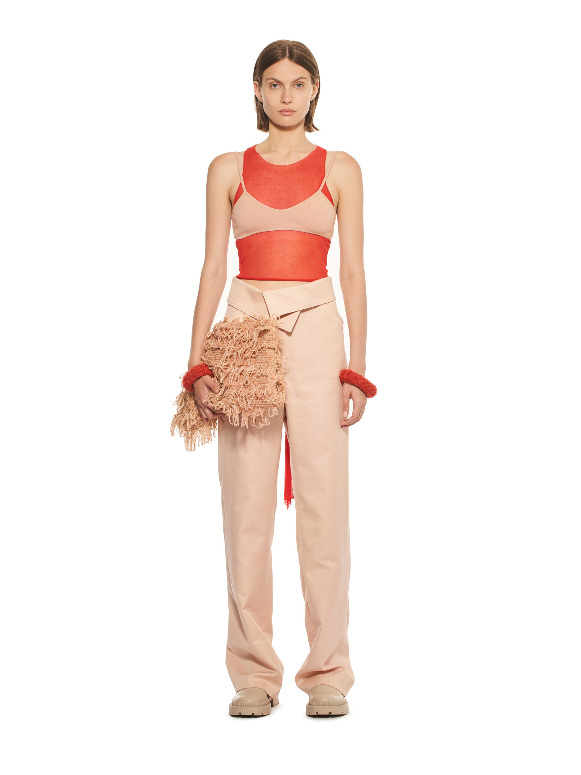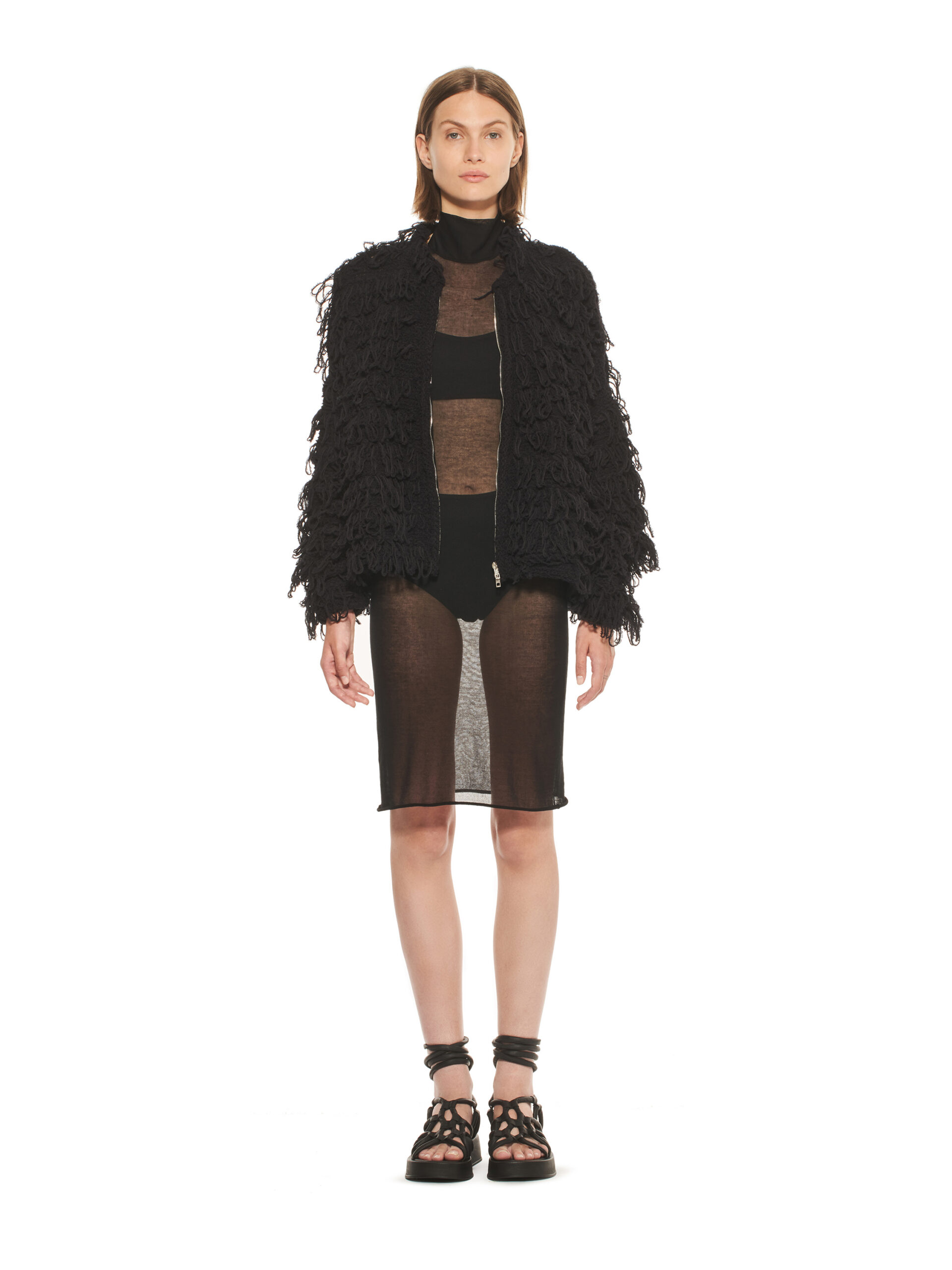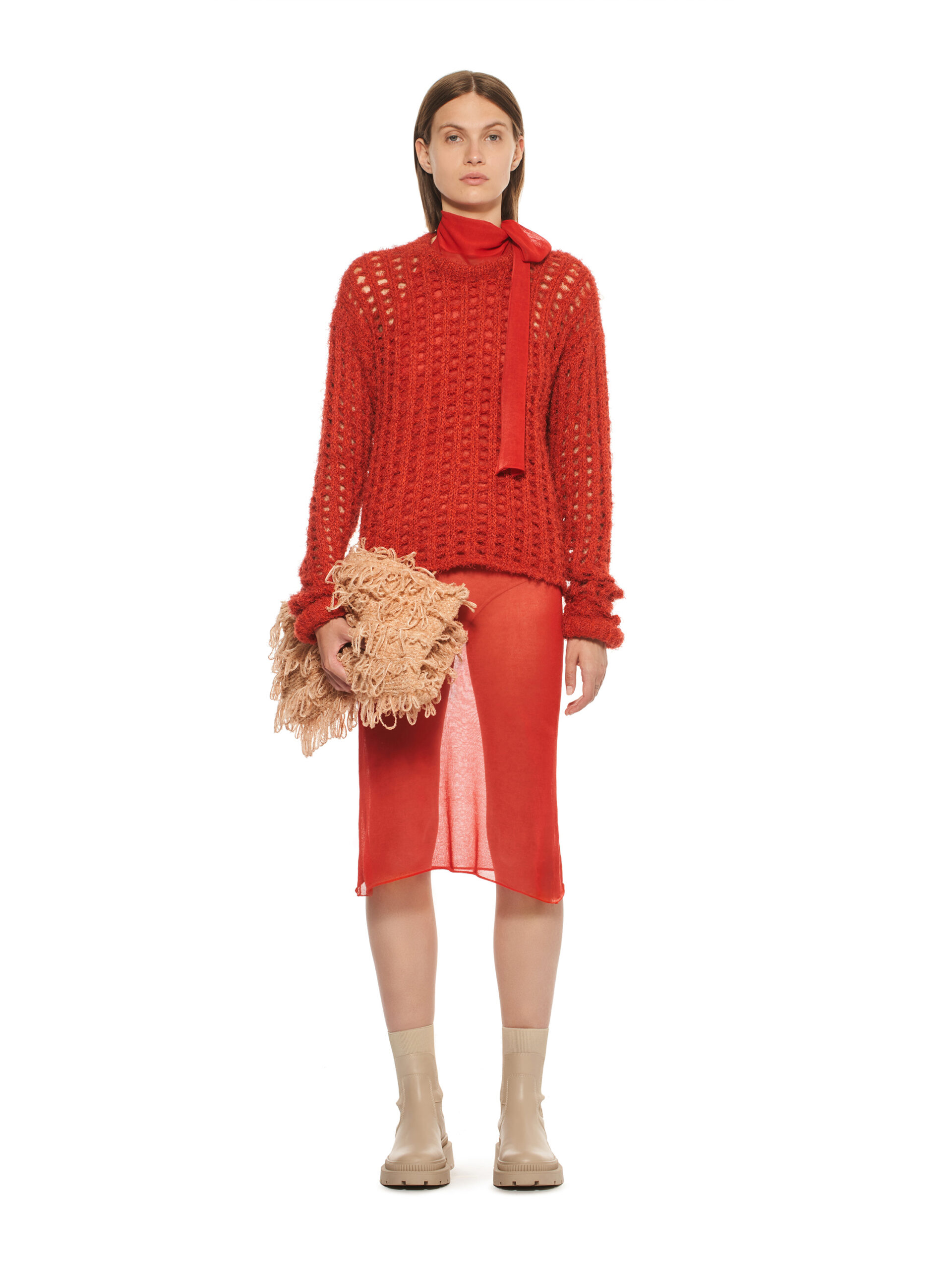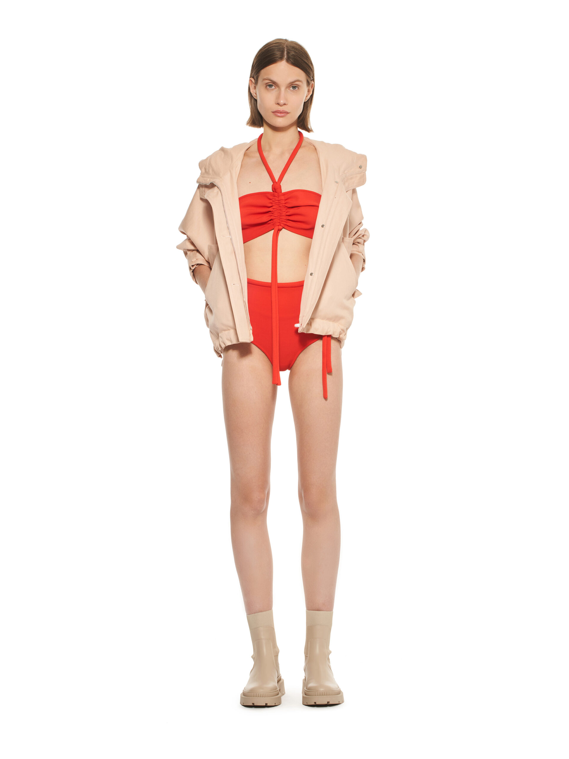 Les robes de la collection glissent sur les corps, offrant légèreté et élégance contemporaine. L’emblématique tailleur en tricot, décliné dans les couleurs de la collection, représente le binôme masculin/féminin de la marque et incarne le style de la femme MRZ. À l’opposé des tailleurs sartoriaux rigides, la collection propose une maille aux aspects matériellement expressifs, interrompant la continuité des surfaces pour créer une tridimensionnalité unique.