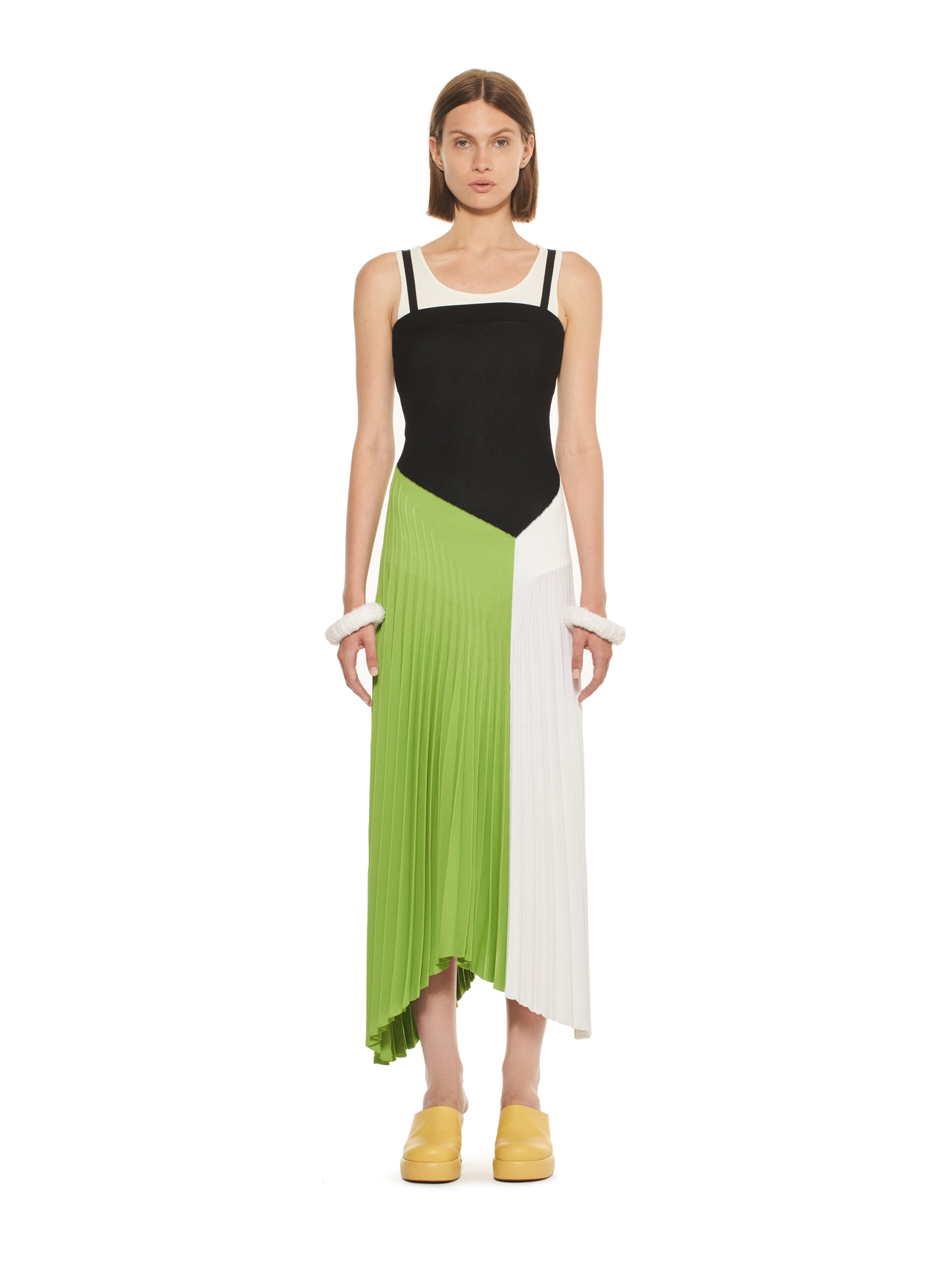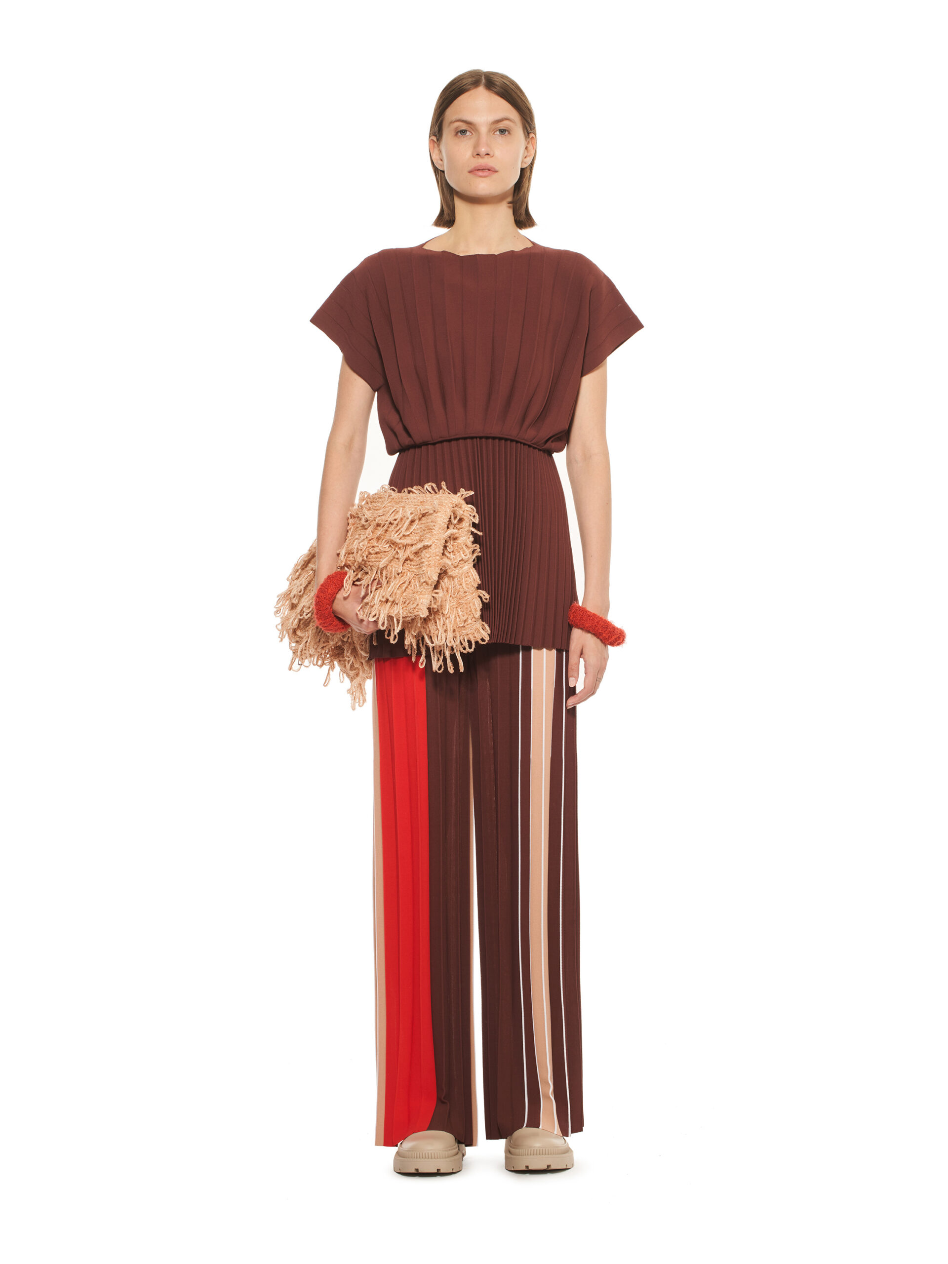 Les designs géométriques, interprétés de manière variée, explorent des séquences et des asymétries élaborées, s’inspirant des œuvres d’Ettore Sottsass. La palette de couleurs de la collection, partant des teintes primaires pour s’étendre à des nuances de blush, de marron et de vert, enrichit l’ensemble, tandis que le noir et le blanc créent un impact graphique fort.