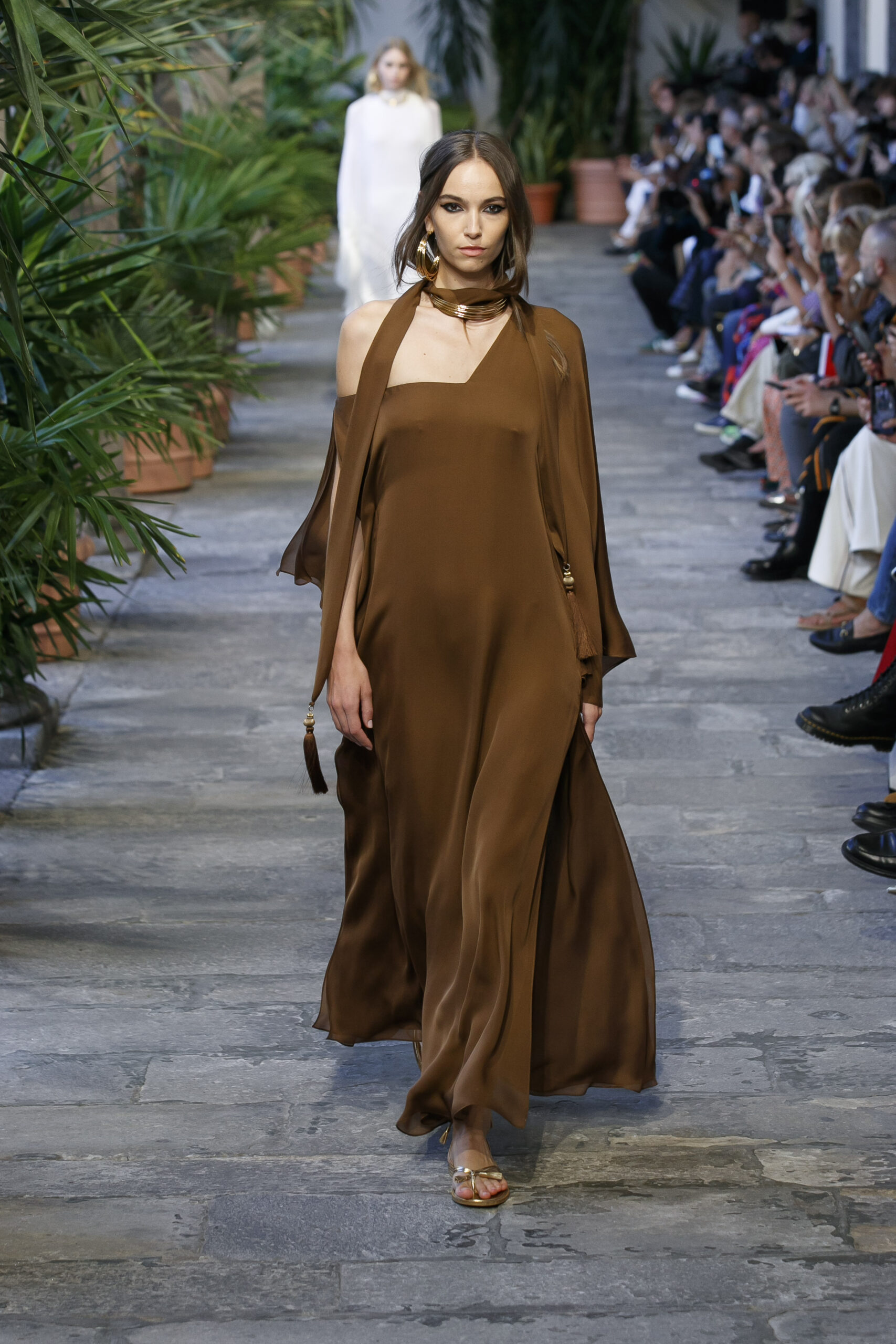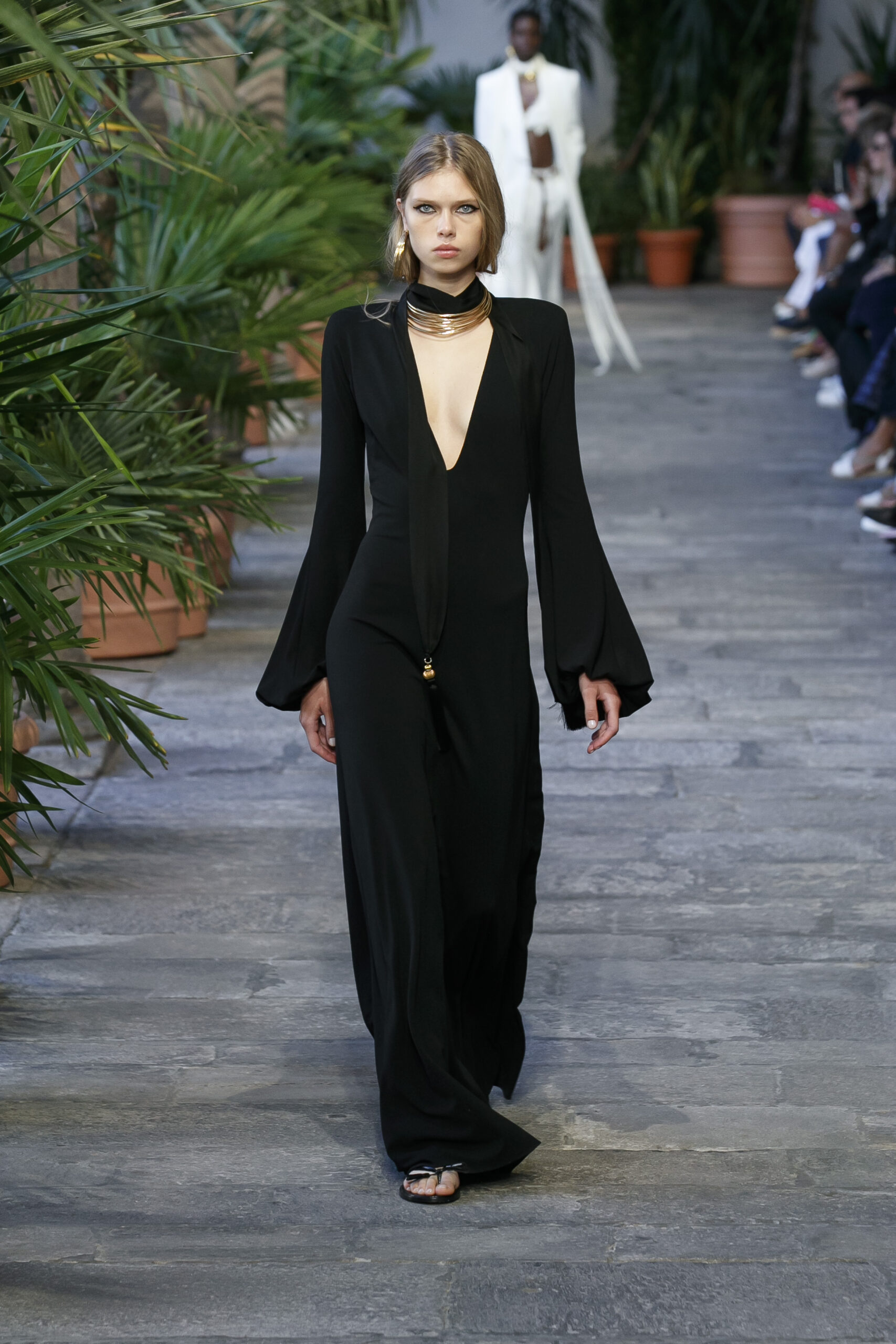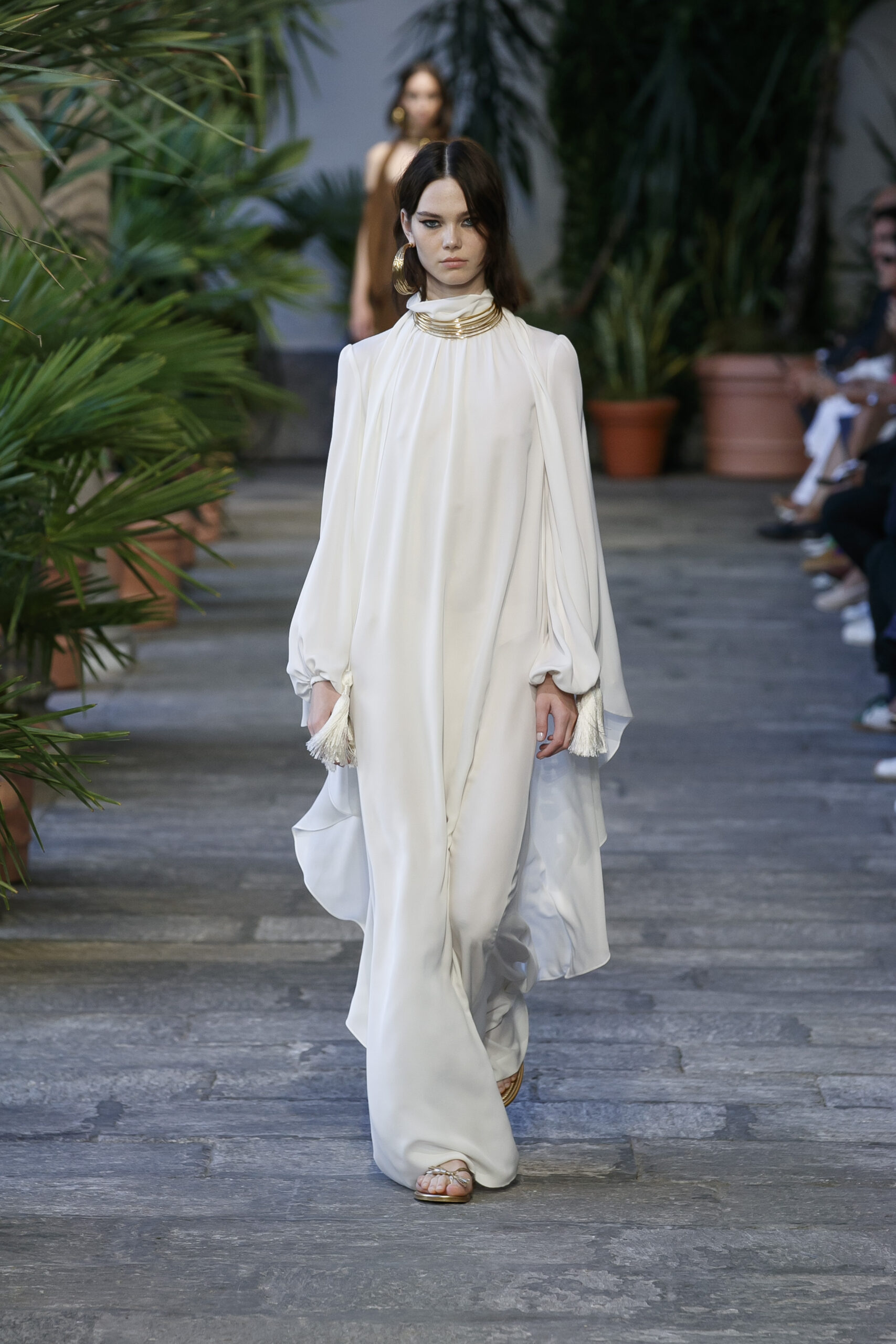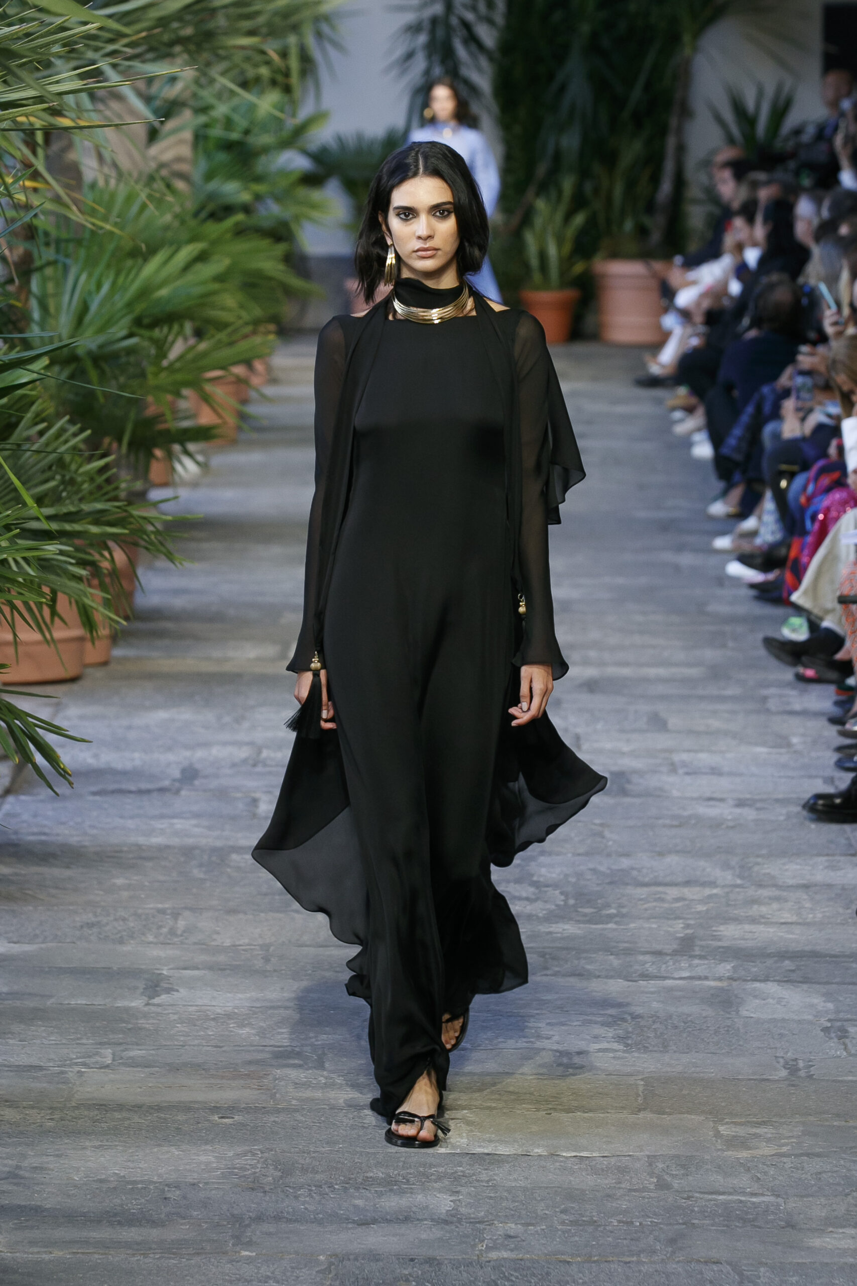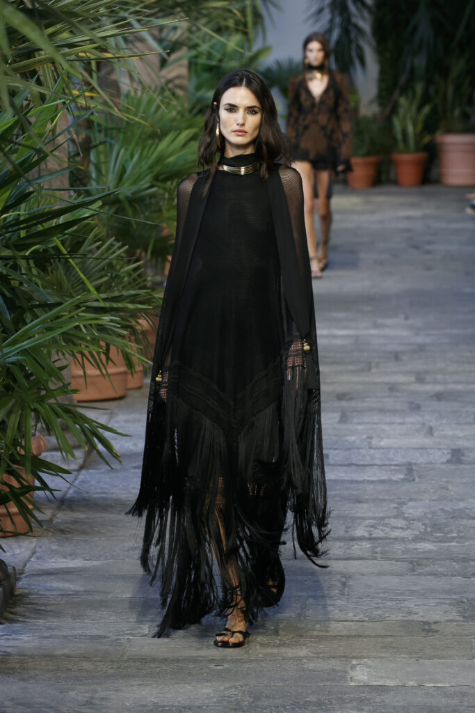 Pour les tenues de soirée, les créations de Luisa Spagnoli prennent un tournant dramatique avec des robes délicates et diaphanes évoquant un charme bohème. Les robes colonnes en georgette blanc ivoire et brun tabac se mêlent à des capes noires transparentes et frangées portées en robes, des hauts romantiques à manches bouffantes et des pièces inspirées de la lingerie.