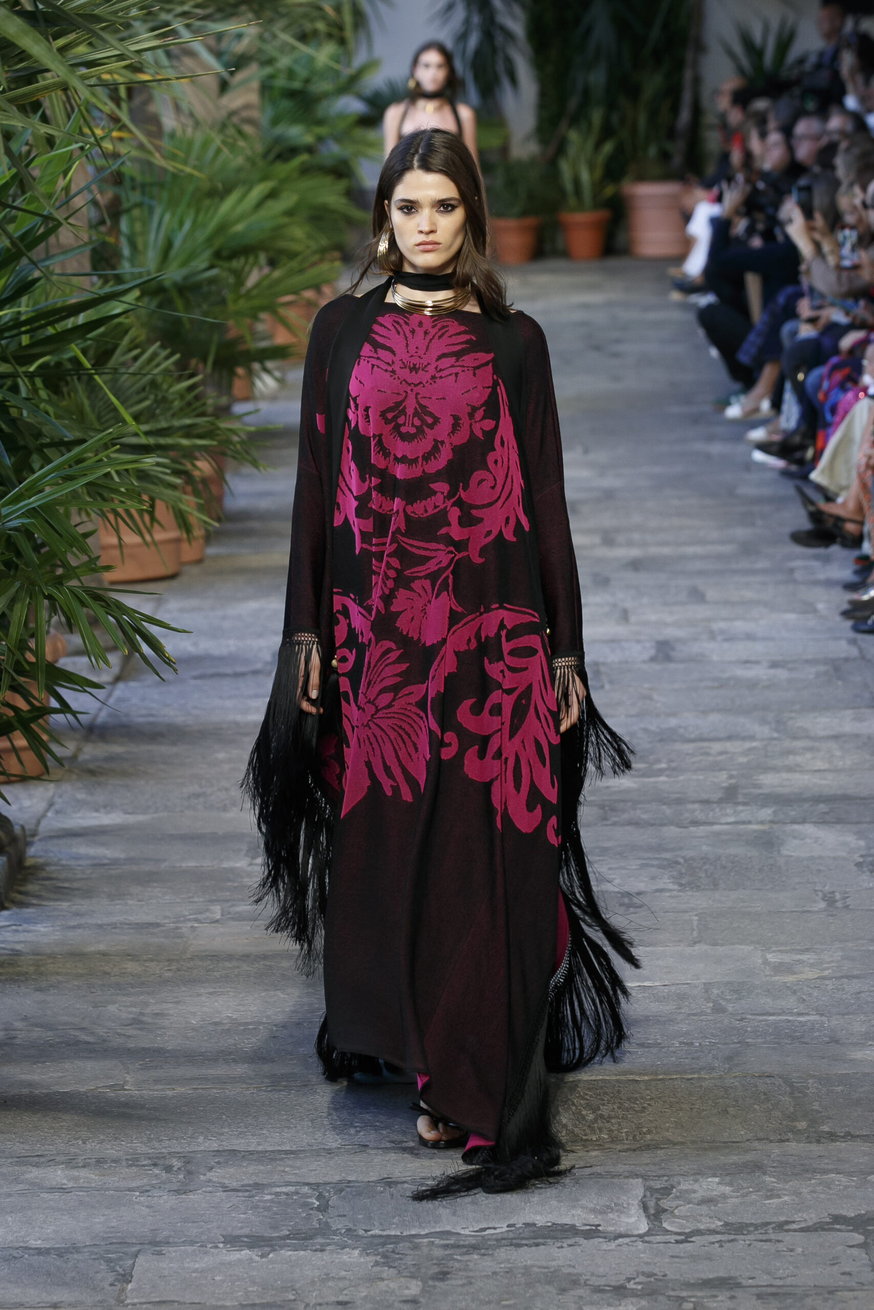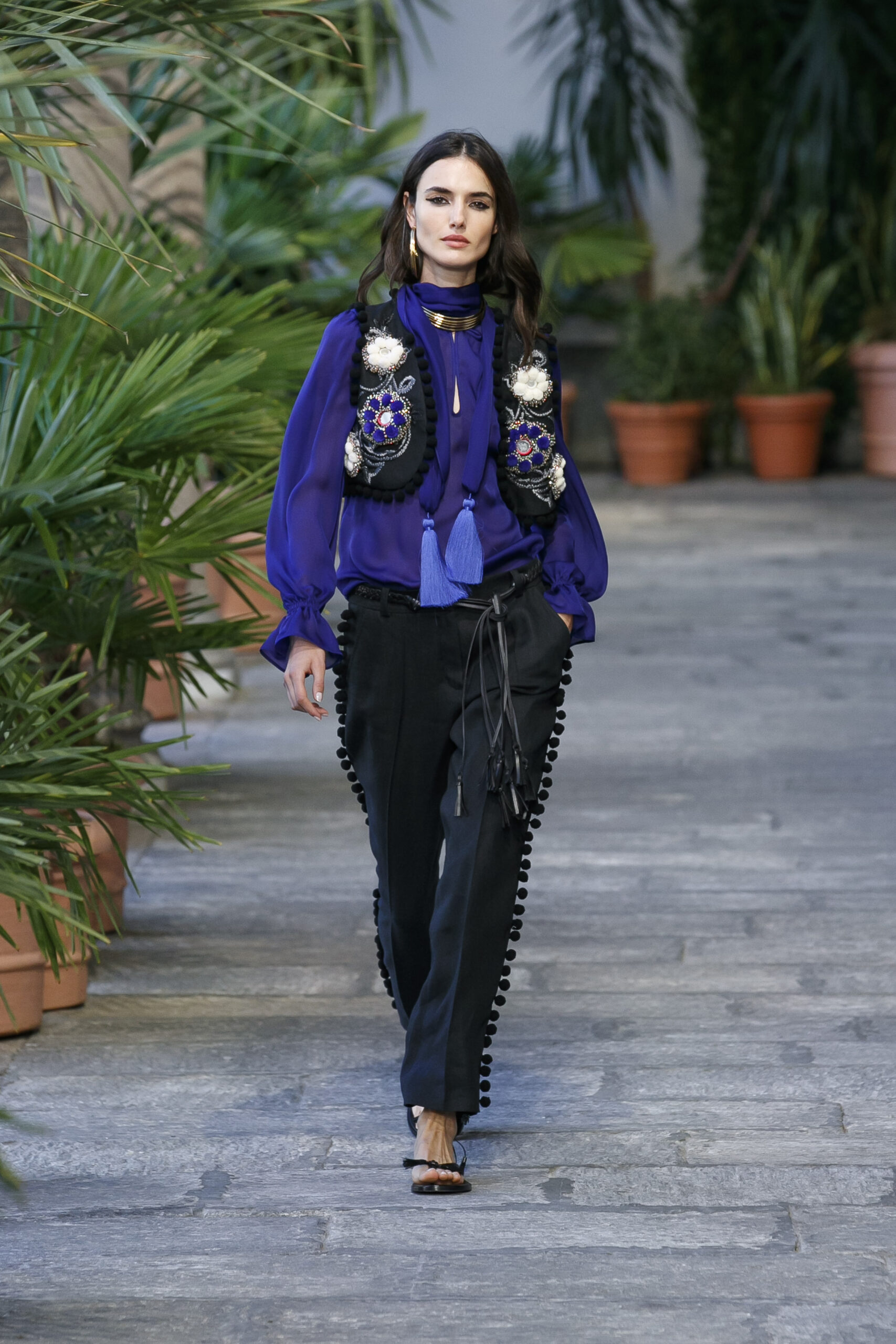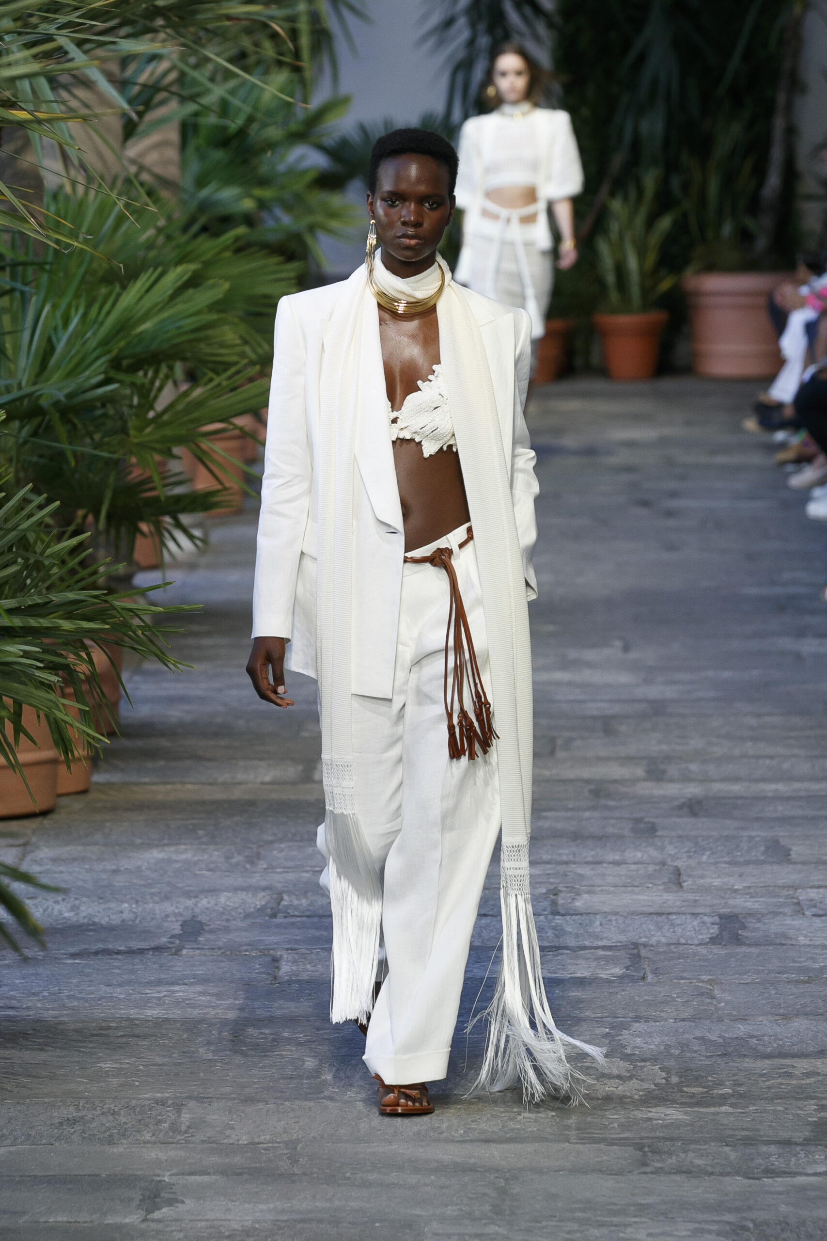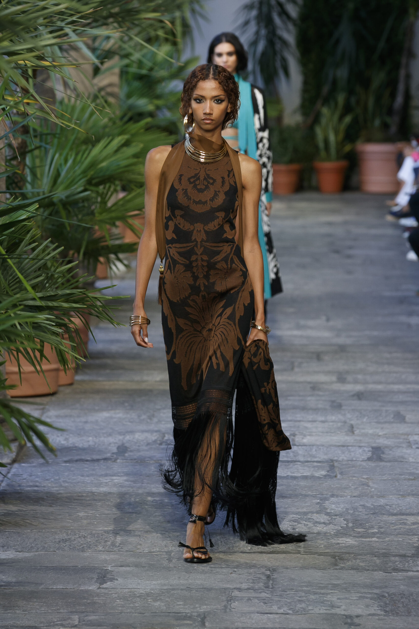 Pour les tenues de soirée, les créations de Luisa Spagnoli prennent un tournant dramatique avec des robes délicates et diaphanes évoquant un charme bohème. Les robes colonnes en georgette blanc ivoire et brun tabac se mêlent à des capes noires transparentes et frangées portées en robes, des hauts romantiques à manches bouffantes et des pièces inspirées de la lingerie.