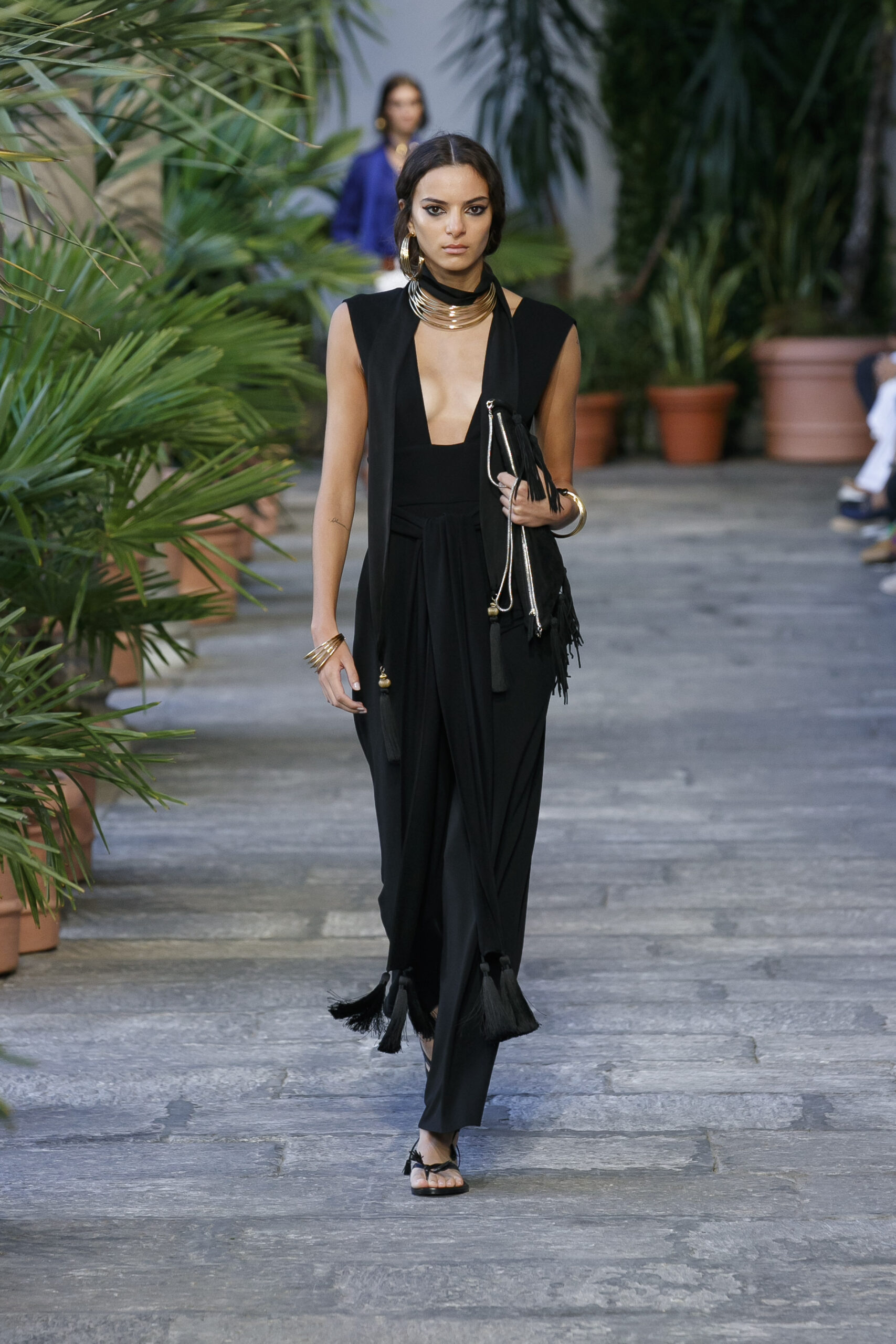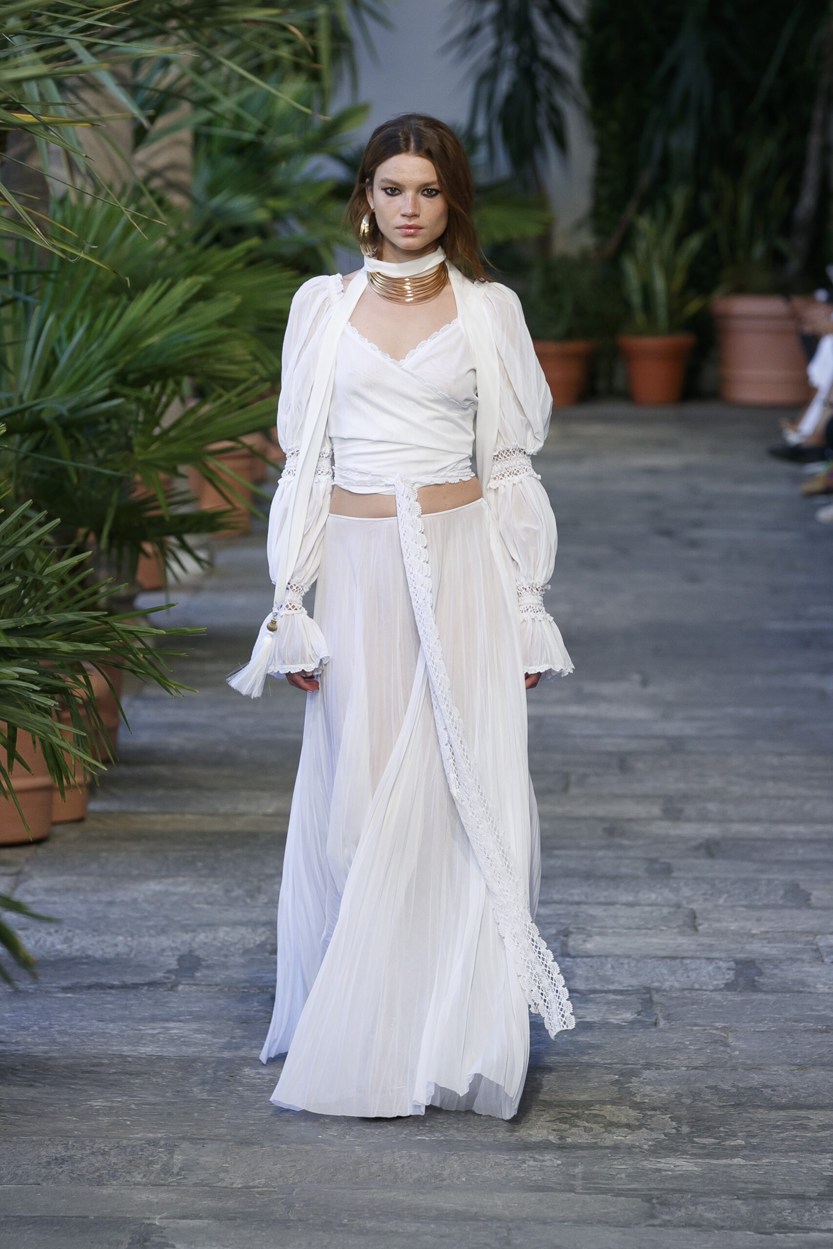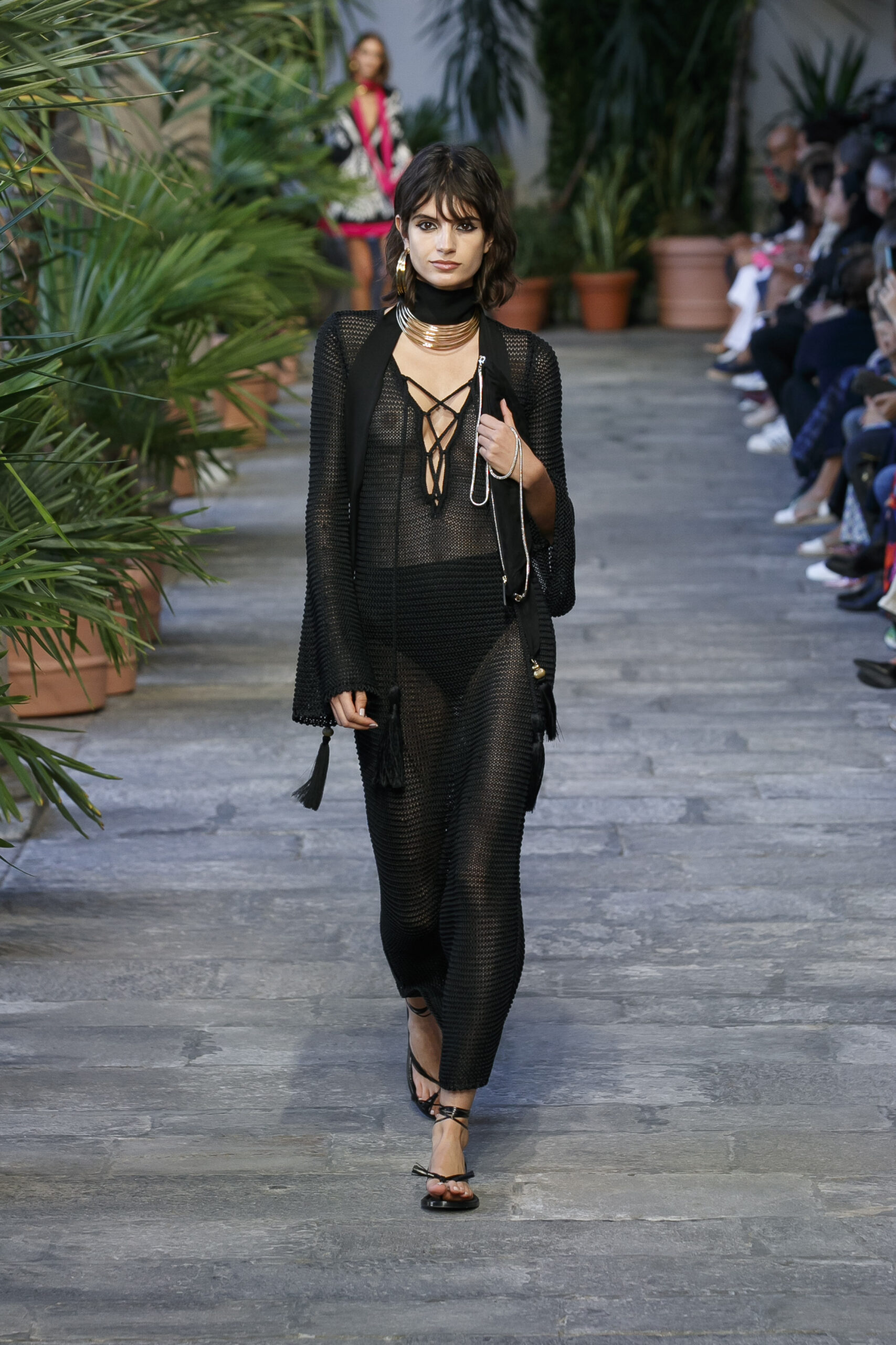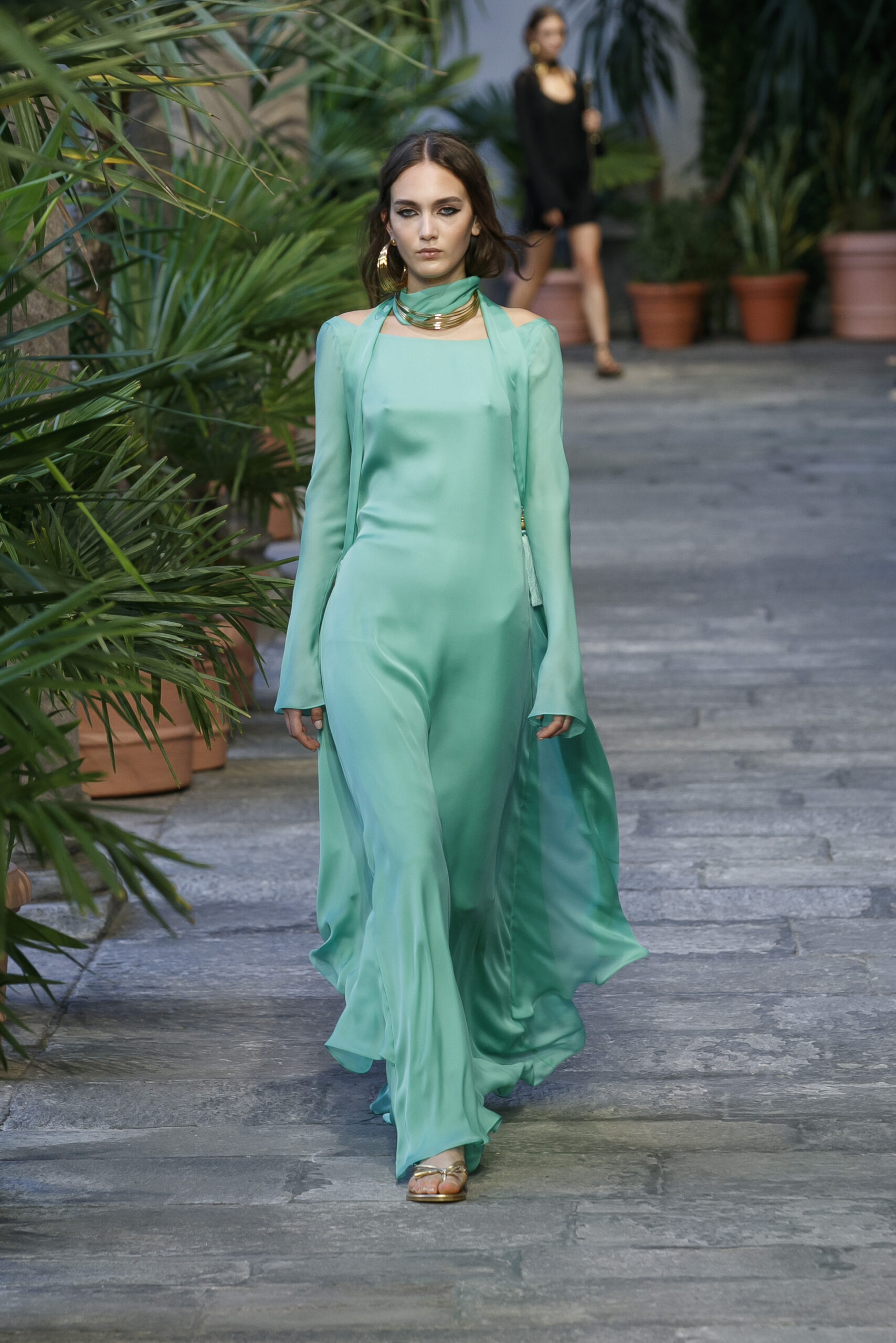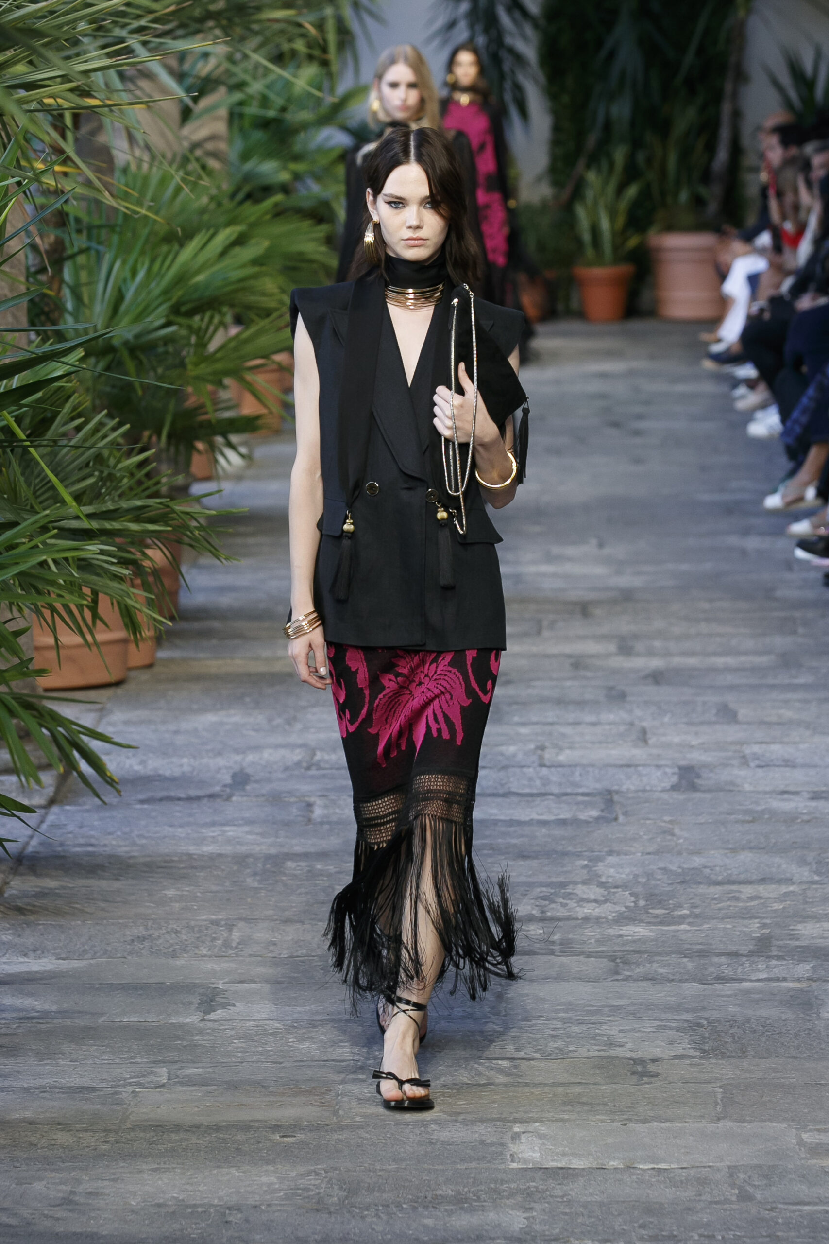 Pour les tenues de soirée, les créations de Luisa Spagnoli prennent un tournant dramatique avec des robes délicates et diaphanes évoquant un charme bohème. Les robes colonnes en georgette blanc ivoire et brun tabac se mêlent à des capes noires transparentes et frangées portées en robes, des hauts romantiques à manches bouffantes et des pièces inspirées de la lingerie.