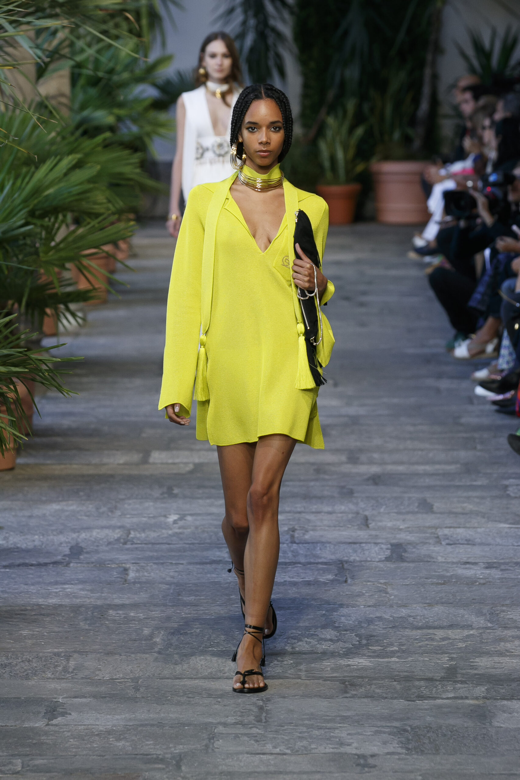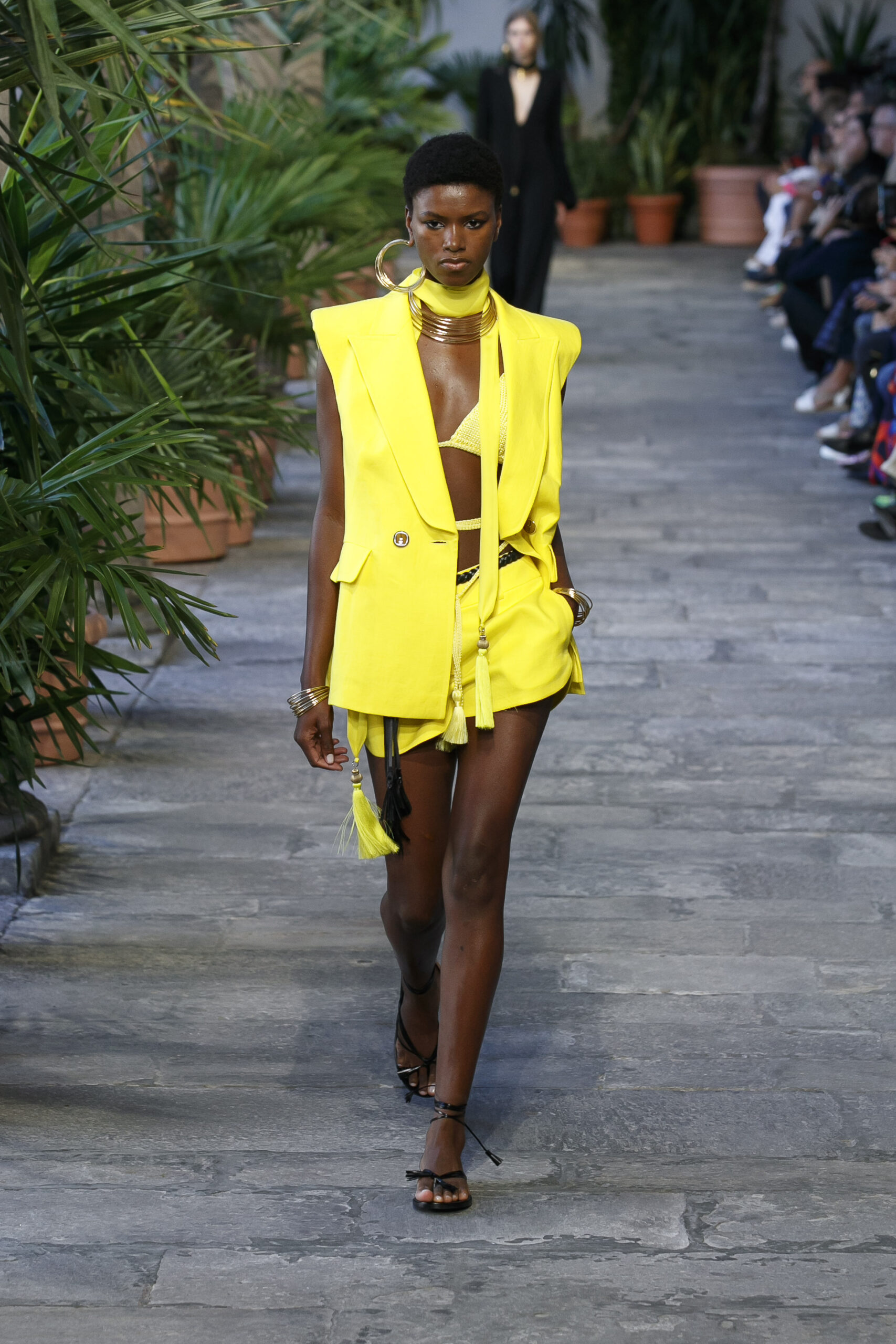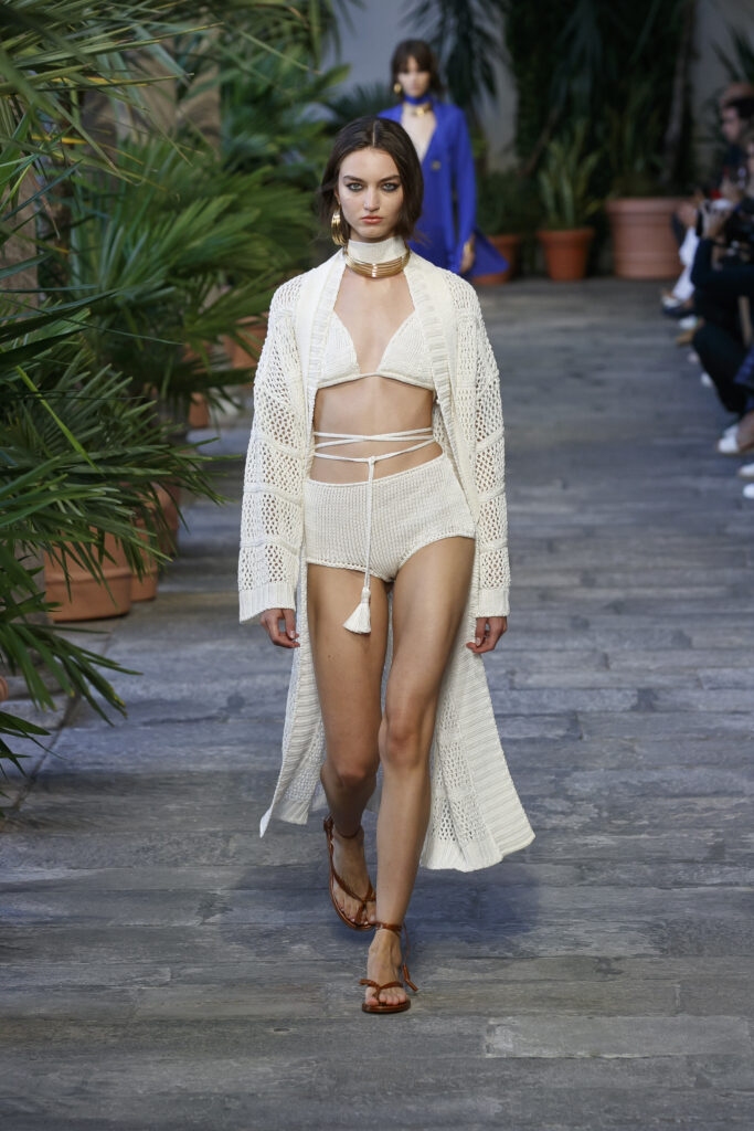 Les pièces phares de la collection comprennent des mini-robes tuniques en tricot avec des motifs jacquard floraux, assorties à des écharpes pour le cou et de joyeux pompons. Pour la vie citadine, des blazers tuxedo à coupe ample sont associés à des pièces inspirées des vacances. Des gilets dans des couleurs vives comme le jaune tournesol et le turquoise sont assortis à des micro-shorts, définissant le look business de la saison.