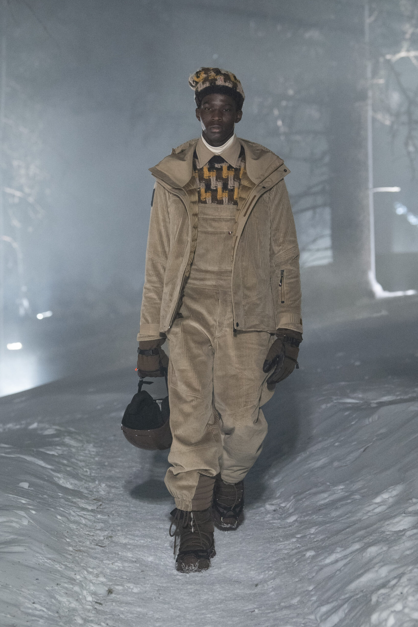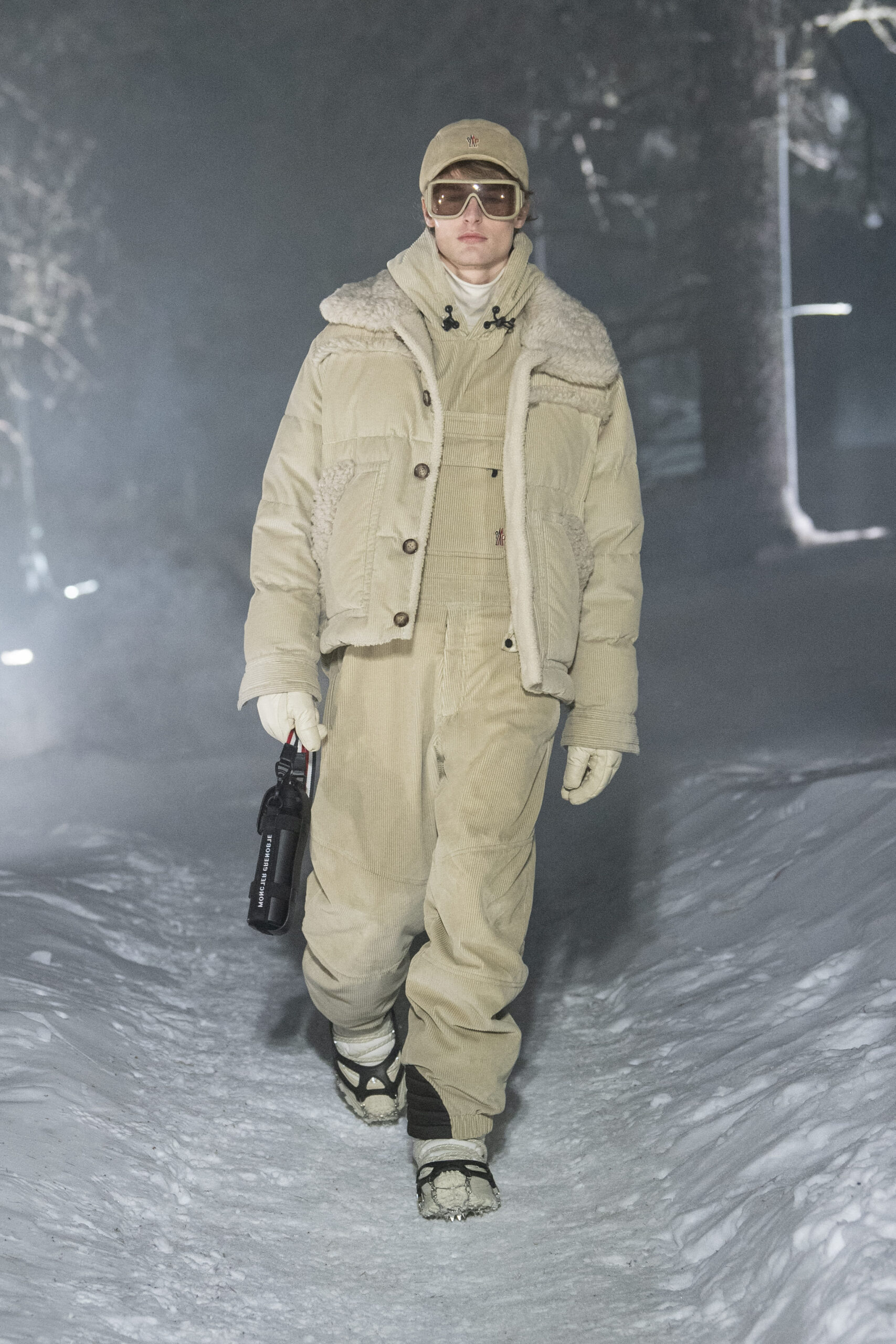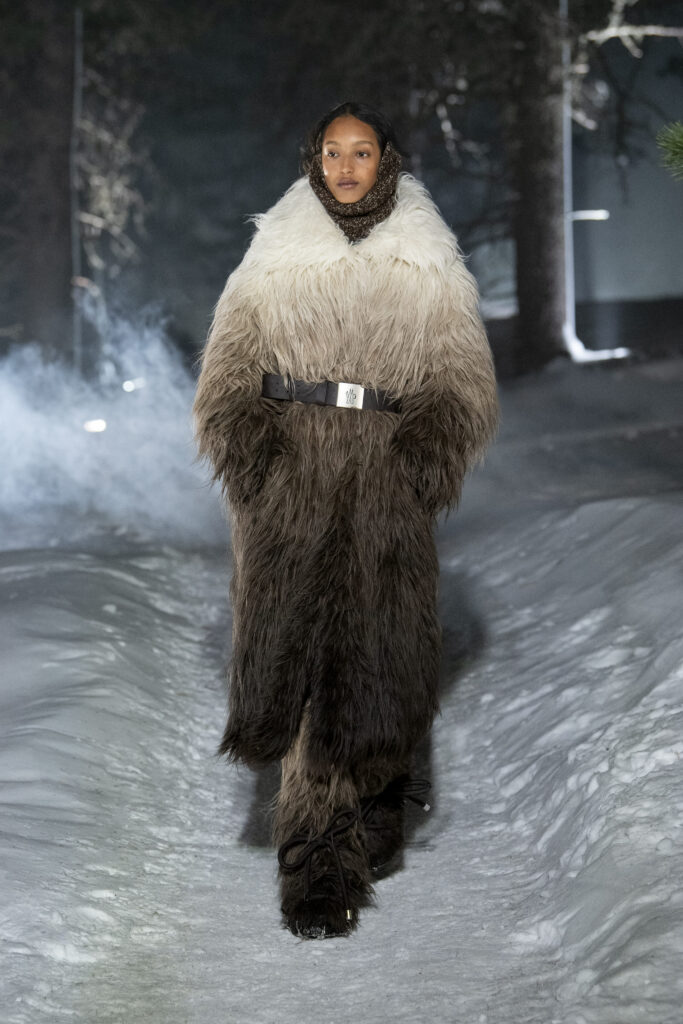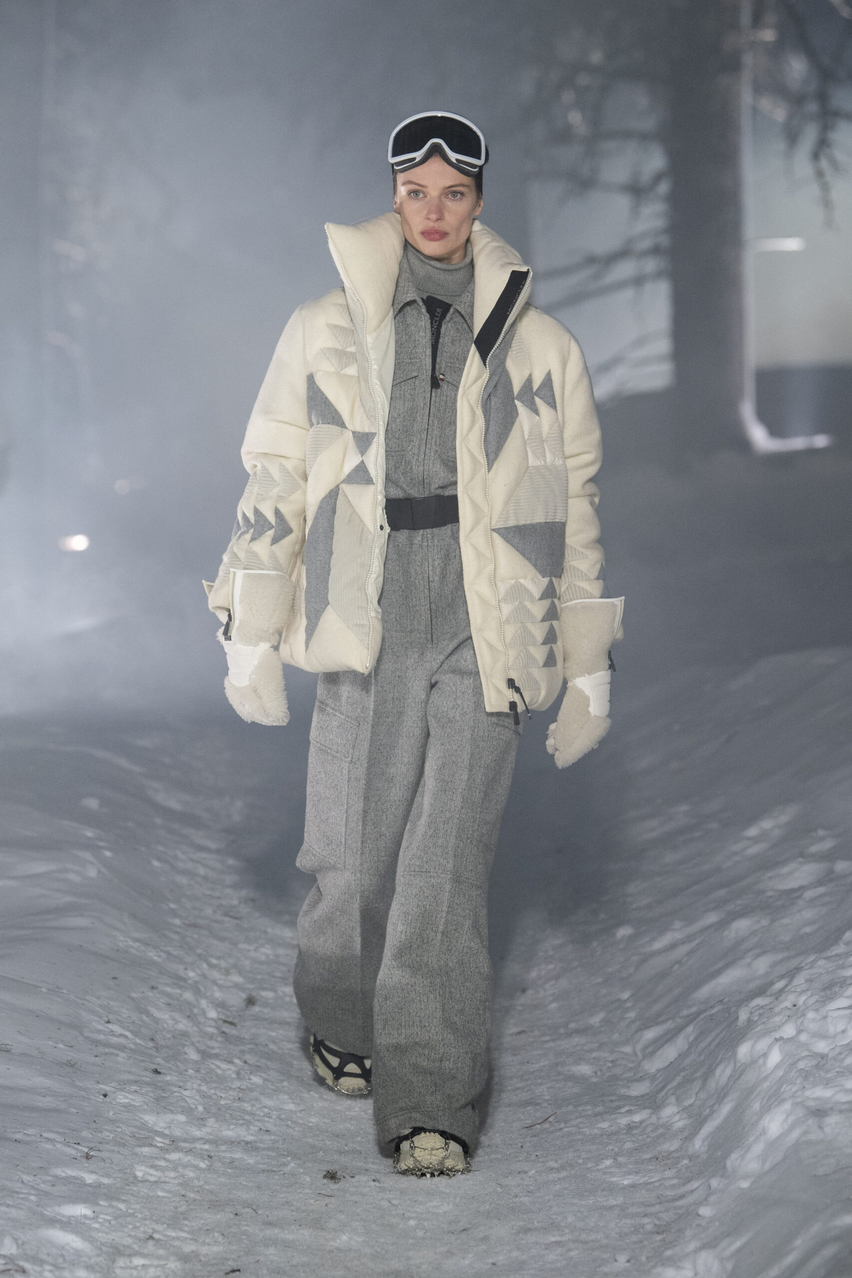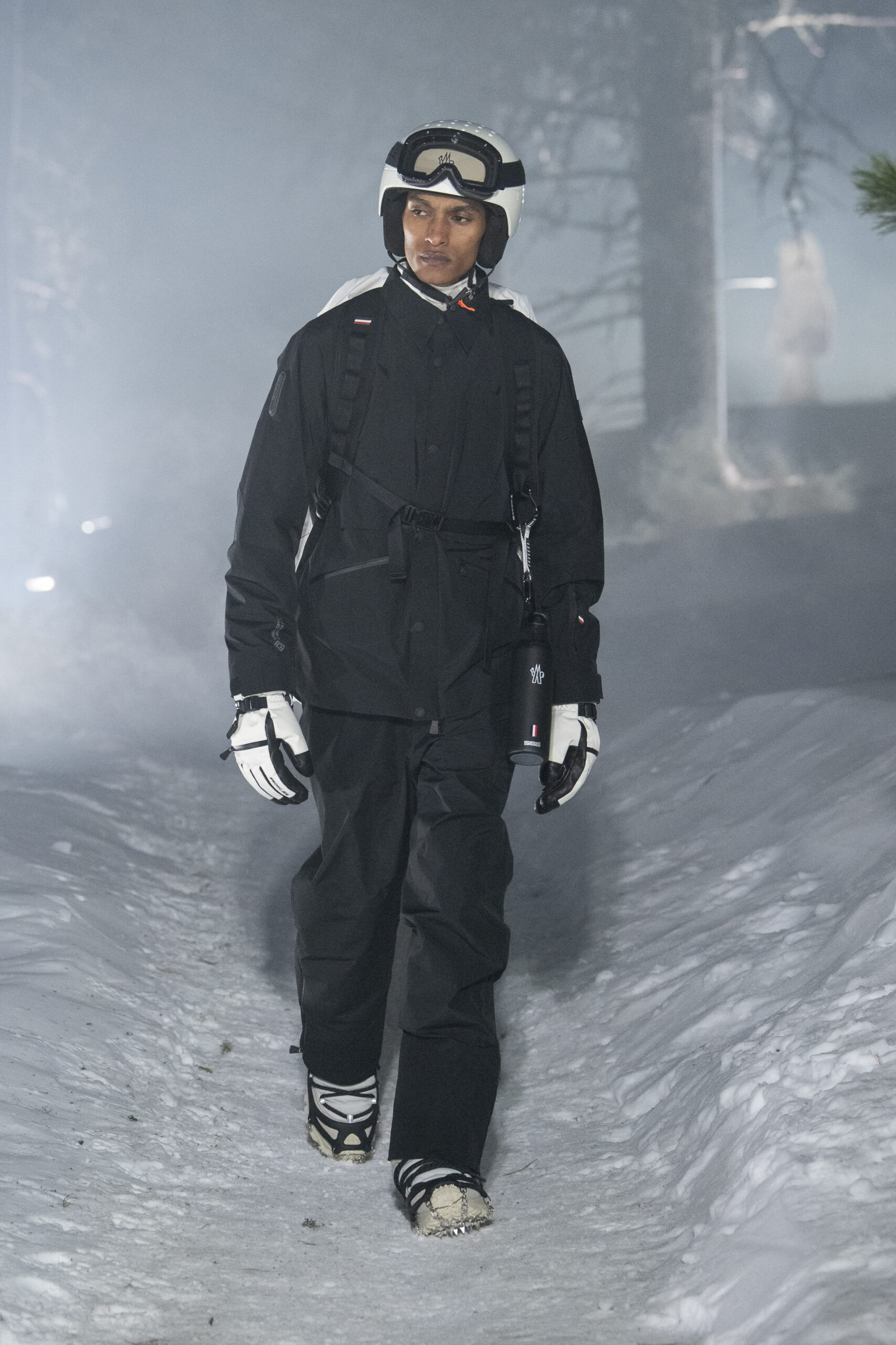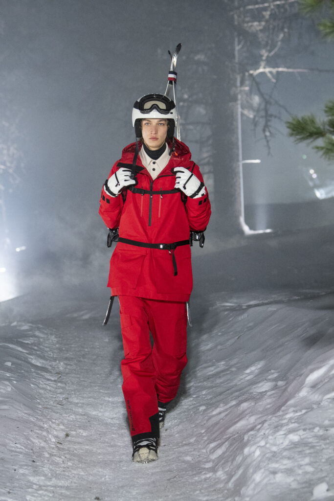 La collection elle-même est une célébration de l’harmonie entre l’homme et la nature, avec une palette de couleurs évoquant les nuances de la montagne, du blanc neige au vert profond des forêts alpines, en passant par le noir de la nuit montagnarde, sans oublier les coloris signature de Moncler. L’utilisation de matières innovantes et la réinvention des silhouettes traditionnelles, comme les duvets transformés en maille ou les chemises devenues vestes de ski, démontrent une recherche constante de l’innovation.